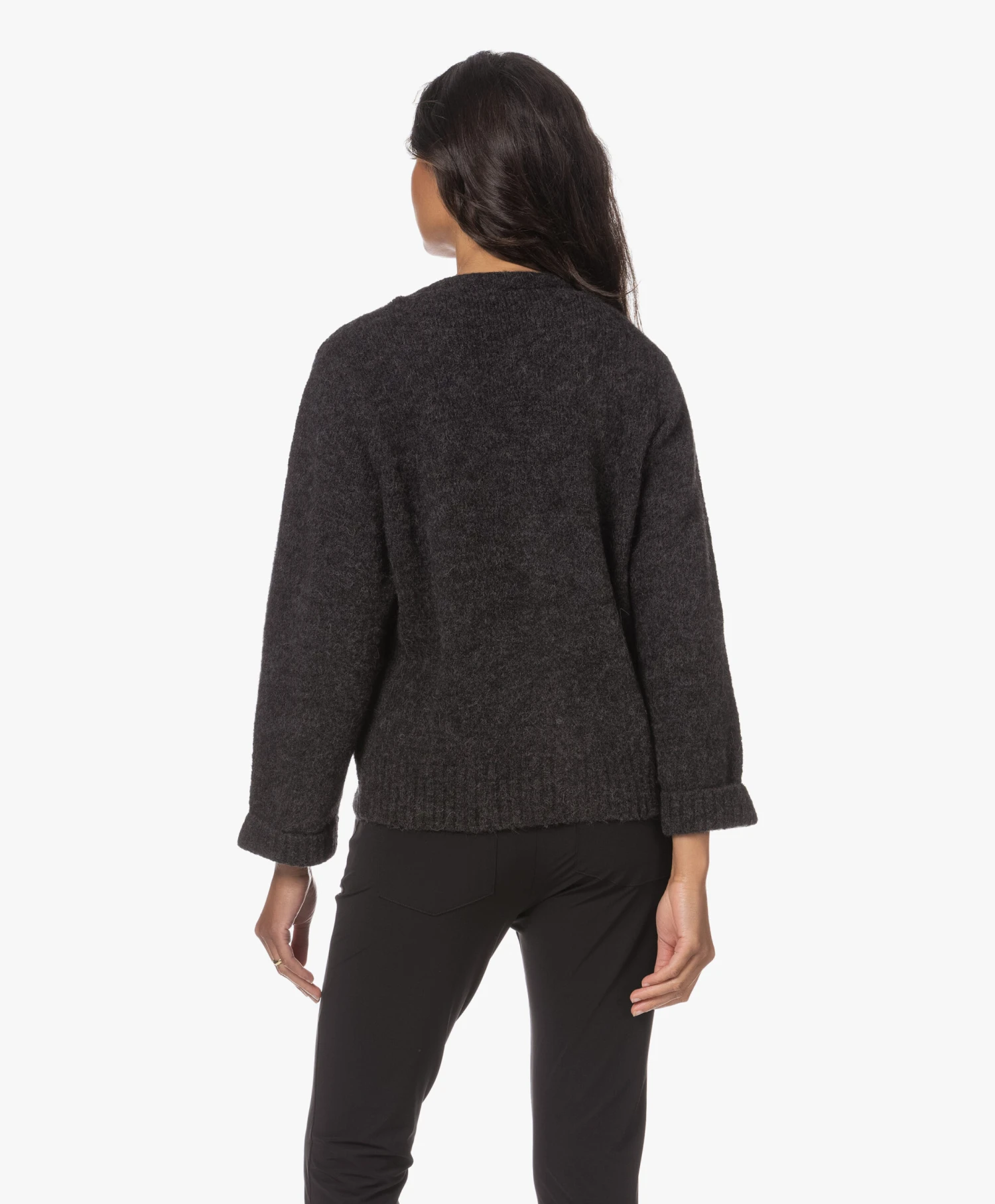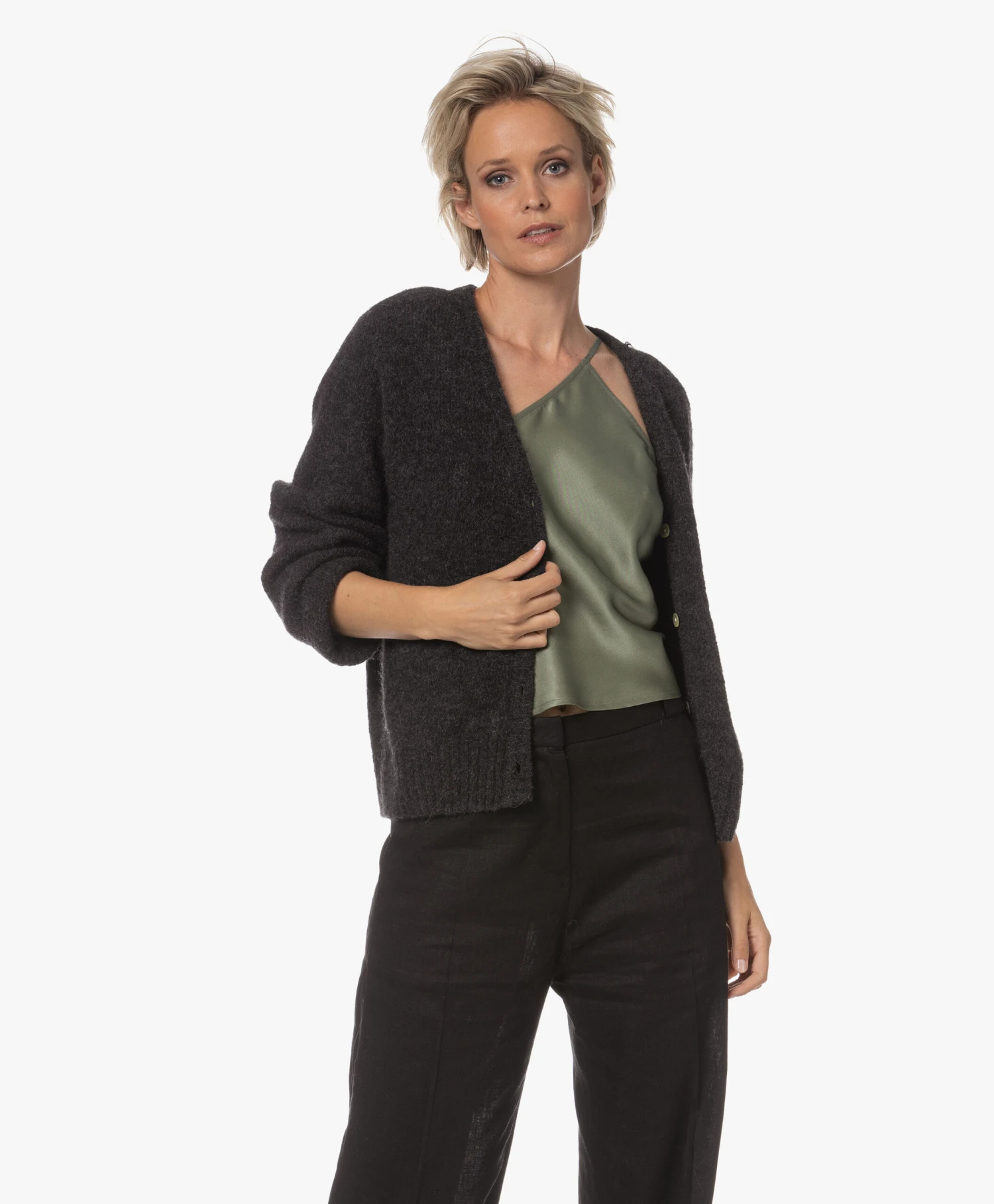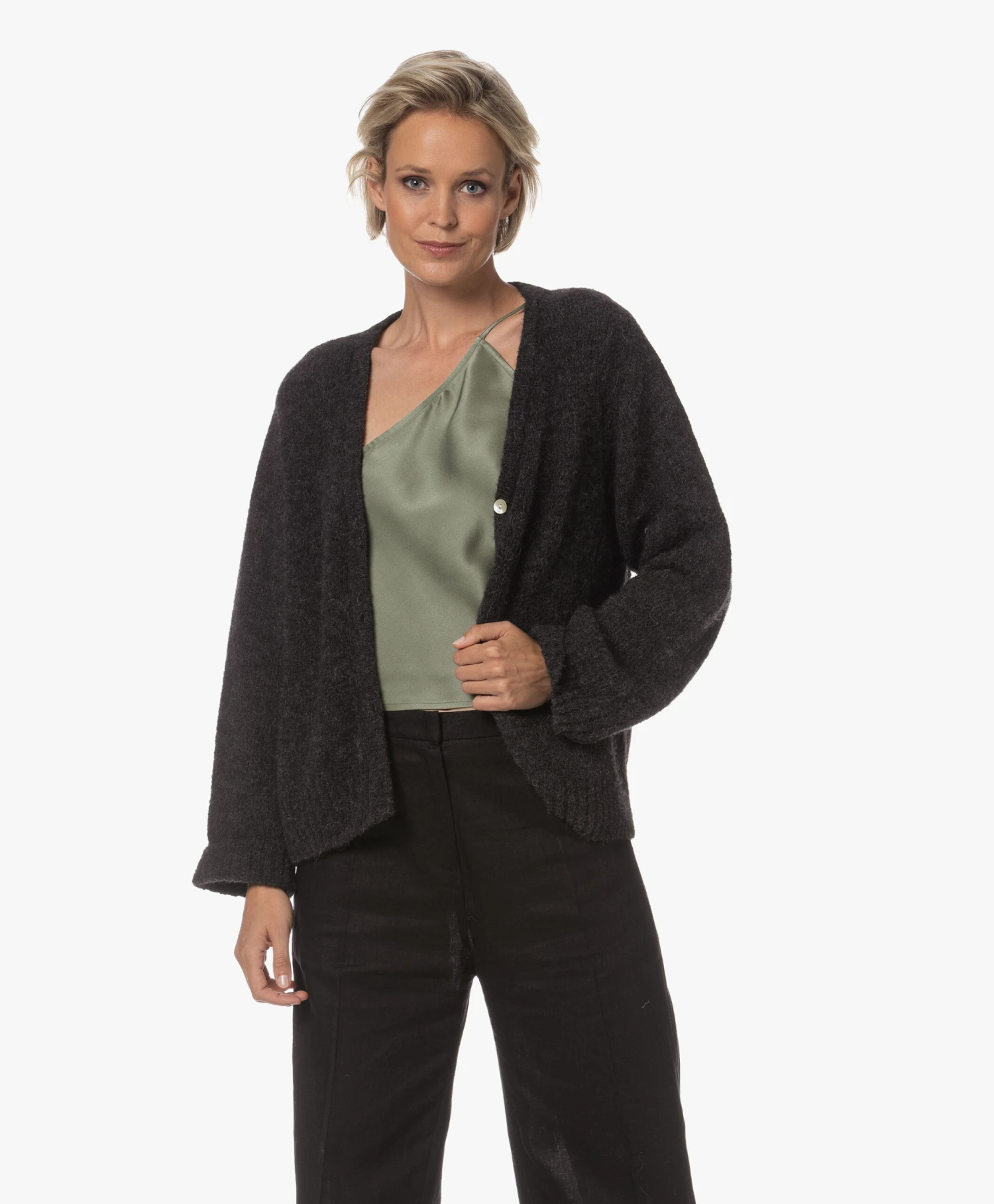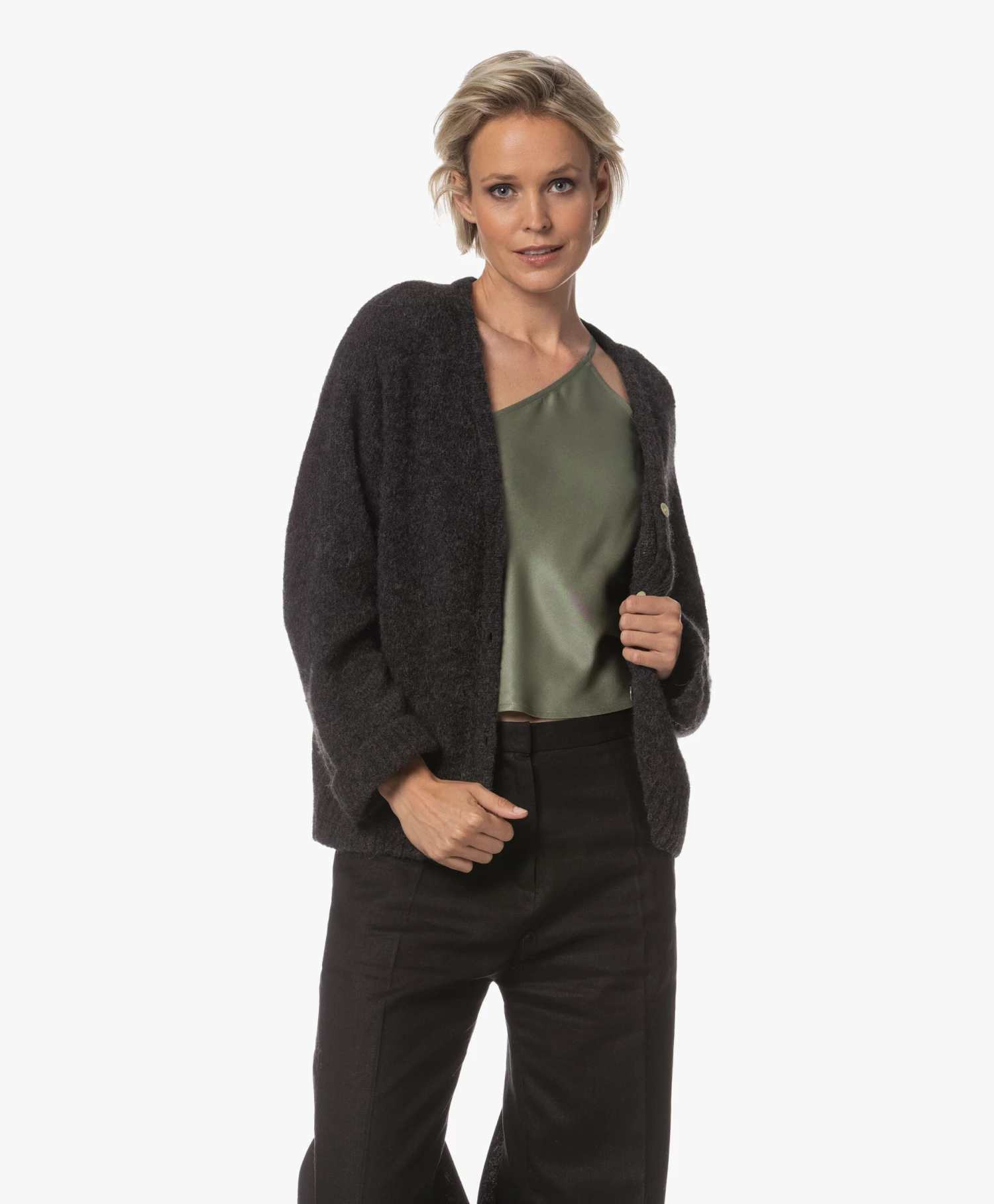 American Vintage komt wederom met een eigentijdse versie van een klassieker op knitwear gebied: het doorknoopvest. Vest East is gebreid van een ultra-zacht alpacamix garen met een gemêleerde optiek in een donkergrijze kleur. Het silhouet is relaxed en heeft iets verlaagde schoudernaden, maar is tegelijkertijd vrij klassiek gehouden.
