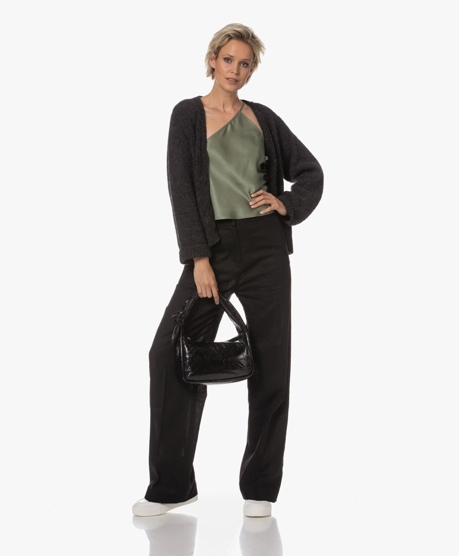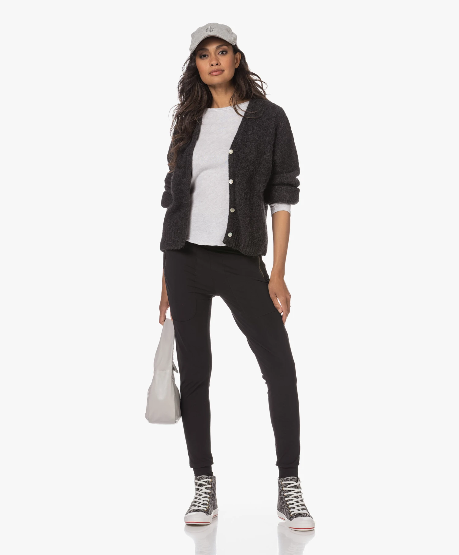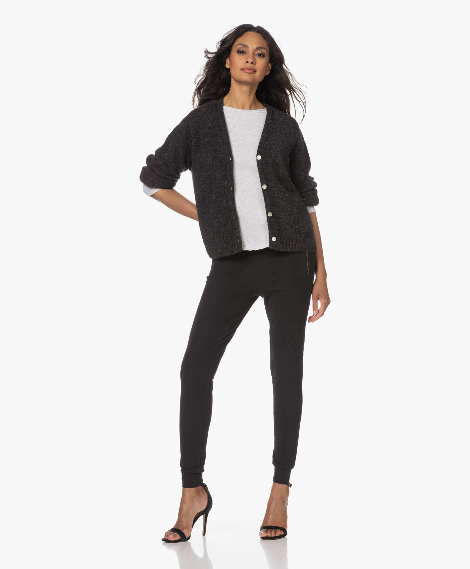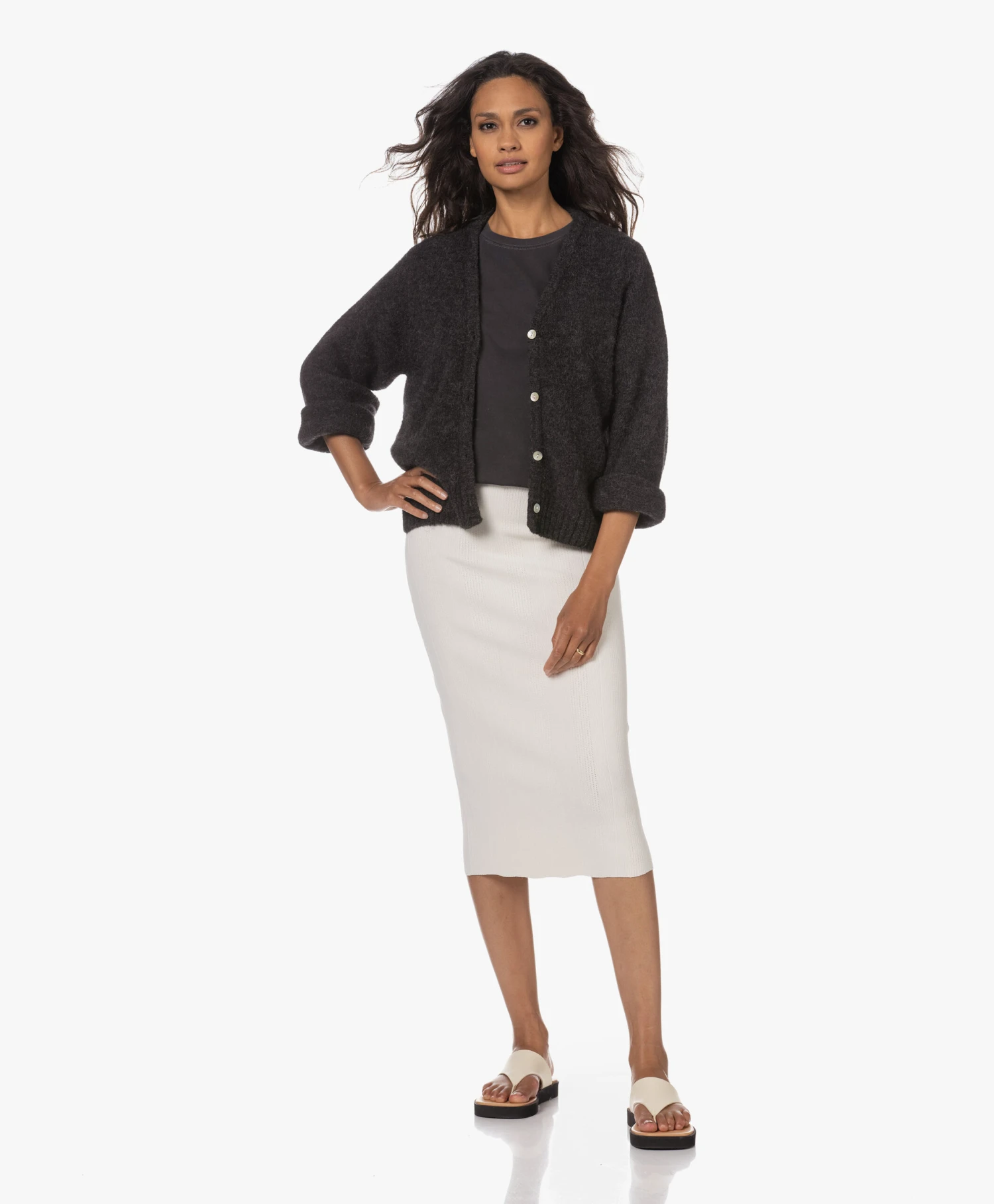 American Vintage komt wederom met een eigentijdse versie van een klassieker op knitwear gebied: het doorknoopvest. Vest East is gebreid van een ultra-zacht alpacamix garen met een gemêleerde optiek in een donkergrijze kleur. Het silhouet is relaxed en heeft iets verlaagde schoudernaden, maar is tegelijkertijd vrij klassiek gehouden.