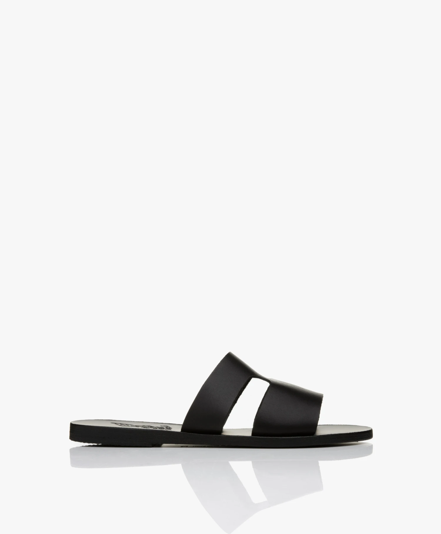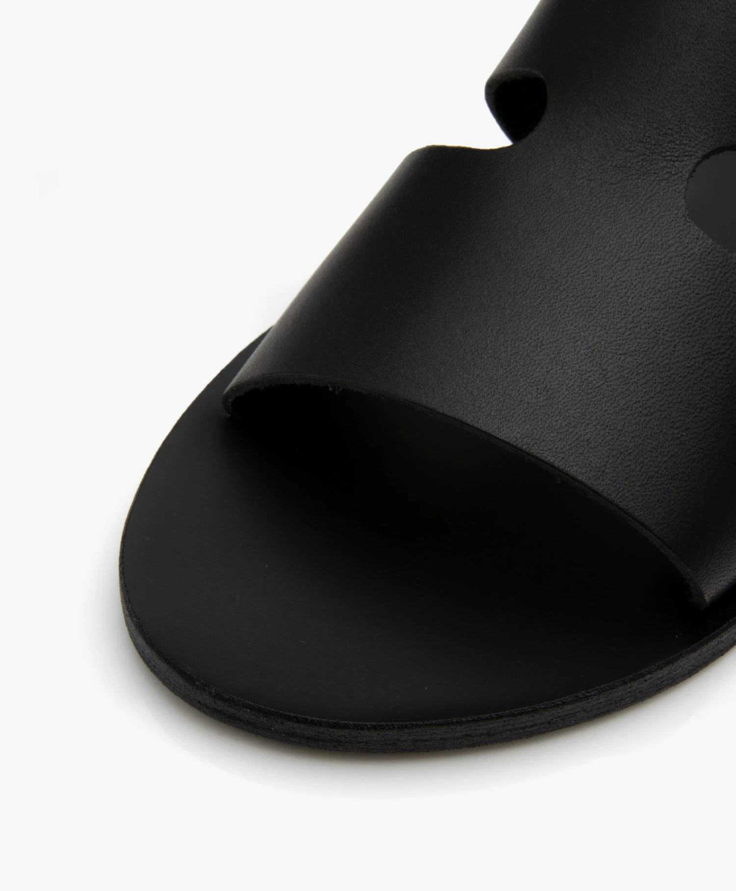 Ancient Greek Sandals’ zwarte Apteros slippers vallen op door het stijlvolle ontwerp met brede cut-out wreefband. Een slipper met een comfortabele platte zool, gemaakt van stevig leer: de ideale, neutrale en toch subtiel opvallende aanwinst voor je collectie zomerschoenen. De gelaagde leren buitenzool is voorzien van antisliprubber onder de hiel.