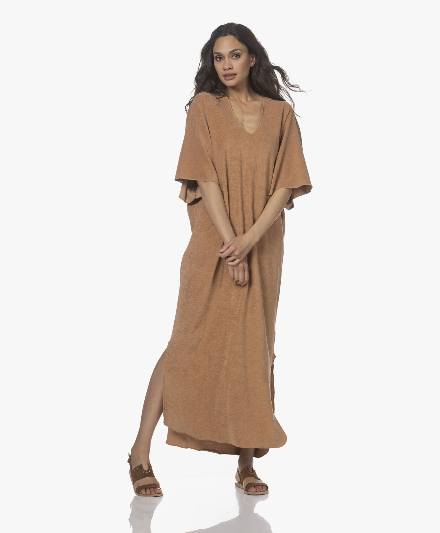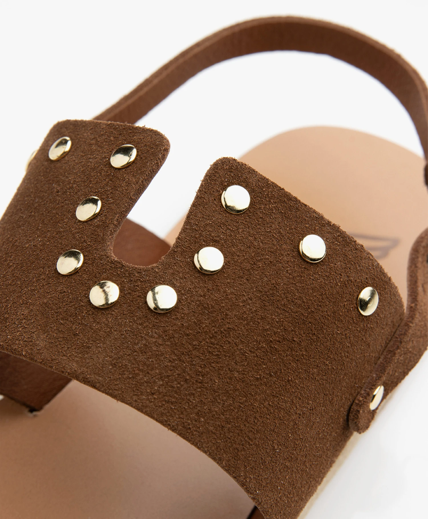 Met de toevoeging van subtiele, goudkleurige studs en een cut-out detail laat Ancient Greek Sandals hun handtekening achter op de Sergiani sandalen. De camelbruine sandalen zijn gemaakt van een suède leerkwaliteit en voorzien van de signature, vleugelvormige gespsluiting in goudkleurig metaal. Een veelzijdig paar om te combineren met je gehele garderobe!