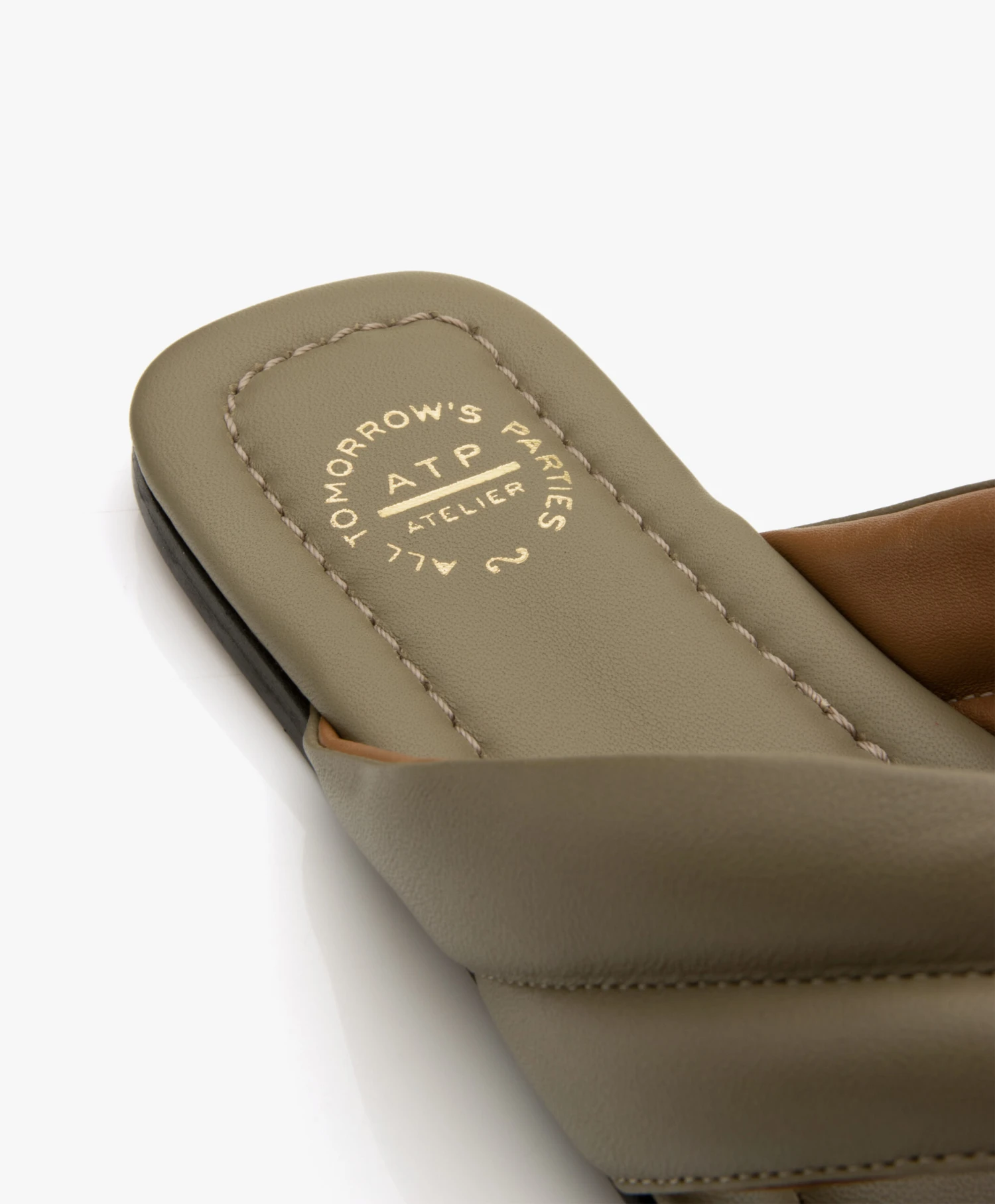 ATP Atelier combineert luxe en minimalisme in teenslippers Vione – gemaakt van een zachte, nappaleren kwaliteit in saliegroen. Ton-sur-ton stikselwerk zorgt voor een clean geheel, de vierkante voorkant voor een vrouwelijke feel en het gewatteerde voetbed voor ongeëvenaard draagcomfort. Zo zien wij het graag!
