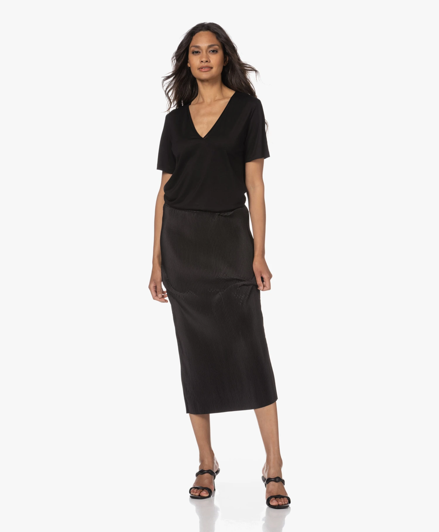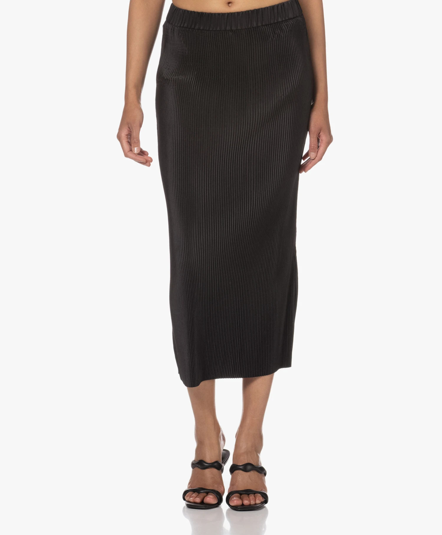 Repeterende structuren, vloeiende vormen: de natuur is een grote bron van inpiratie voor By Malene Birger. De fijne plisséplooien van de zwarte Velmas midi-rok creëren een kaarsrecht silhouet met voldoende ruimte voor beweging. Ondanks de goede rekbaarheid van de glanzende plisséstof raden we je aan de maat niet te klein te nemen: als je de rok ‘opvult’ worden de plooien gladgestreken en dat gaat ten koste van de stijl.