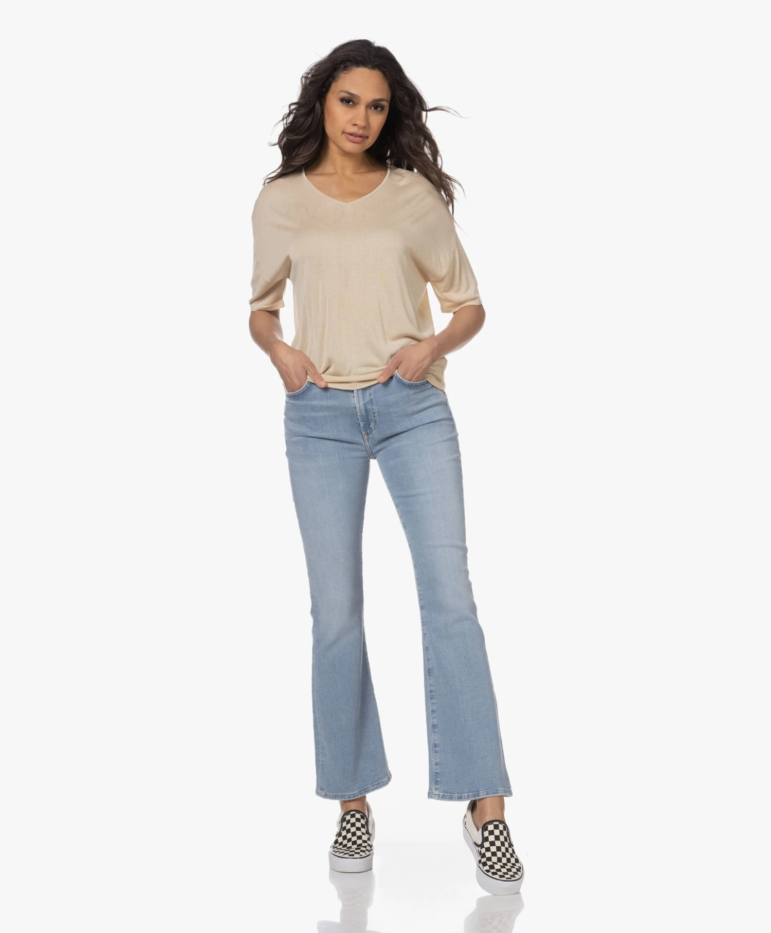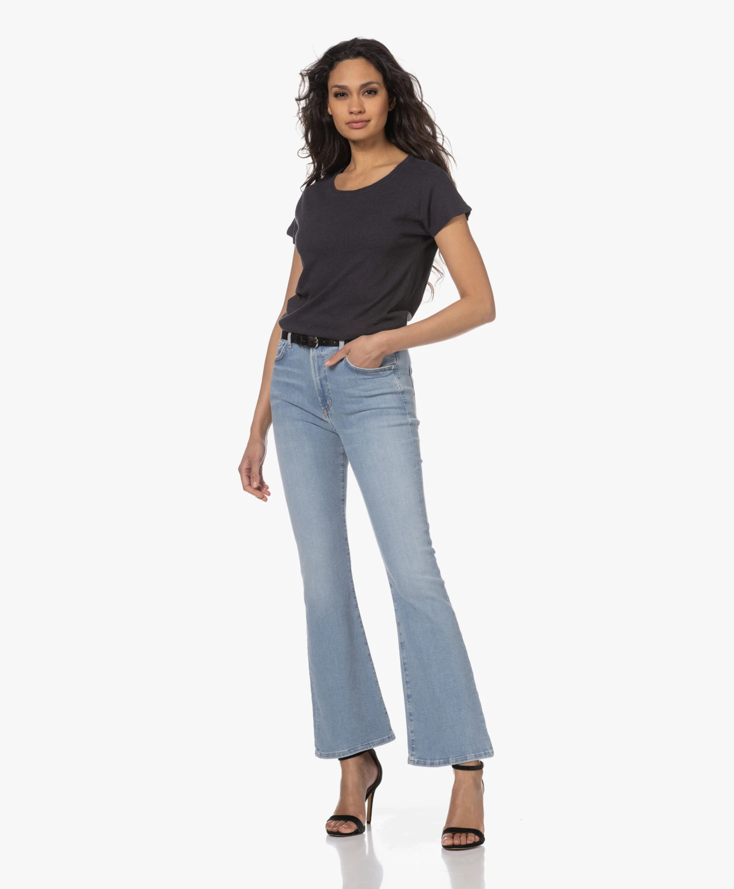 Citizens of Humanity’s lichtblauw gewassen Lilah 5-pocket bevindt zich qua sihouet in het schemergebied tussen bootcut en flared. Oftewel: slim-fit tot de knie, subtiel uitlopend richting de zoom. Ontworpen met een hoge taille, met liefde en aandacht gemaakt van middelzware katoenmix stretch-denim met een zachte wassing.