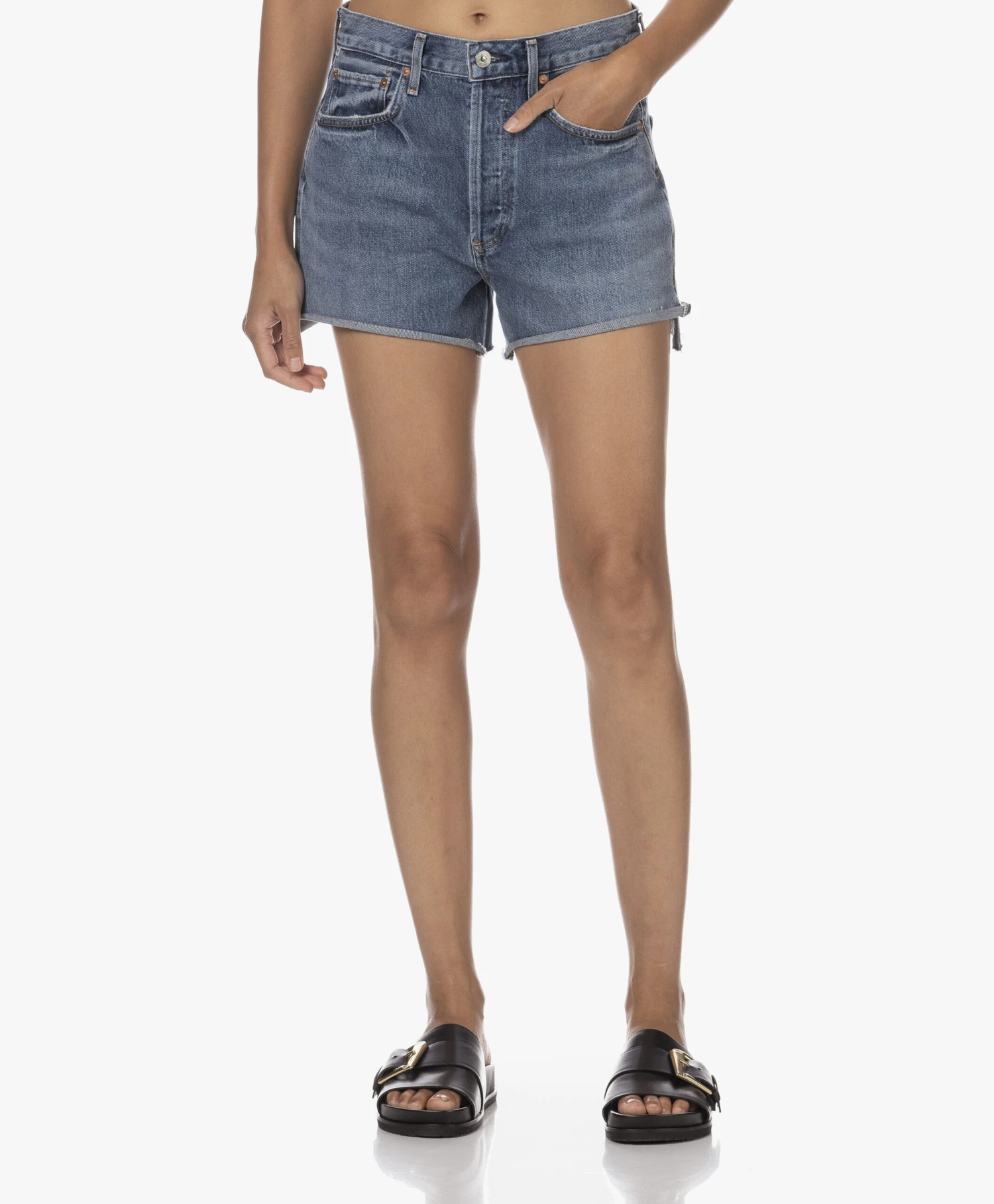 Vintage look: check. Knoopgulp: check. Slijtagedetails en een raw-cut zoom: check. En zo kunnen we nog wel even doorgaan – de vintageblauwe stretch-denim Marlow short van Citizens of Humanity vinkt al onze wensen af. Inclusief de wens om alleen nog maar biologisch katoen te dragen.