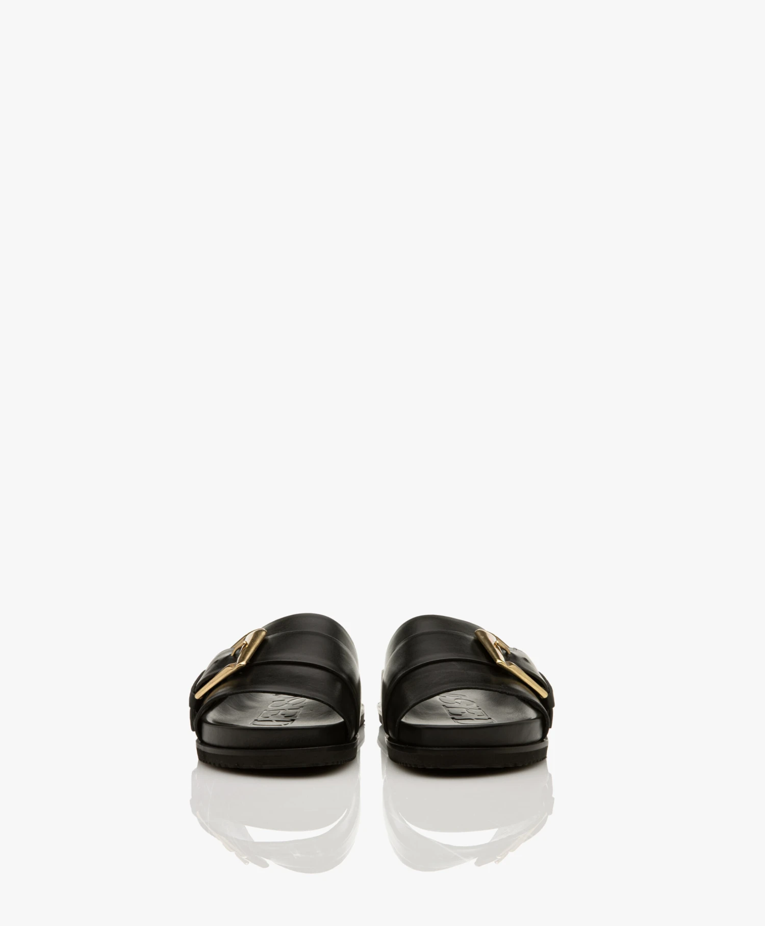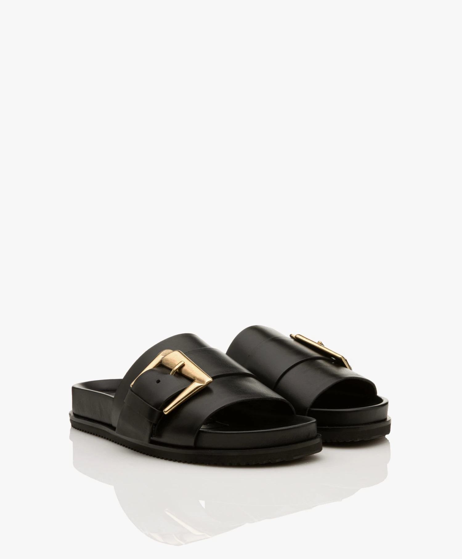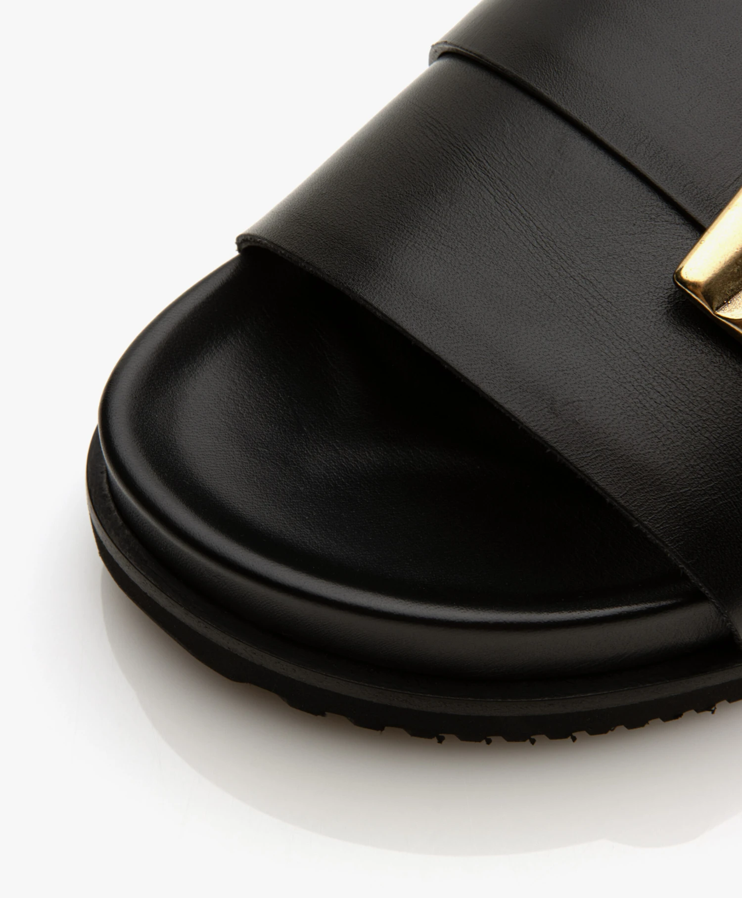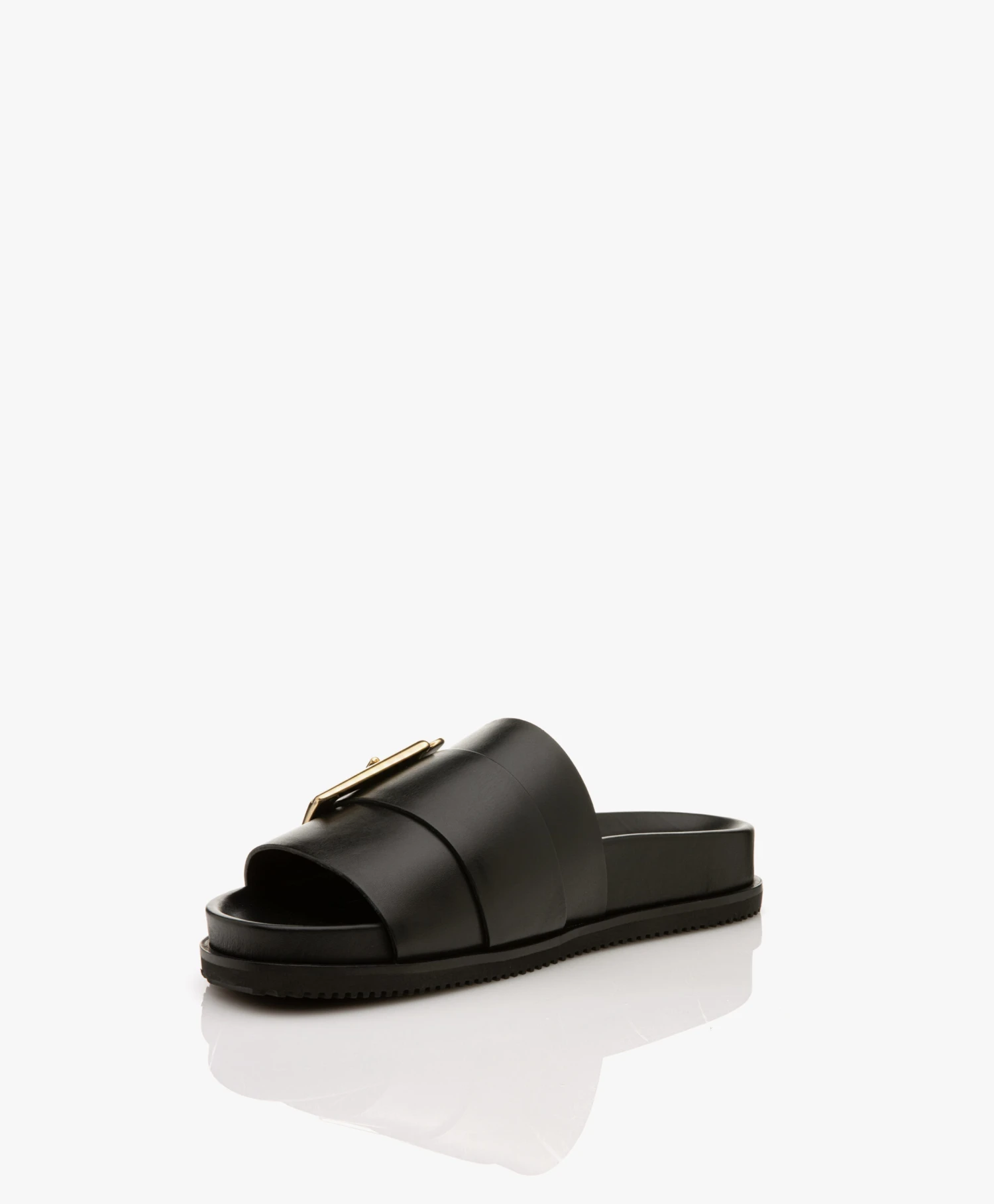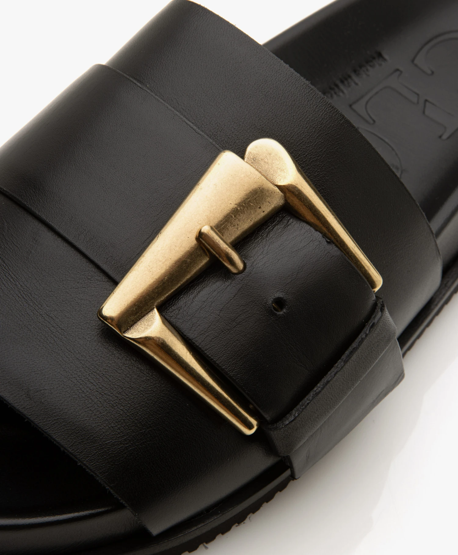 Deze stijlvolle slippers van Closed zijn wat ons betreft dubbel en dwars goedgekeurd – de vintage-goudkleurige gesp is super stijlvol, het ergonomische leren voetbed voelt comfortabel aan en de geribbelde anti-slipzool zorgt voor voldoende grip. Het zwarte, matte leer versterkt het minimalistische gevoel terwijl de grote gesp onderscheidend is.