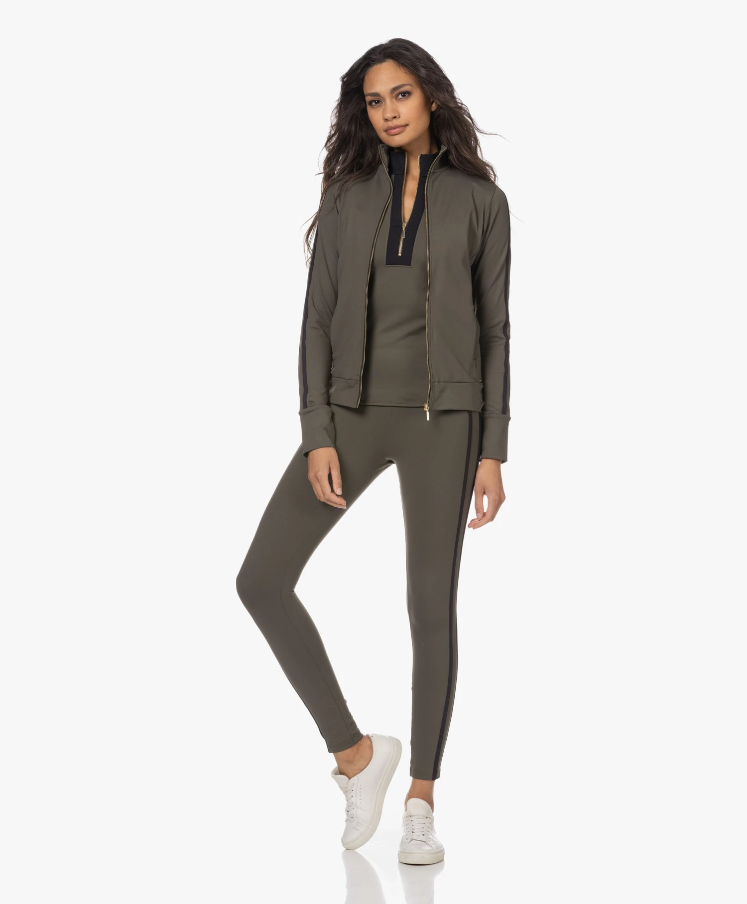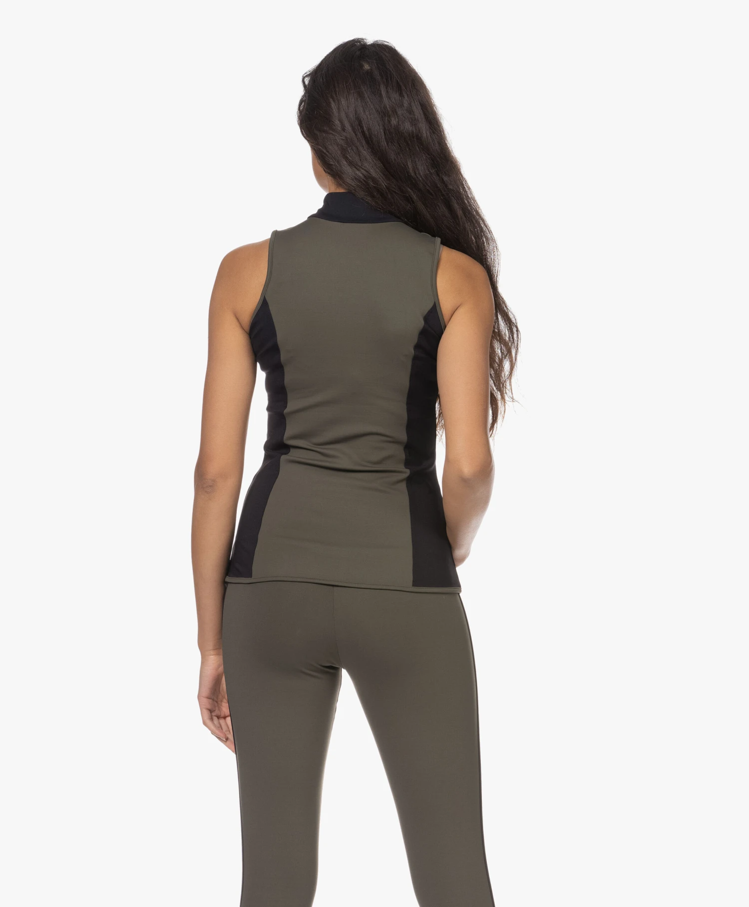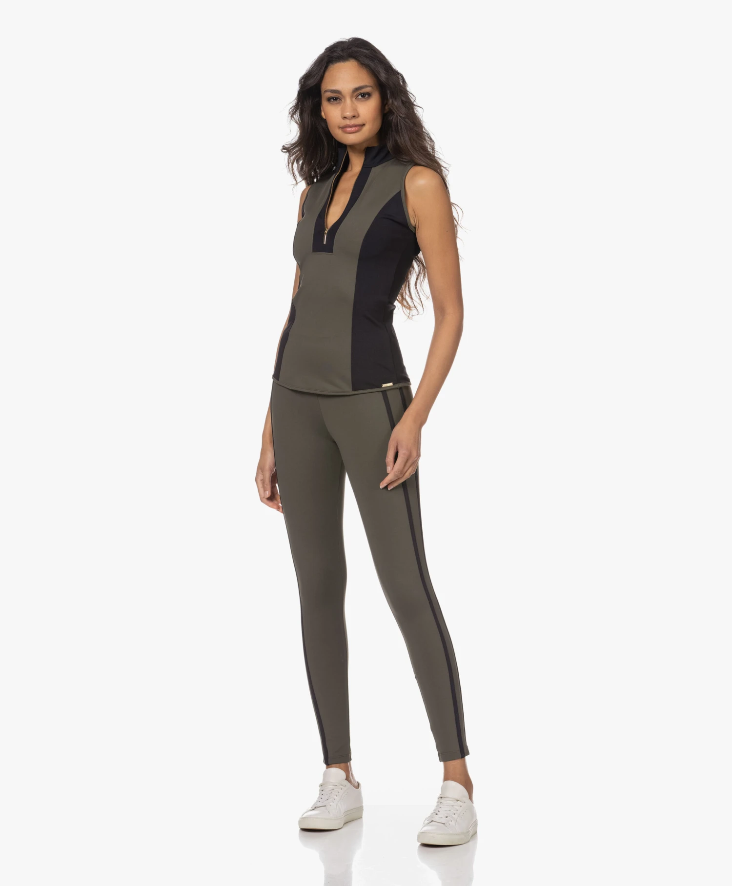 Deblon Sports gebruikt stevig compressie tech materiaal om kakigroene top Rosy te ontwerpen, waardoor een licht shapend effect wordt gecreëerd. De top met colkraag en goudkleurige ritssluiting komt in een stevige tech jersey kwaliteit waarbij brede, zwarte inzetten zorgen voor een grafisch effect, maar tegelijkertijd ook de getailleerde look versterken. Een favoriet voor zowel binnen als buiten de sportschool.