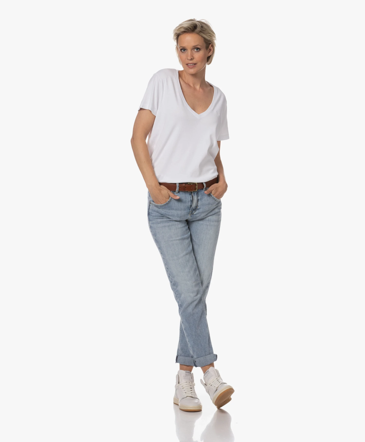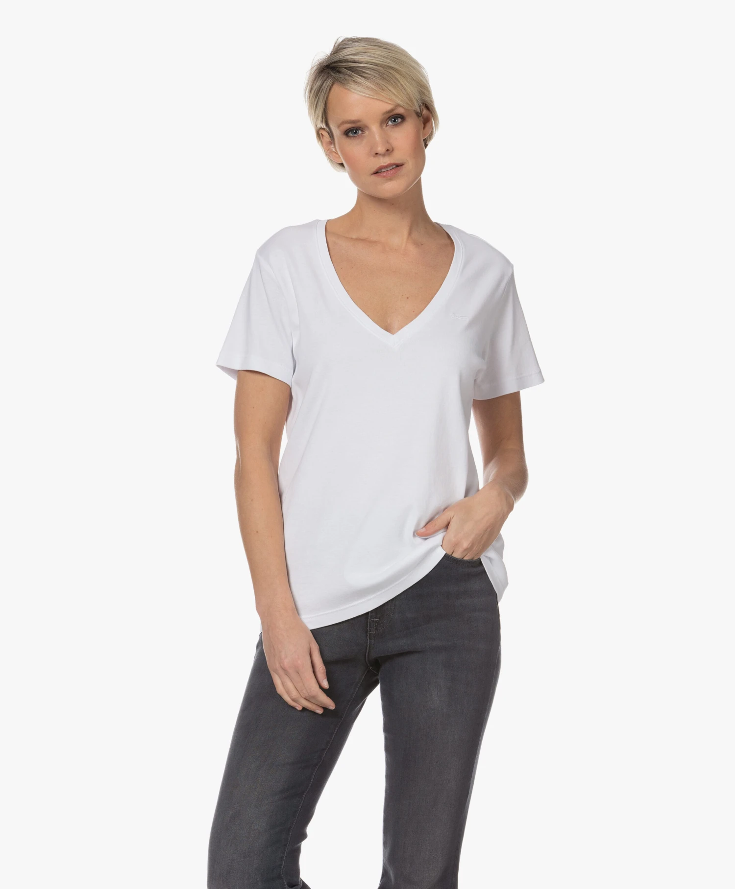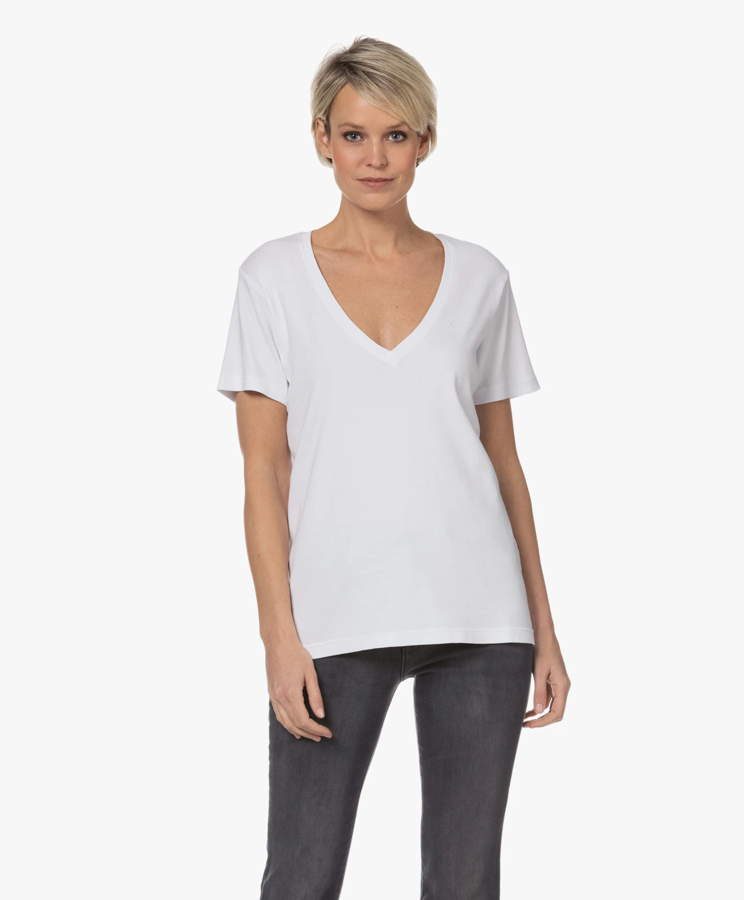 – Wijde, diepe V-hals, dubbellaagse afwerking