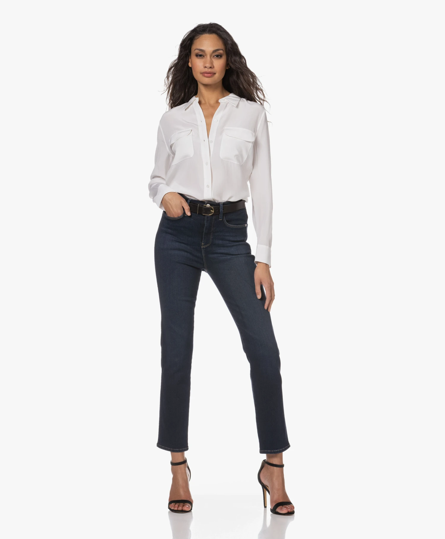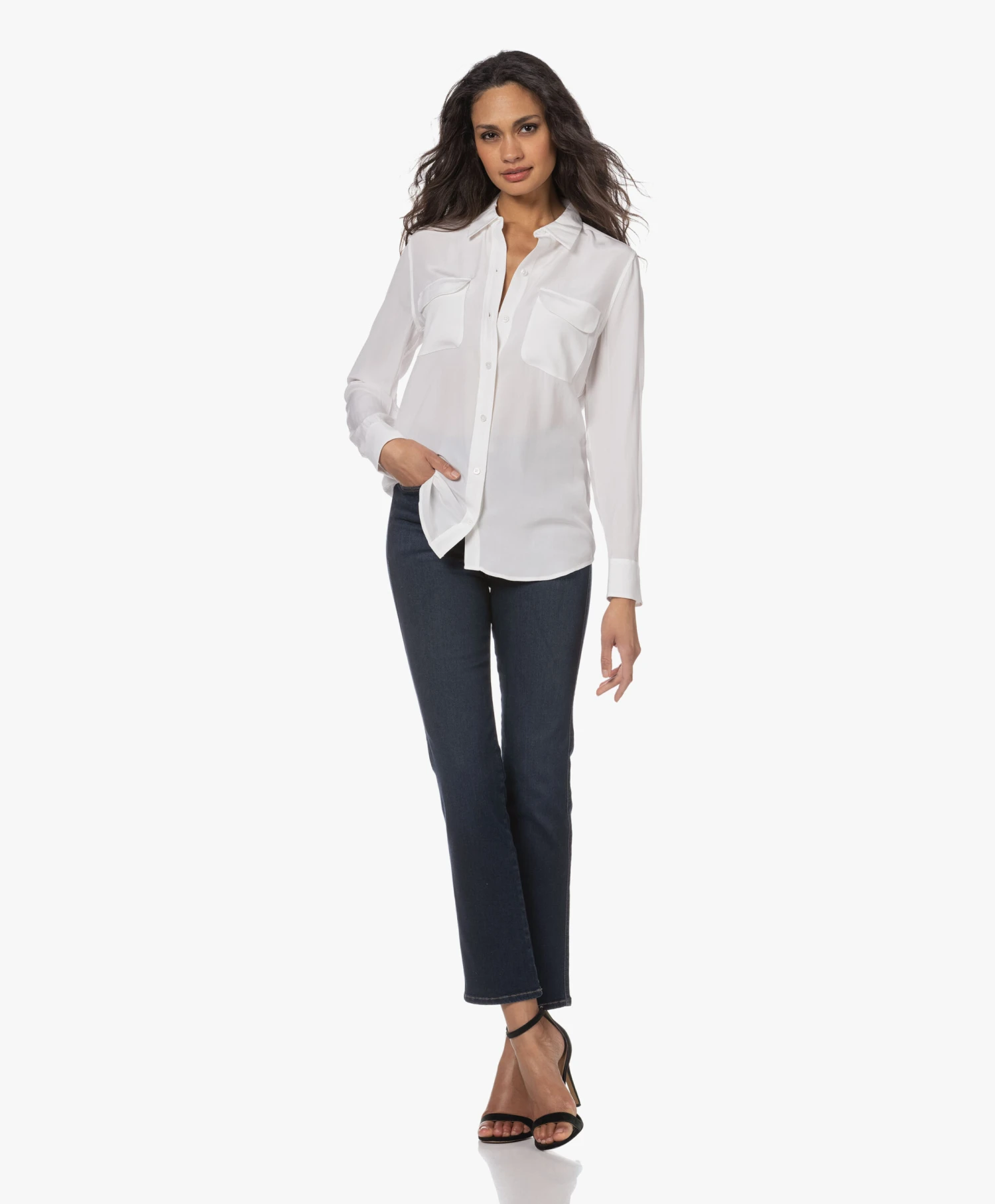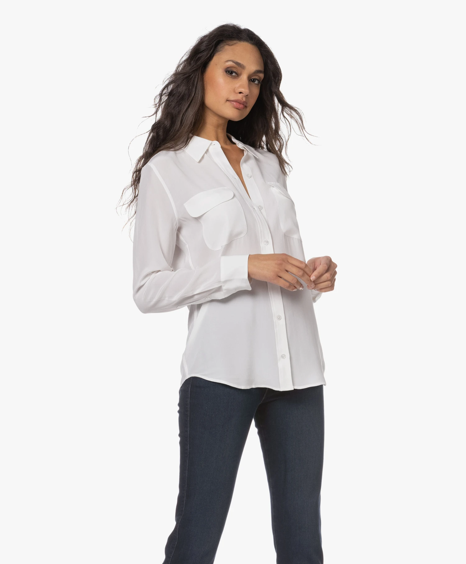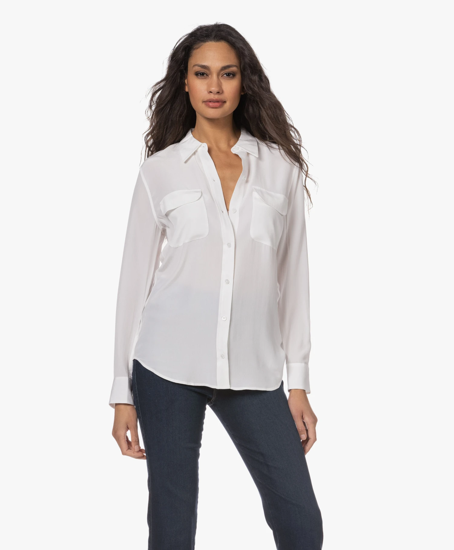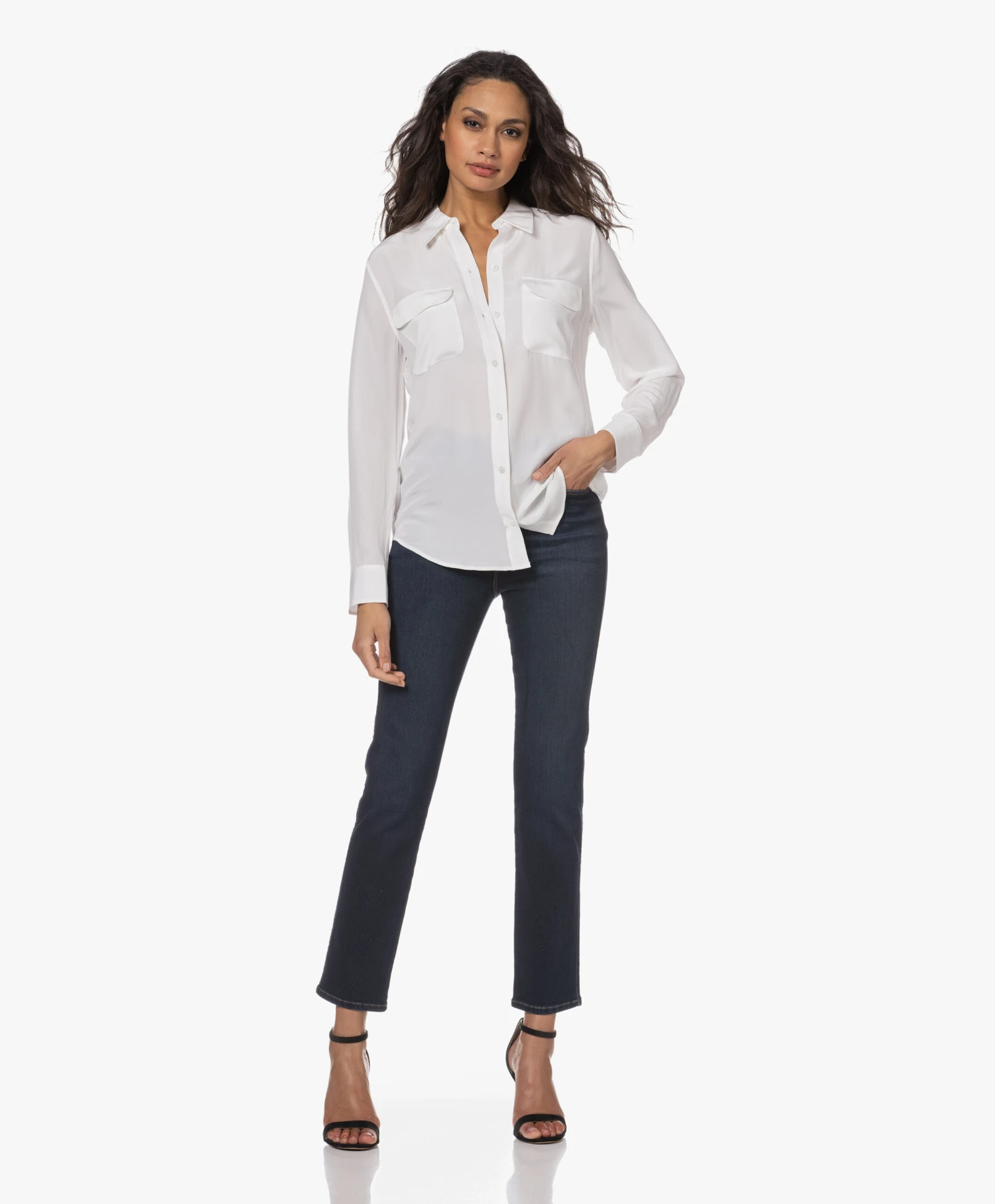 De klassieke witte Signature blouse van Equipment in een extra vrouwelijke uitvoering: de Slim Signature. Gemaakt van een matte, gewassen zijde kwaliteit met een prachtige valling die iedere look voorziet van meer allure. Een tijdloze en veelzijdige investering waar je geen spijt van zult krijgen.