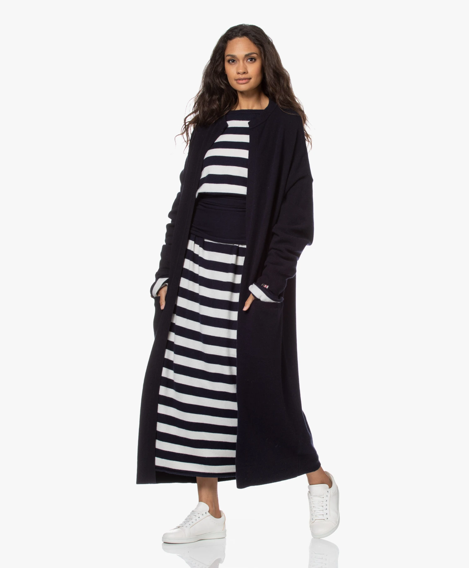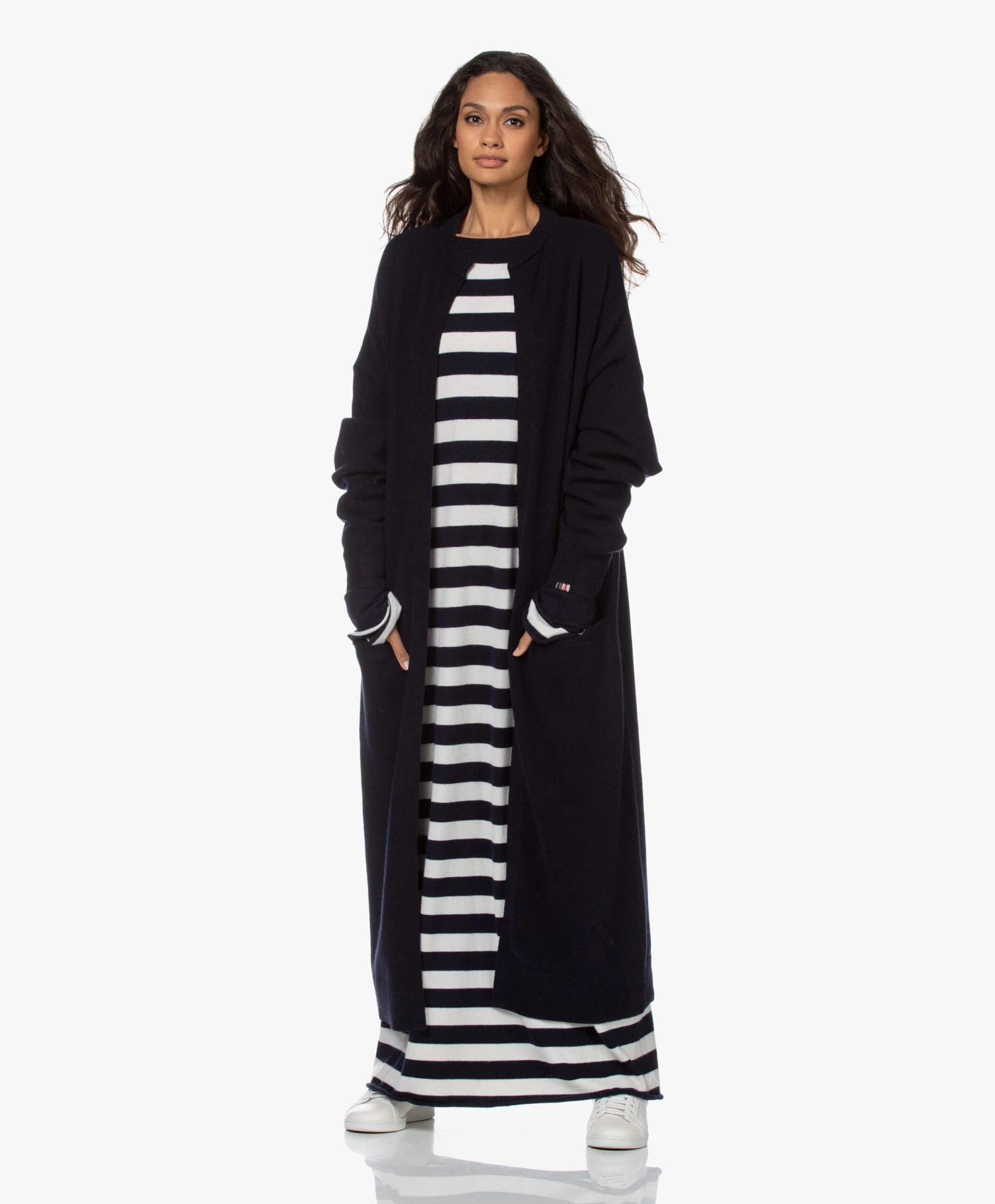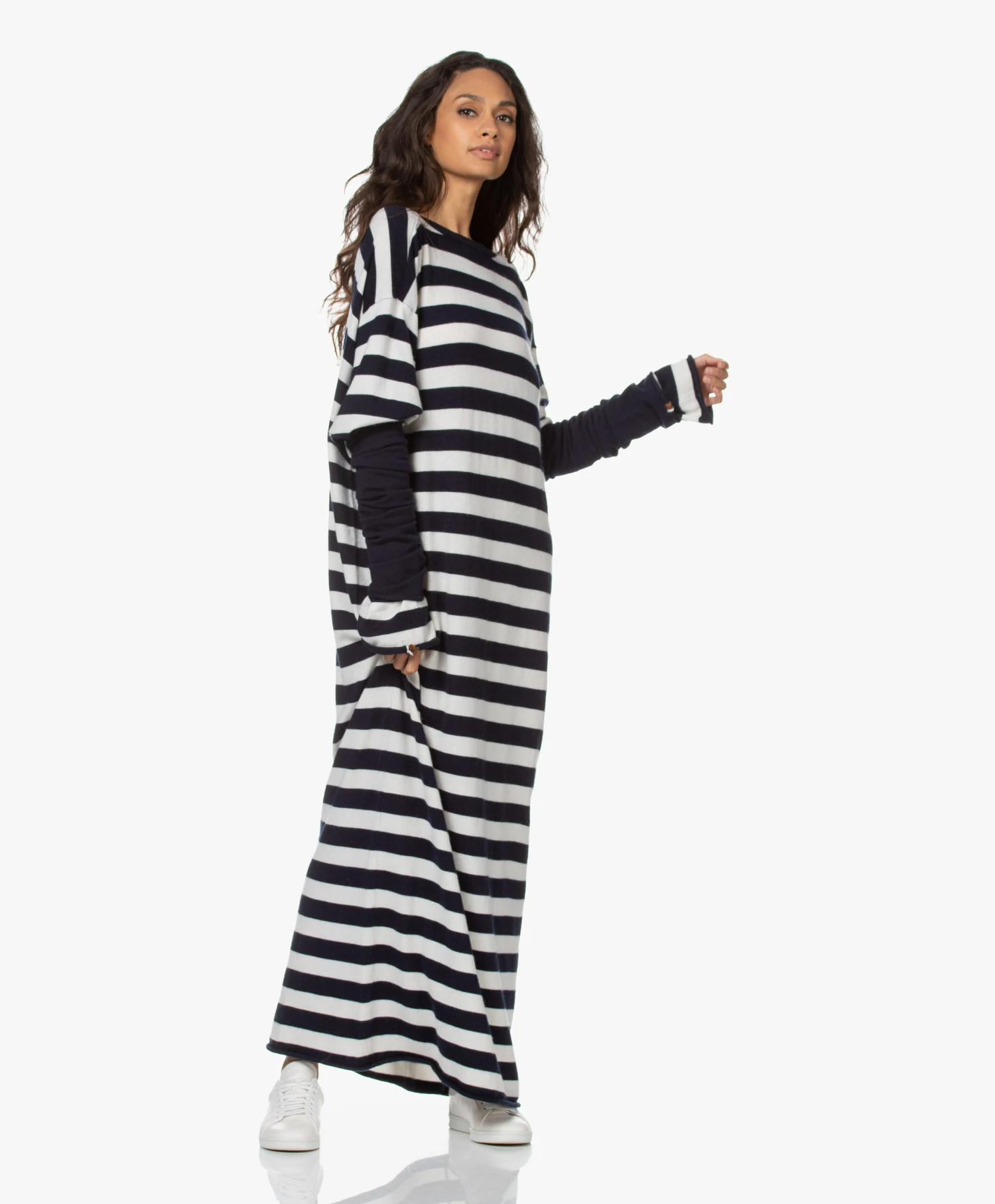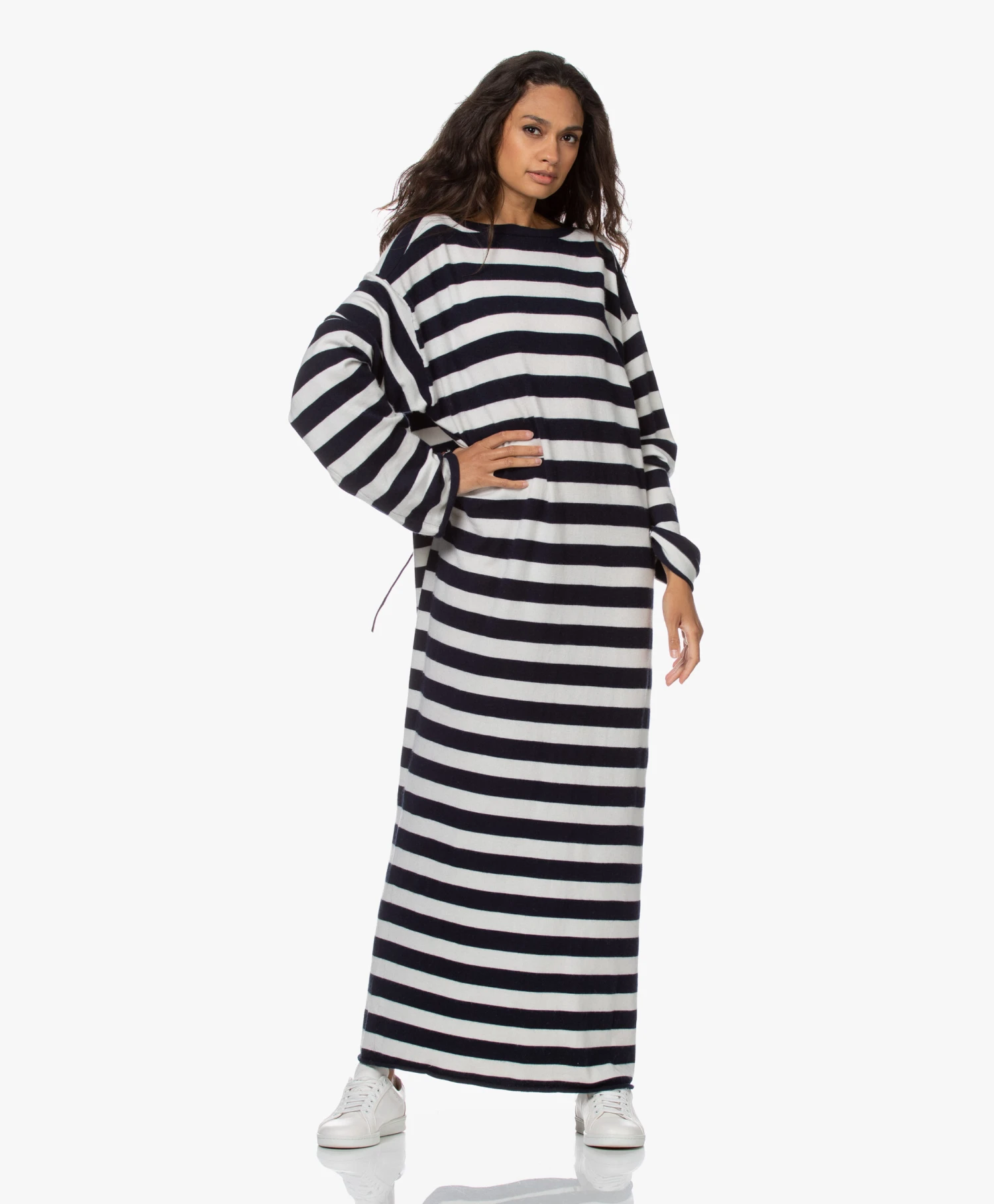 Van top tot teen gehuld in luxe knitwear? extreme cashmere’s N°192 Scoop oversized jurk maakt het waar. Het zachte cashmere-mix garen is gebreid in een navy/off-white horizontaal streepdessin. De extra diep uitgesneden ronde hals met verfijnde strikveter reikt tot de taille en kan zowel aan de voor- als achterkant gedragen worden.