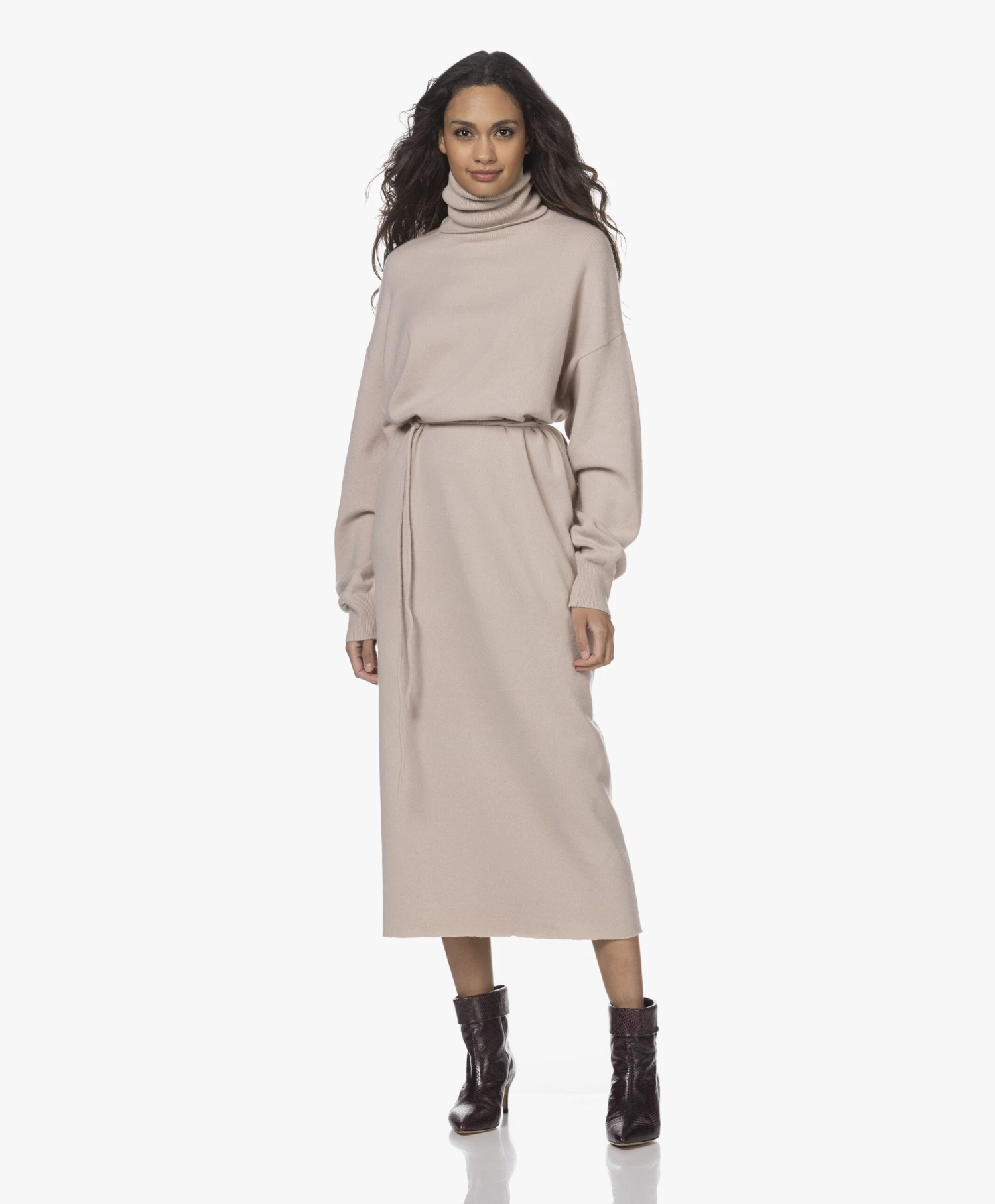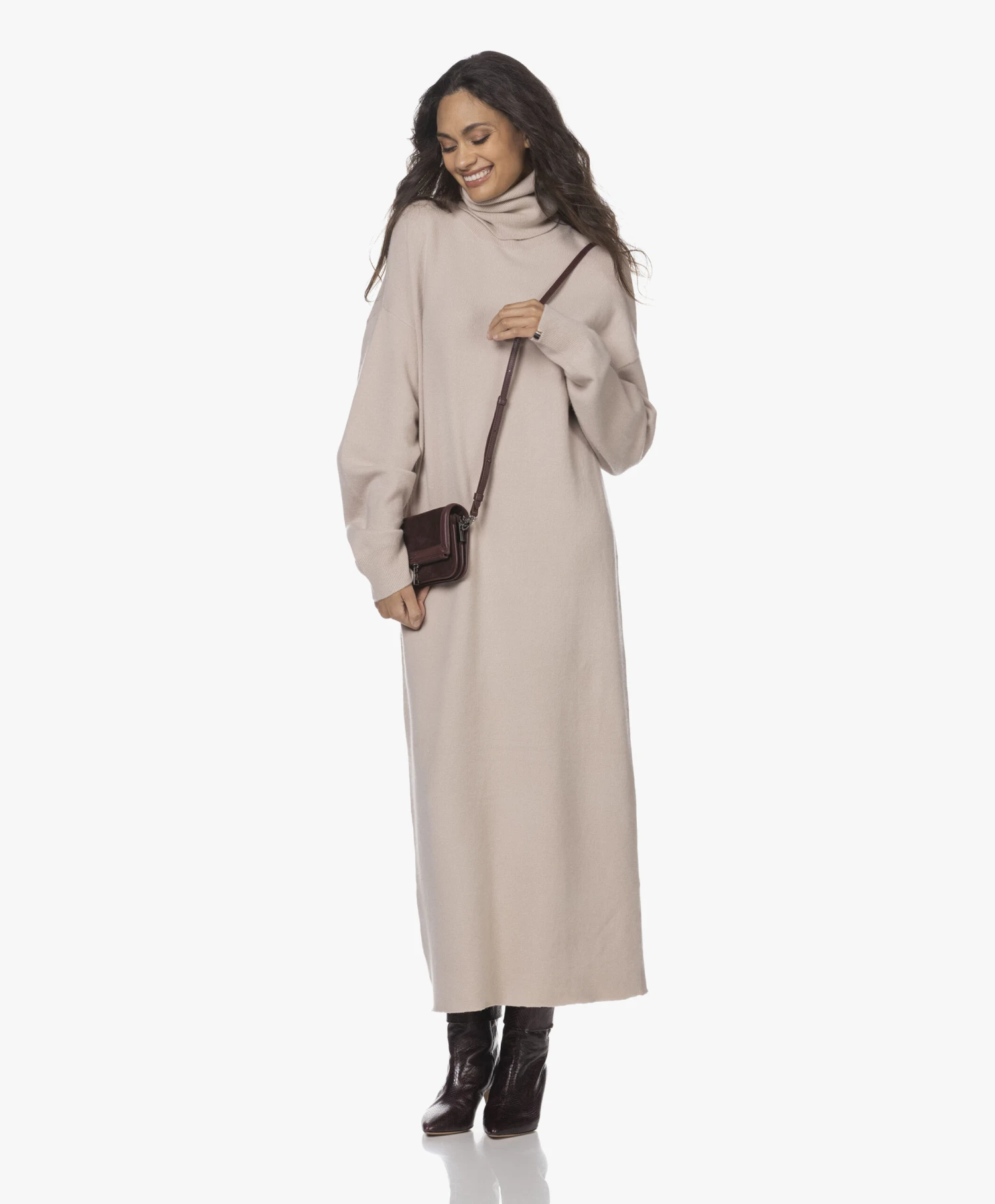 Met deze N°209 Attraction coljurk van extreme cashmere in vergrijsd lichtroze verwen je jezelf met alle luxe van cashmere en tegelijkertijd met het gemak van een stijlvolle one-piece. De gebreide jurk is ontworpen met een relaxte pasvorm met recht silhouet en een maxi lengte. Maak zelf de keuze om met of zonder bijpassende of zelfgekozen ceintuur te dragen voor steeds weer een andere look. Een extra hoge colkraag en extra lange mouwen zijn eigentijdse details die meteen een cozy gevoel creëren. Gemaakt van een fijn doch iets zwaarder breisel met cashmere.