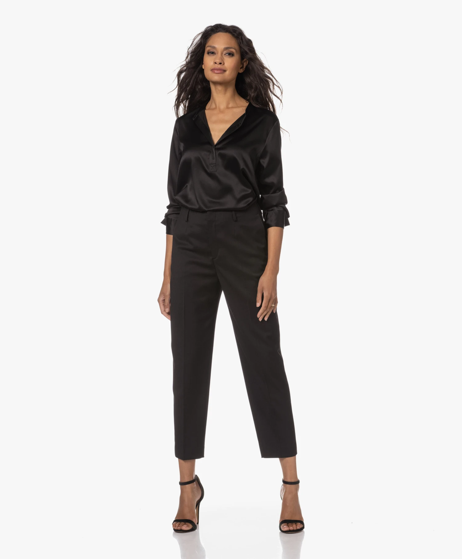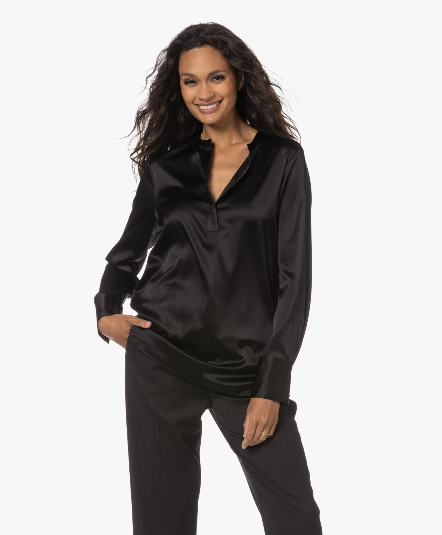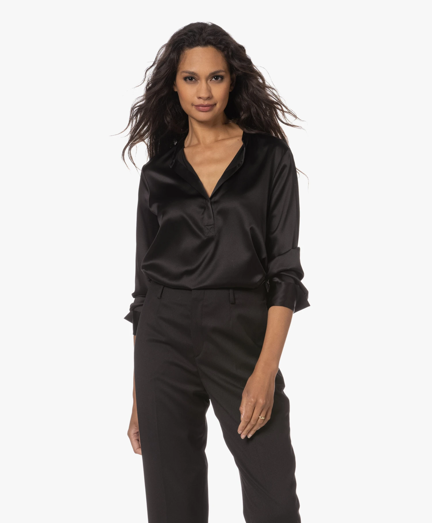 Onmisbaar in ieders garderobe; de zijden blouse. Deze zwarte blouse van Filippa K komt in een soepele en subtiele glanzende zijde kwaliteit met stretch en is voorzien van een ronde halsboord met V-split. De raw-cut afwerking bij de hals zorgt voor een subtiel contrast met de klassieke stijl.