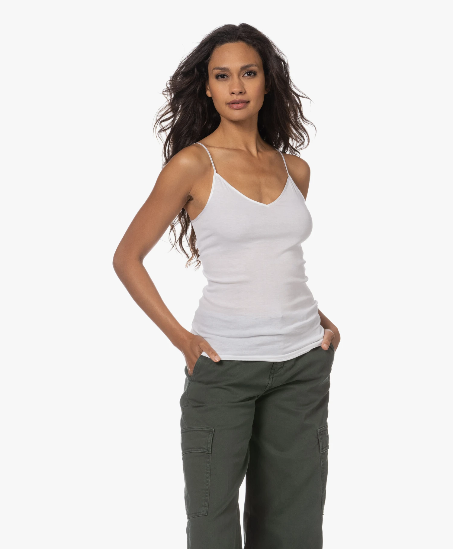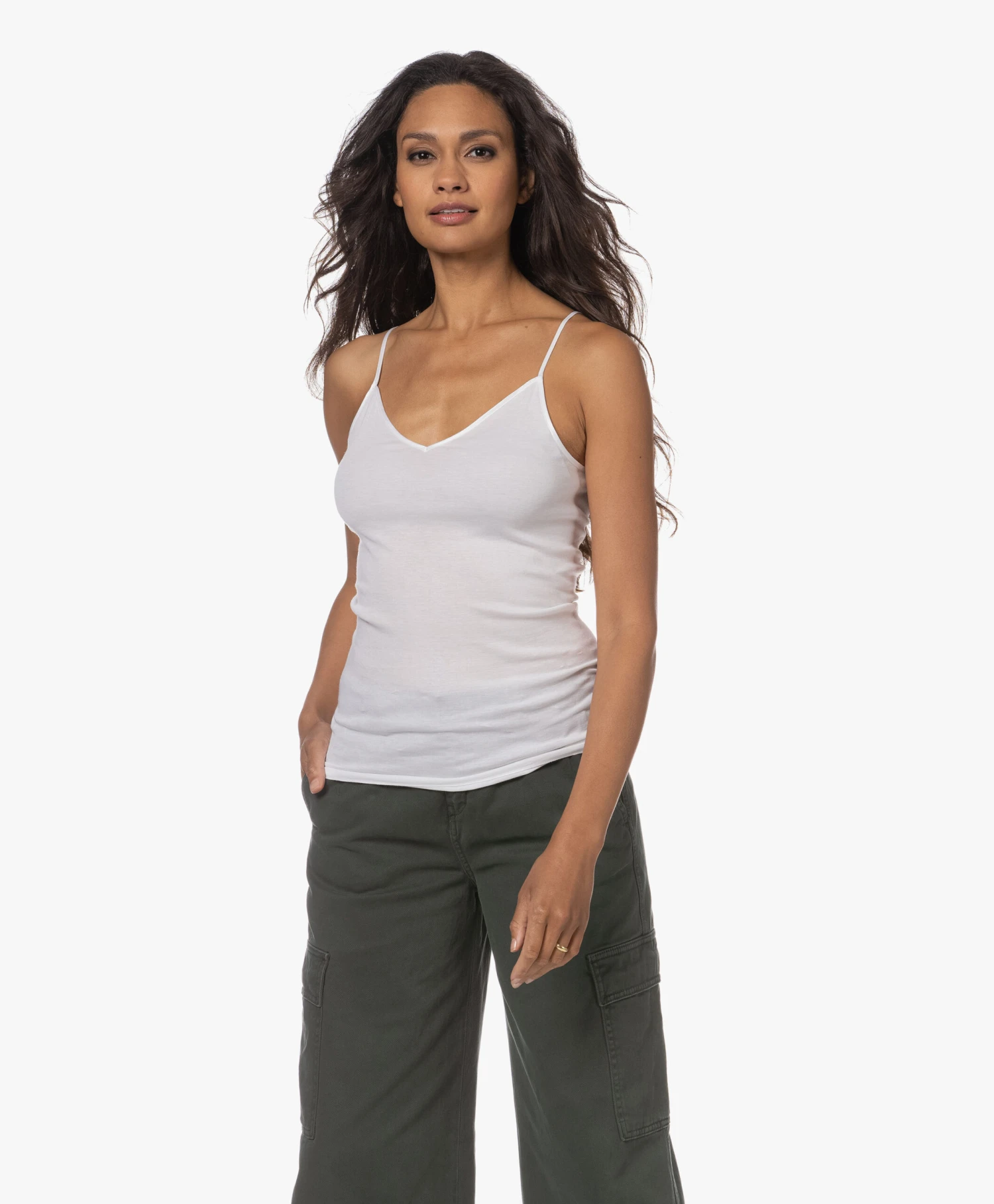 Deze spaghetti top van HANRO is ontworpen met een verleidelijke V-hals. Deze witte mouwloze top is onderdeel van de bestselling Cotton Seamless lijn – deze stijl is gemaakt van zacht en lichtgewicht gemerceriseerd katoen in een fijne ribkwaliteit voor een second-skin pasvorm. Dit stijlicoon heeft een naadloos ontwerp en delicate satijnen randen.