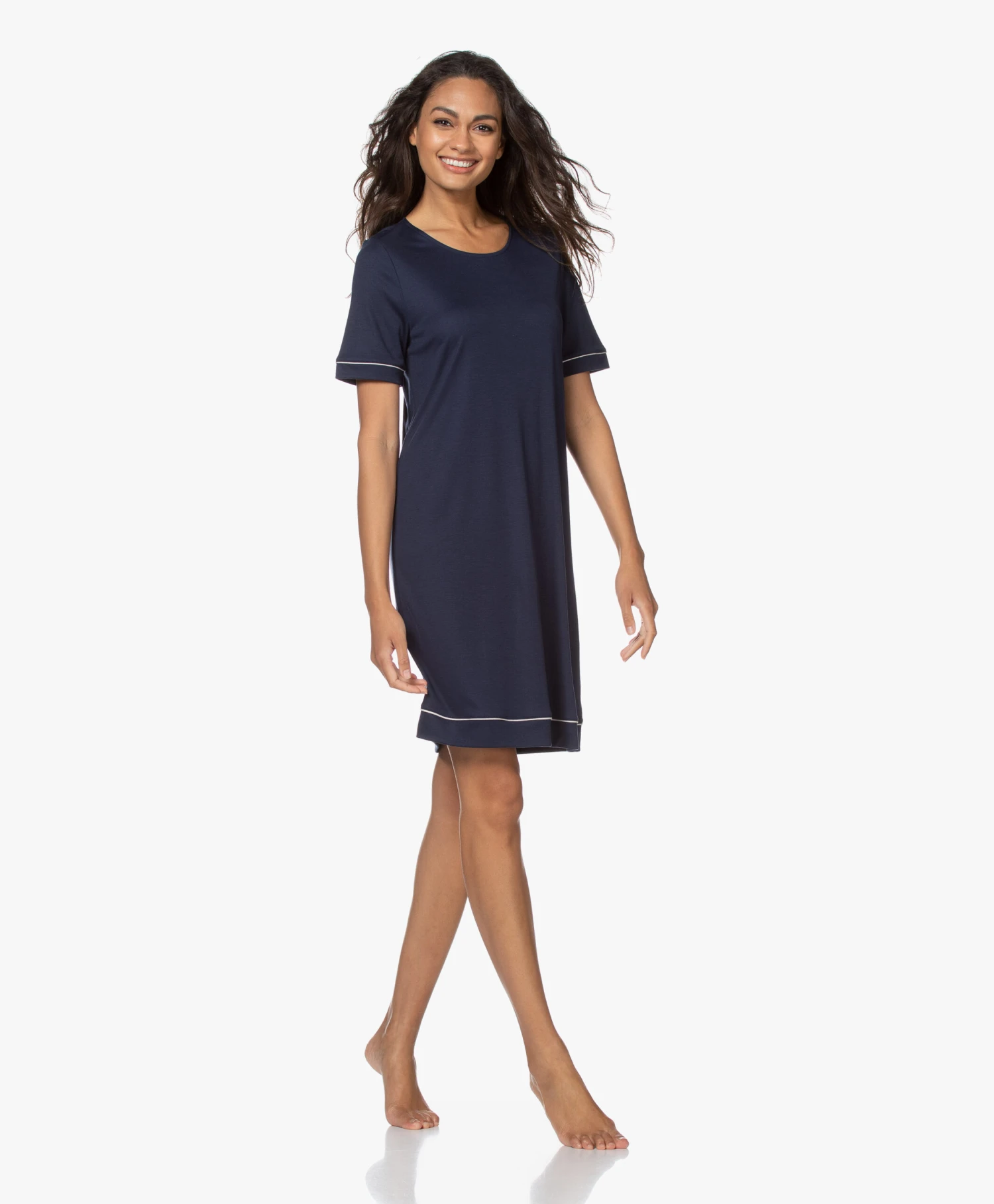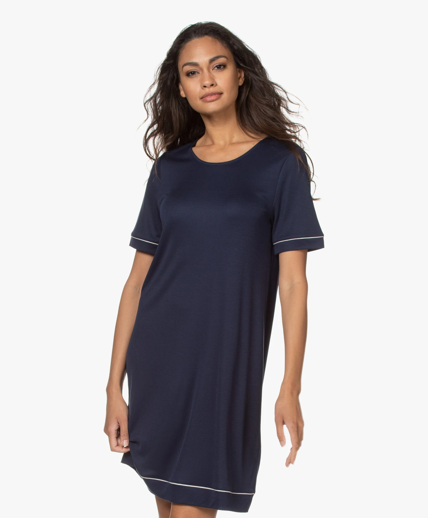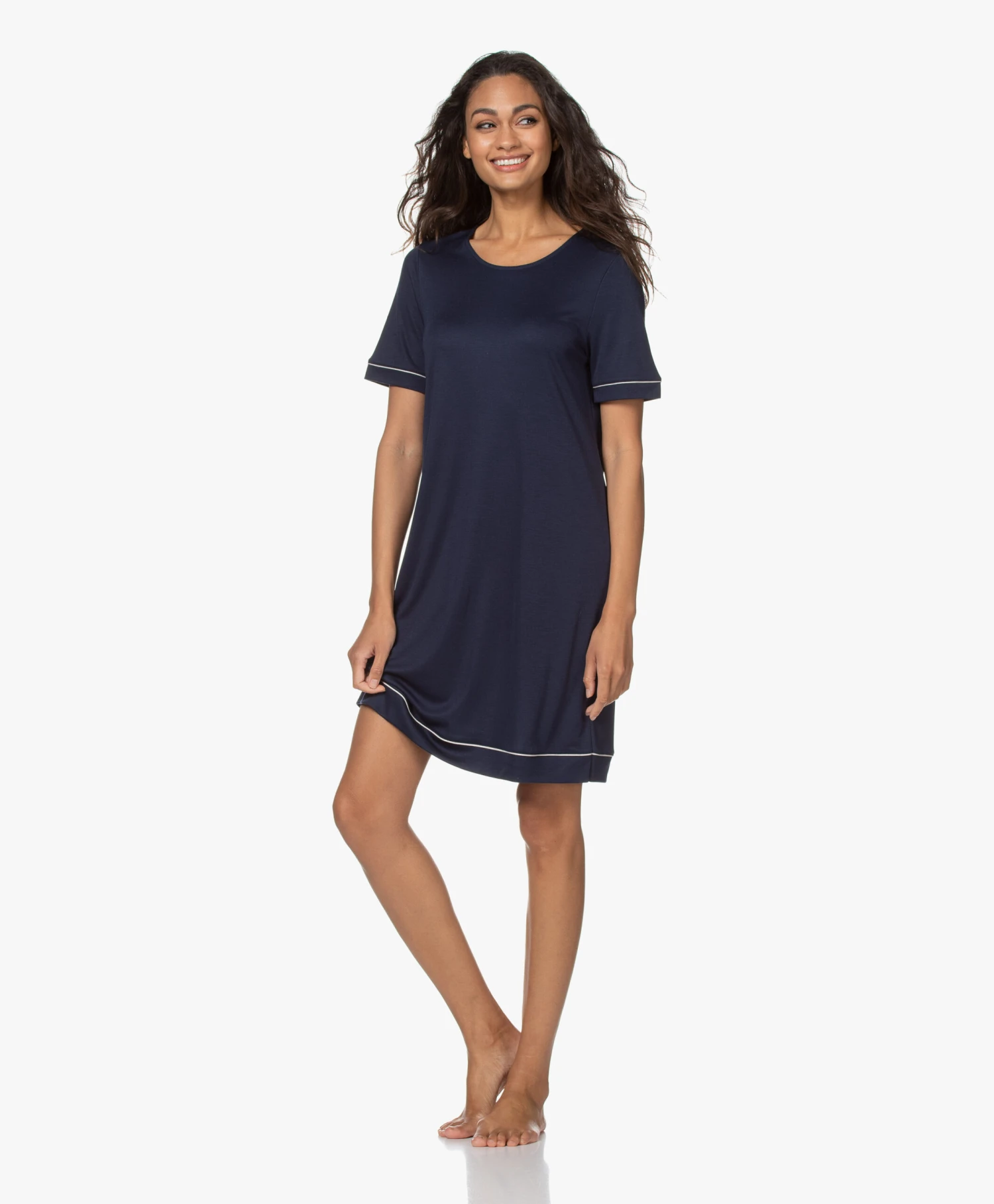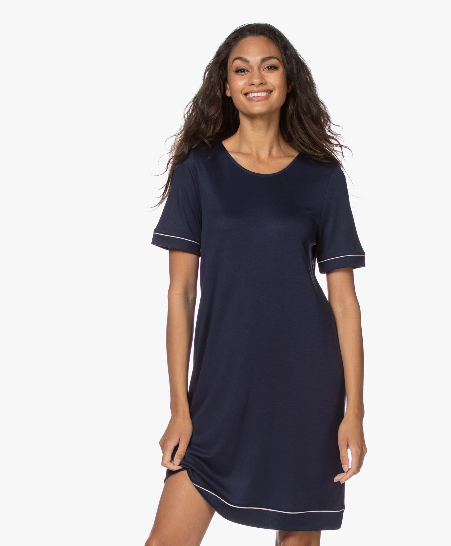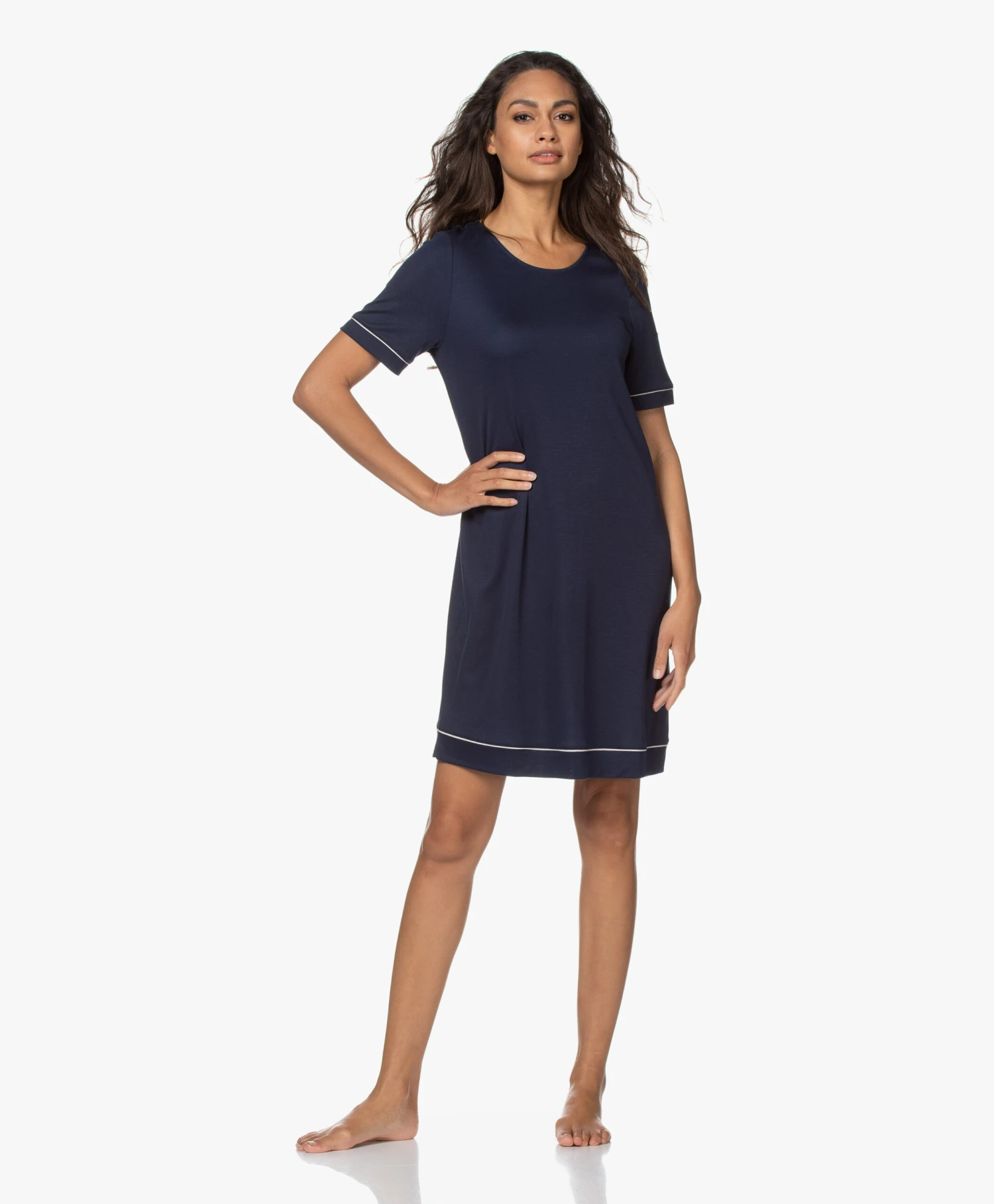 Volgens HANRO moet nachtmode naast comfortabel, vooral ook stijlvol zijn. Dit donkerblauwe nachthemd is gemaakt van puur Tencel wat deze T-shirtjurk naast ultra-zacht, ook ultra-duurzaam maakt. Daarnaast is de soepele jersey kwaliteit ademend en temperatuurregulerend met een hoge vochtopname – pure luxe voor ’s nachts.