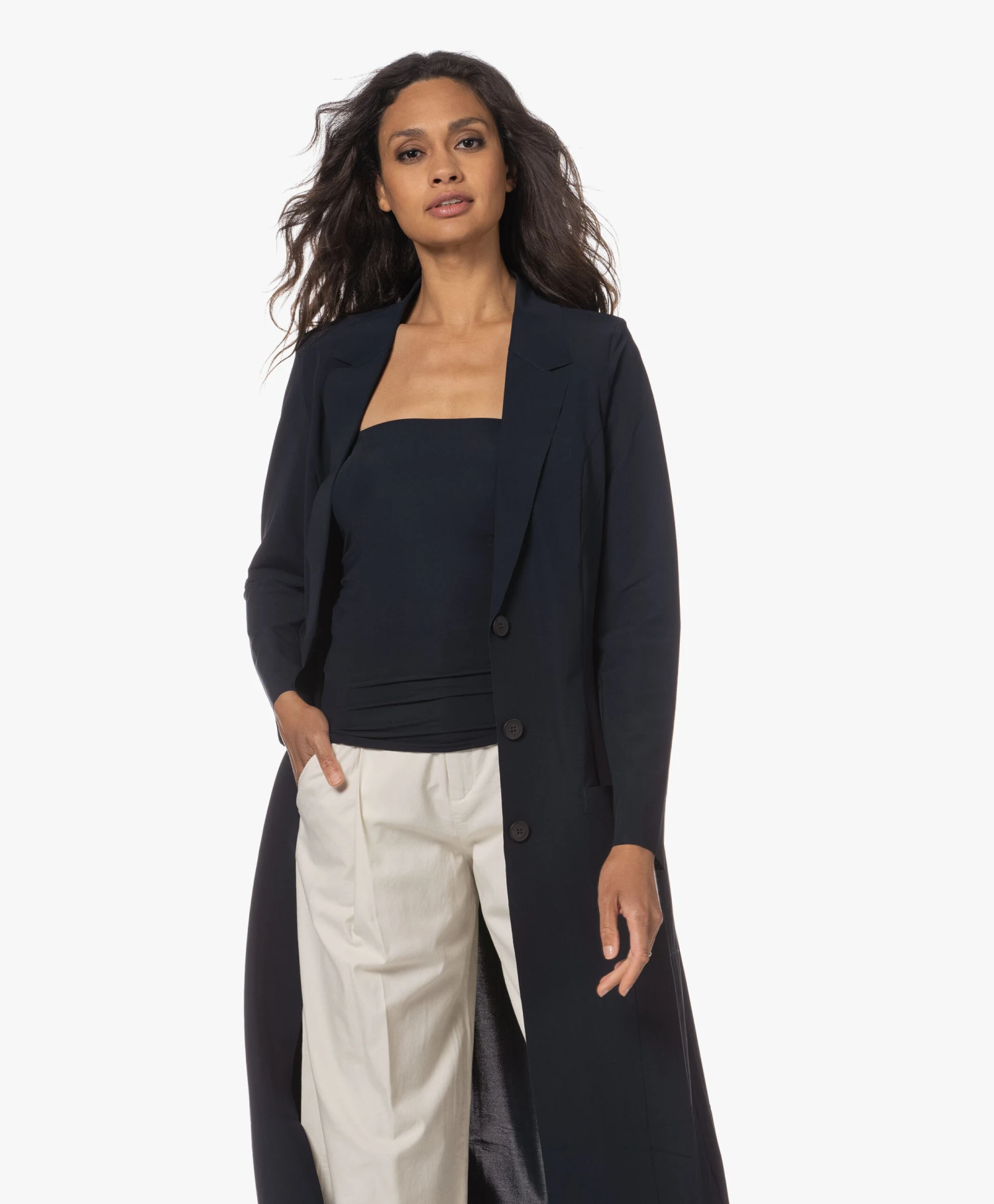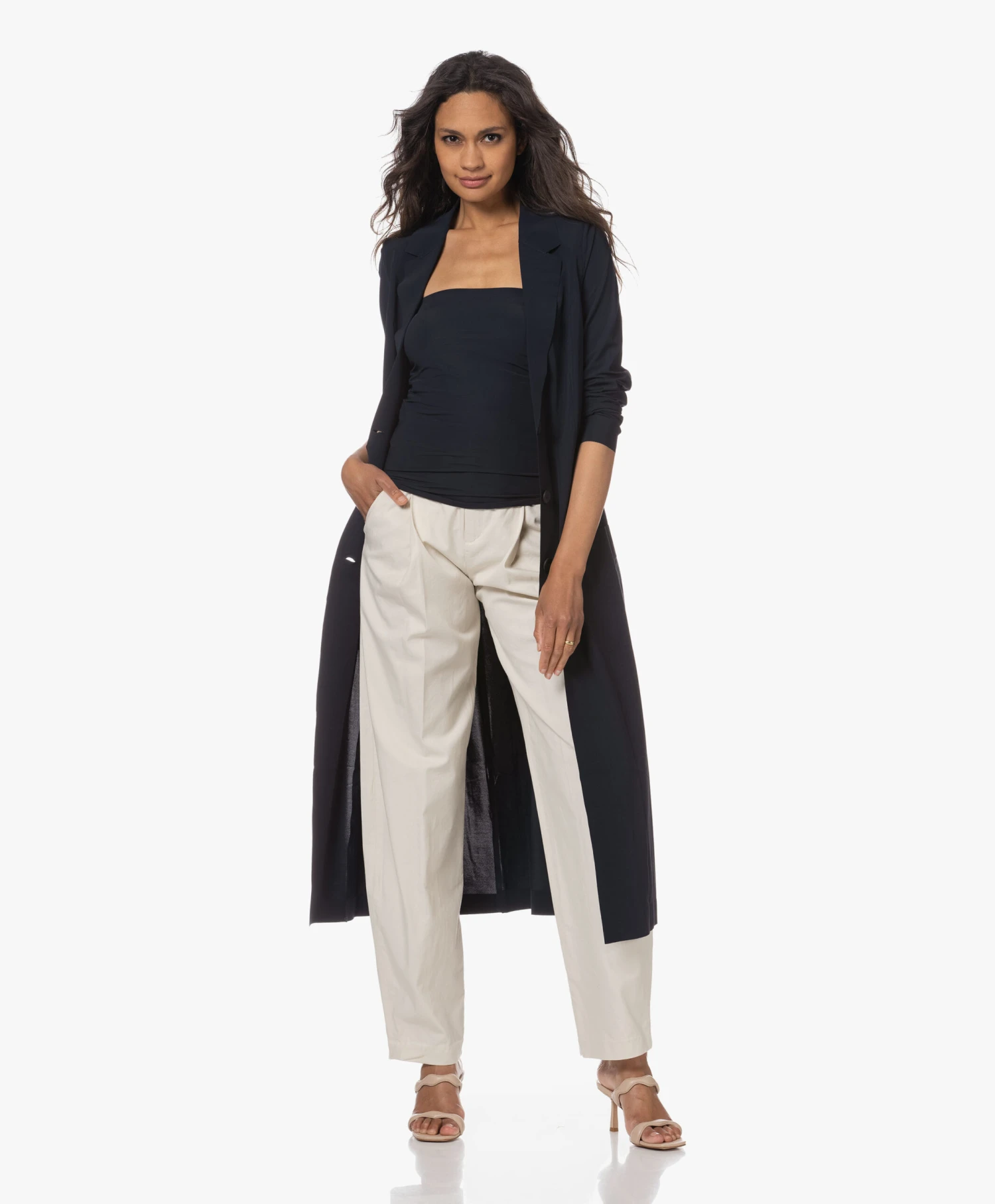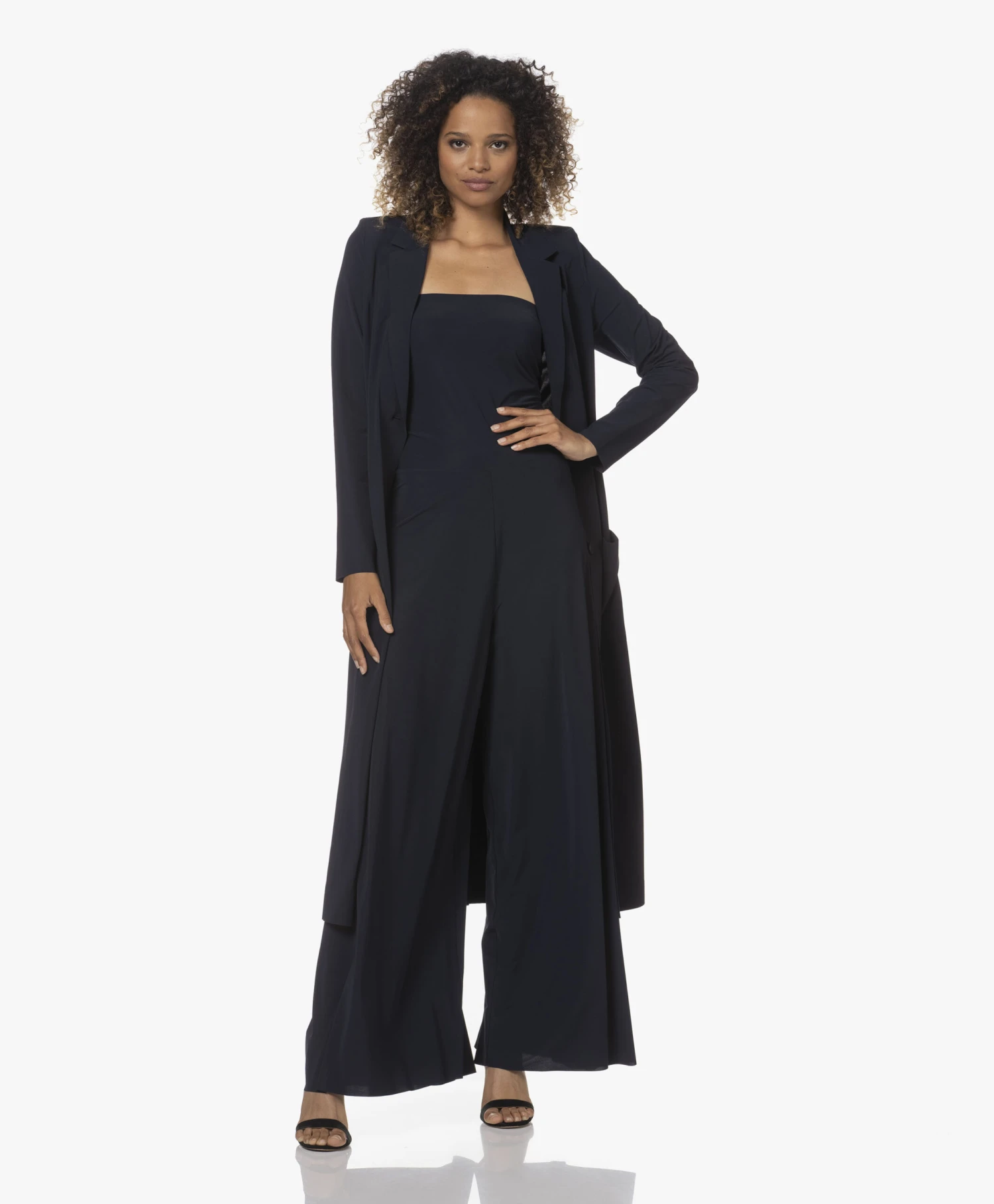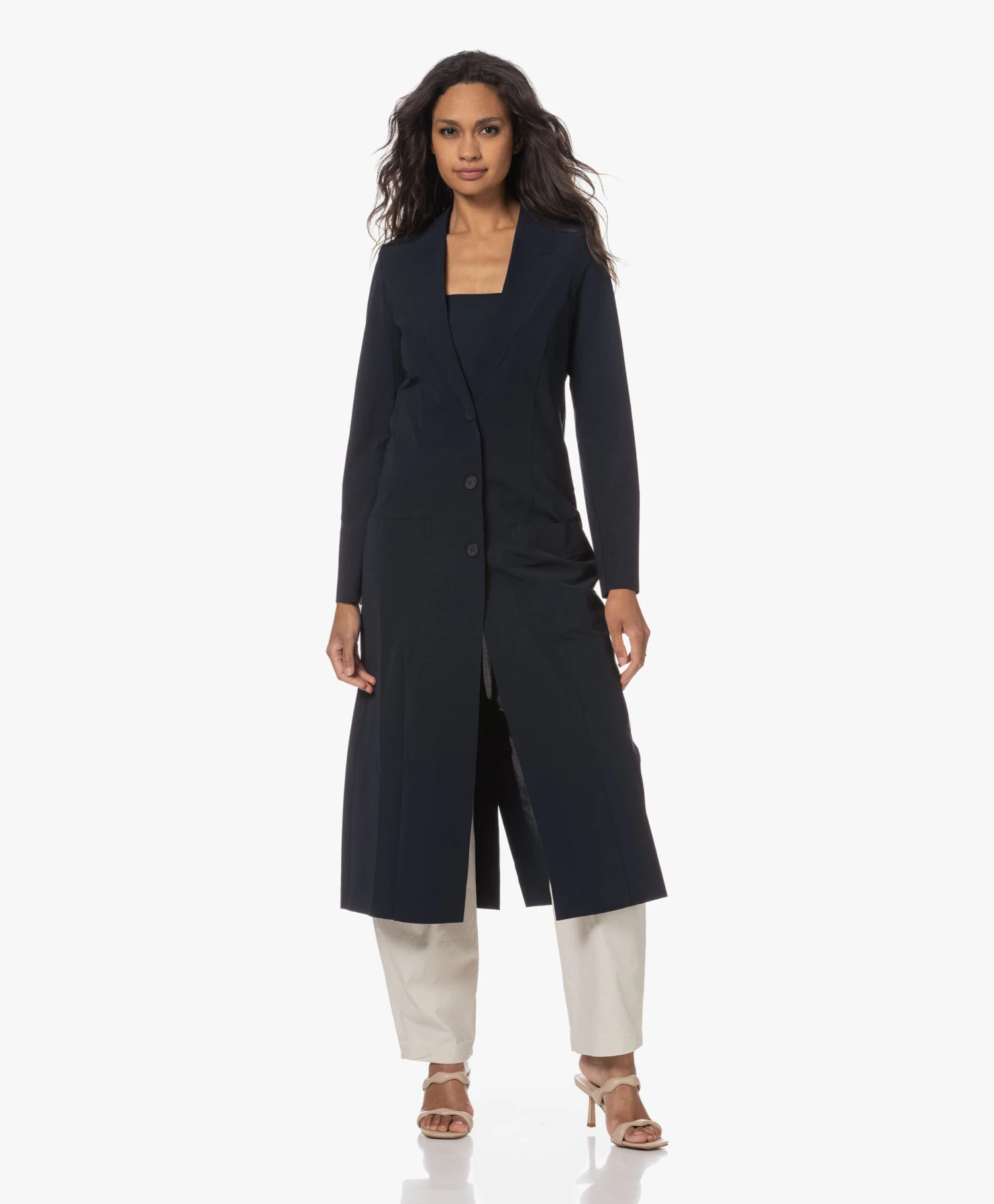 Aan JapanTKY hebben we deze oogstrelende diep donkerblauwe, kuitlange Quito blazer te danken, waarvoor applaus. Gemaakt van een kreukvrije travel jersey stretch-kwaliteit met laser-cut randafwerking en een laag sluitende reverskraag – een modern-chique ‘cover-up’!