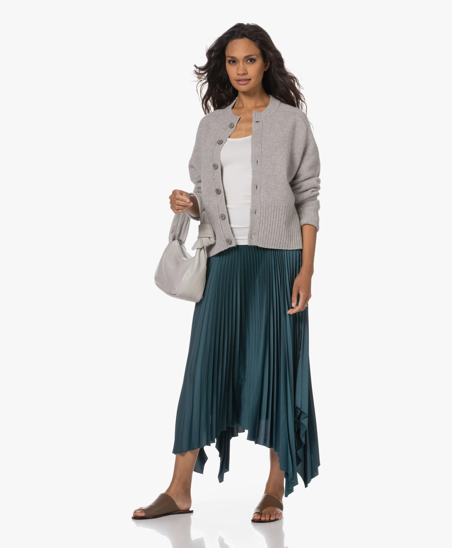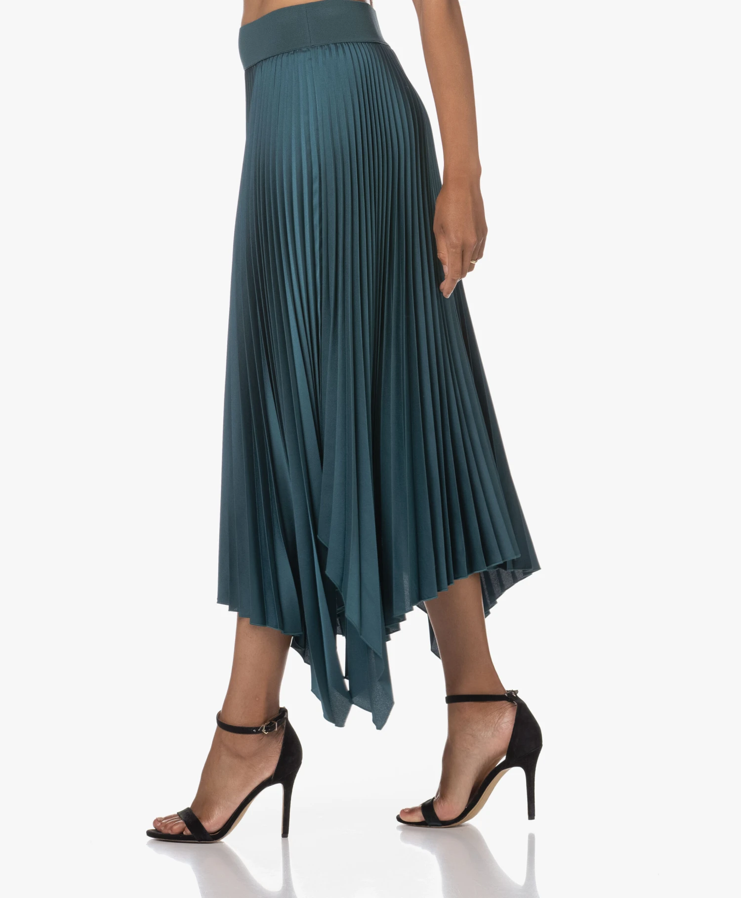 Als je Joseph’s Ade rok ziet, begrijp je waarom kunst en mode vaak aan elkaar gelinkt worden. Want ook hier draait alles om samenspel. Zo laten de scherp geplisseerde stof en de asymmetrische zoom de satijnen stof en de petrol kleur nóg mooier uitkomen – voor een dynamisch geheel dat vanuit iedere hoek weer anders oogt. Gemaakt van een luxe, zwaarvallende crêpe-satijnen kwaliteit en uitgerust met een brede elastische rib-tailleband voor extra draagcomfort.