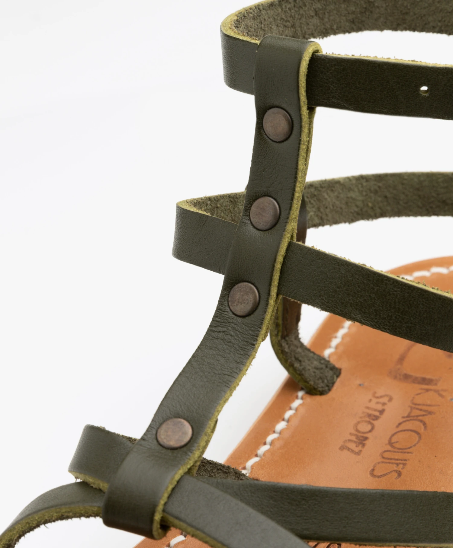 De leren Larissa sandalen van K.Jacques Saint Tropez ademen een tijdloze stijl. Deze sandalen zijn met de hand gemaakt van kakigroen leer en ontworpen met smalle leren bandjes in een kruislings design en zijn gedetailleerd met vintage metalen studs. Deze gladiator-stijl sandalen complementeren iedere look, seizoen na seizoen.