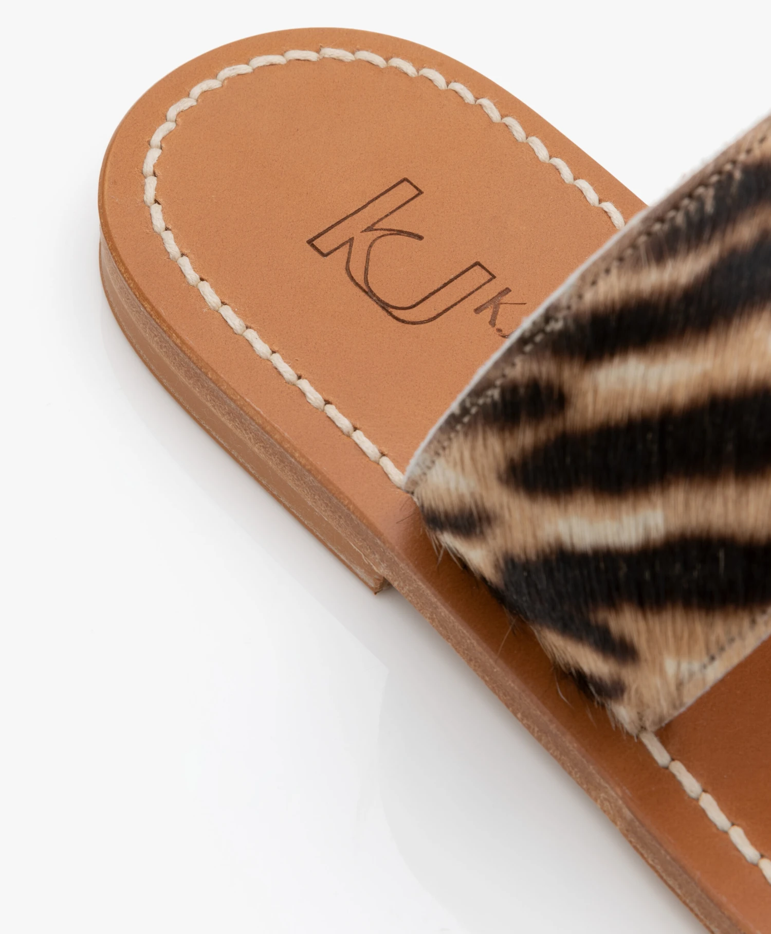 Een enkel teenbandje en een brede band over de wreef is alles wat K. Jacques St. Tropez gebruikt om de Nagoya slippers vorm te geven – wij zijn weg van de minimalistische vormgeving versus de uitgesproken tijgerprint met haarstructuur. Deze donkerbruine/ beige slippers zijn gemaakt van een matte en soepele leerkwaliteit met een luxe gelaagde leren zool.