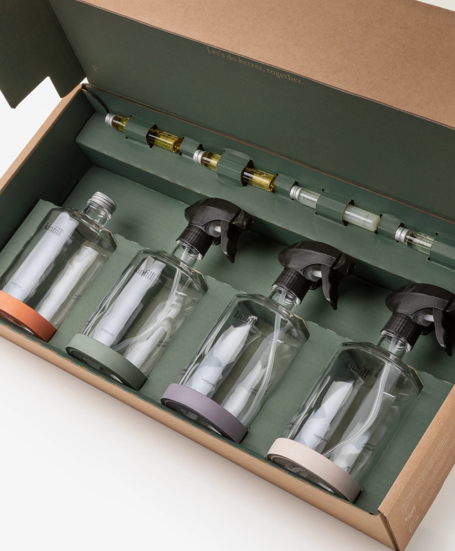 De duurzame Full House Collectie van Kinfill bestaat uit vier verschillende soorten schoonmaakmiddelen; elk geschikt voor een ander oppervlak. Dit luxueuze pakket wordt geleverd met vier navulbare Forever Bottles van Italiaans glas, een rubberen flesbeschermer voor elk reinigingsproduct en vier schoonmaakconcentraten die je aanvult met kraanwater om ‘single-use’ plastic in het dagelijks leven te verminderen. Bovendien worden de sprays geleverd met een triggerspuit én ontvang je labels om de flessen georganiseerd te houden. De schoonmaakconcentraten zijn samengesteld uit krachtige, natuurlijke ingrediënten – voor een heerlijke geur in huis.