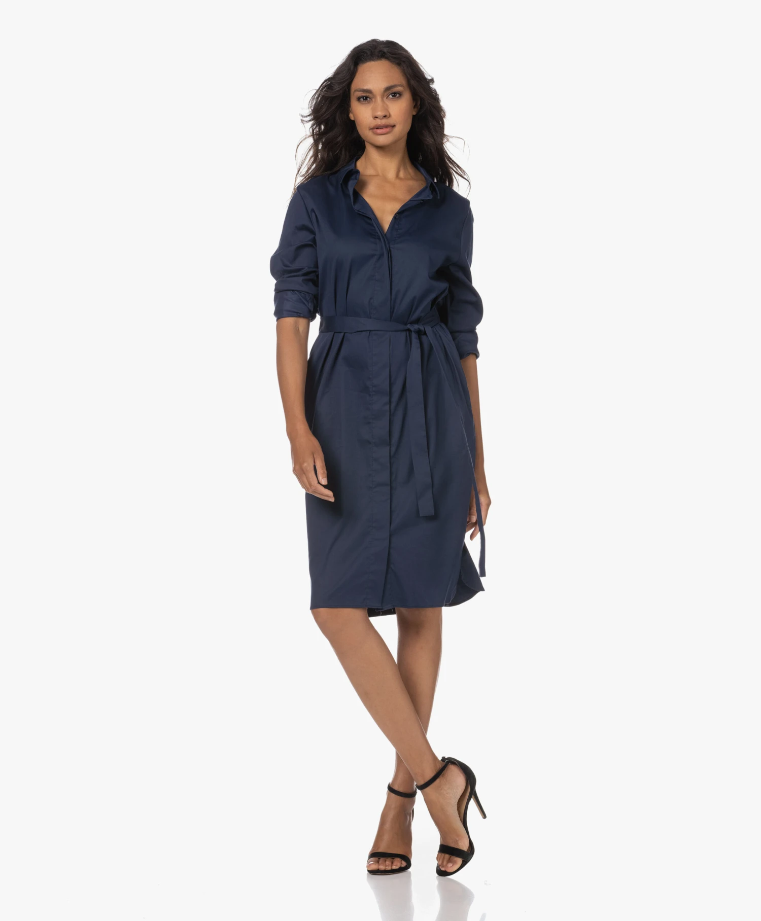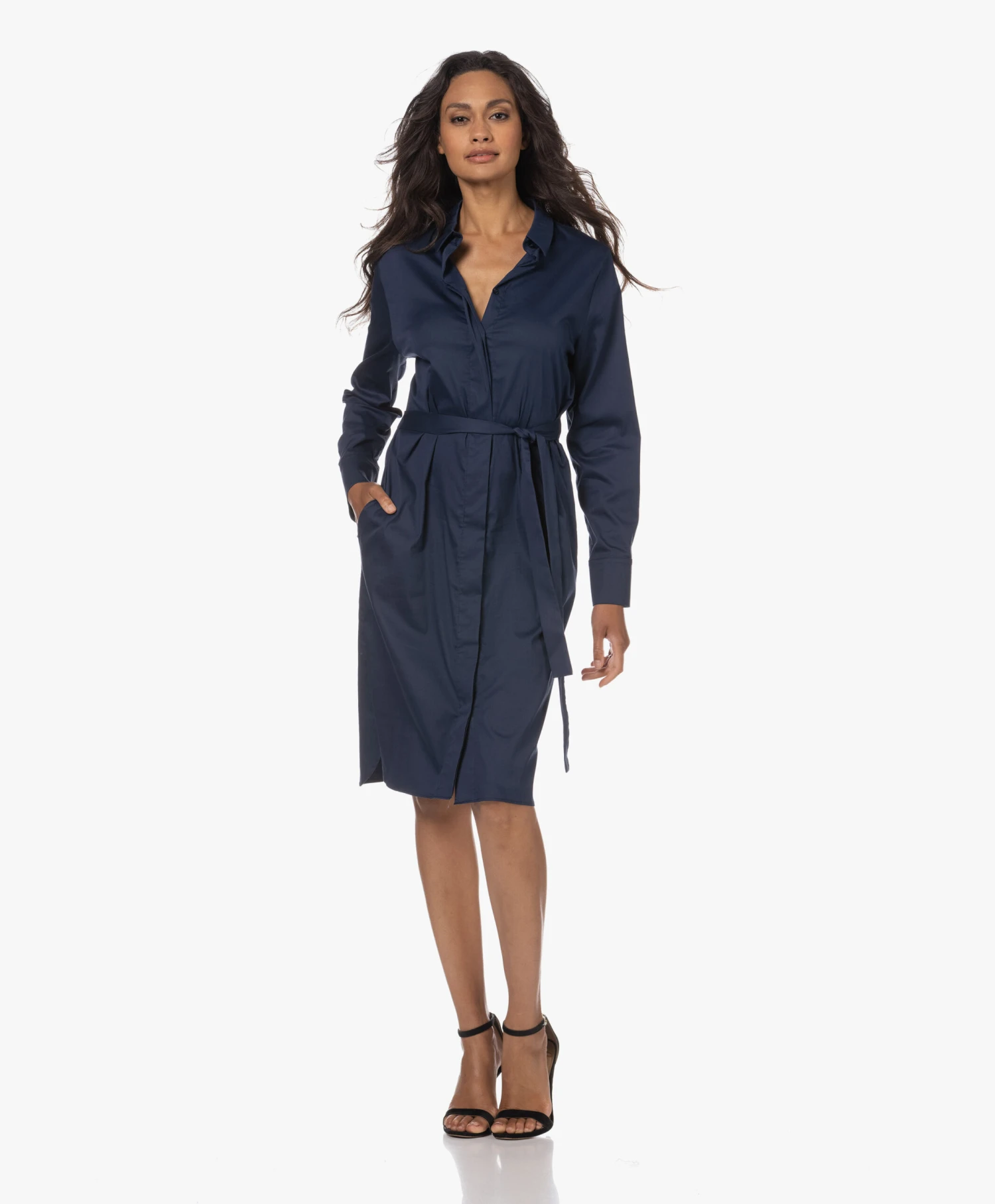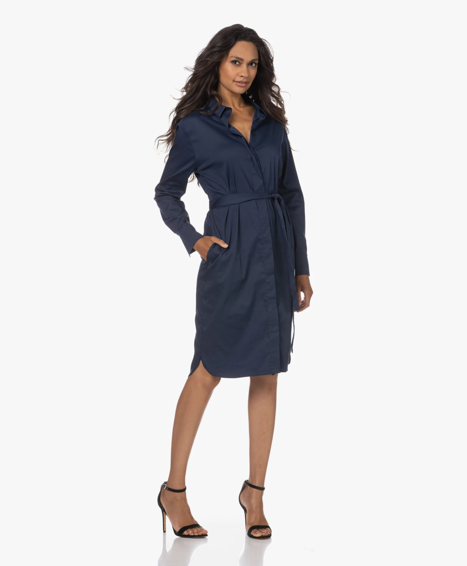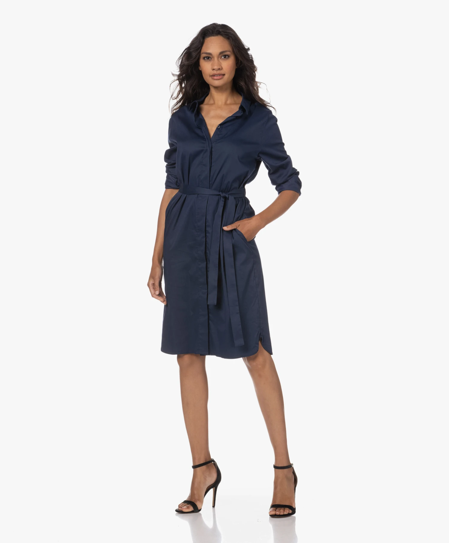 Veelzijdig, representatief, vrouwelijk: de blousejurk is van blijvende waarde in de hedendaagse garderobe. LaSalle’s navy jurk van satijngeweven katoenmix is voorzien van een elastische achtertaille en een in de zijnaad gefixeerde strikceintuur – zelfs als je de jurk opengeknoopt als blouse draagt laat het silhouet een duidelijke taille zien.