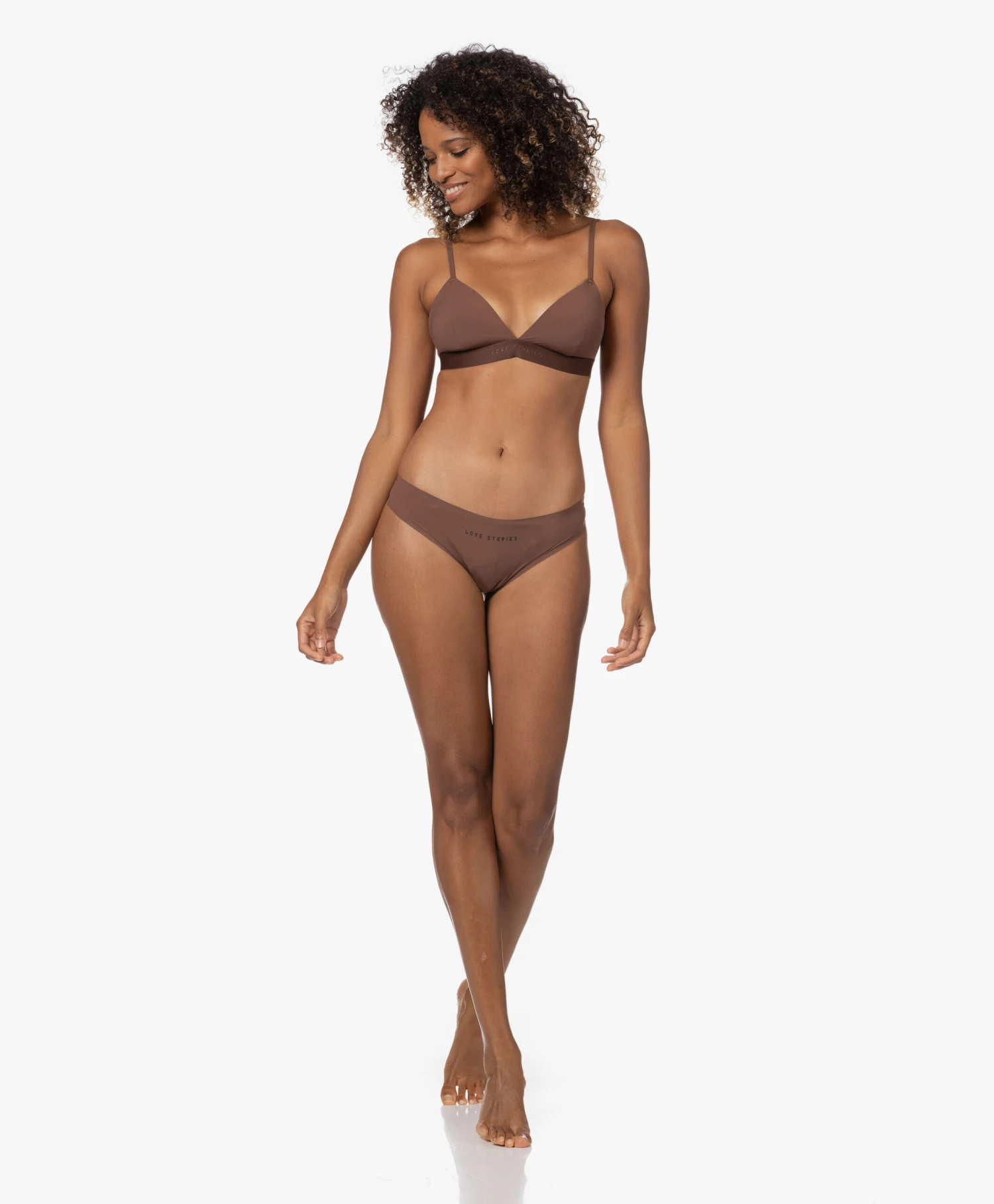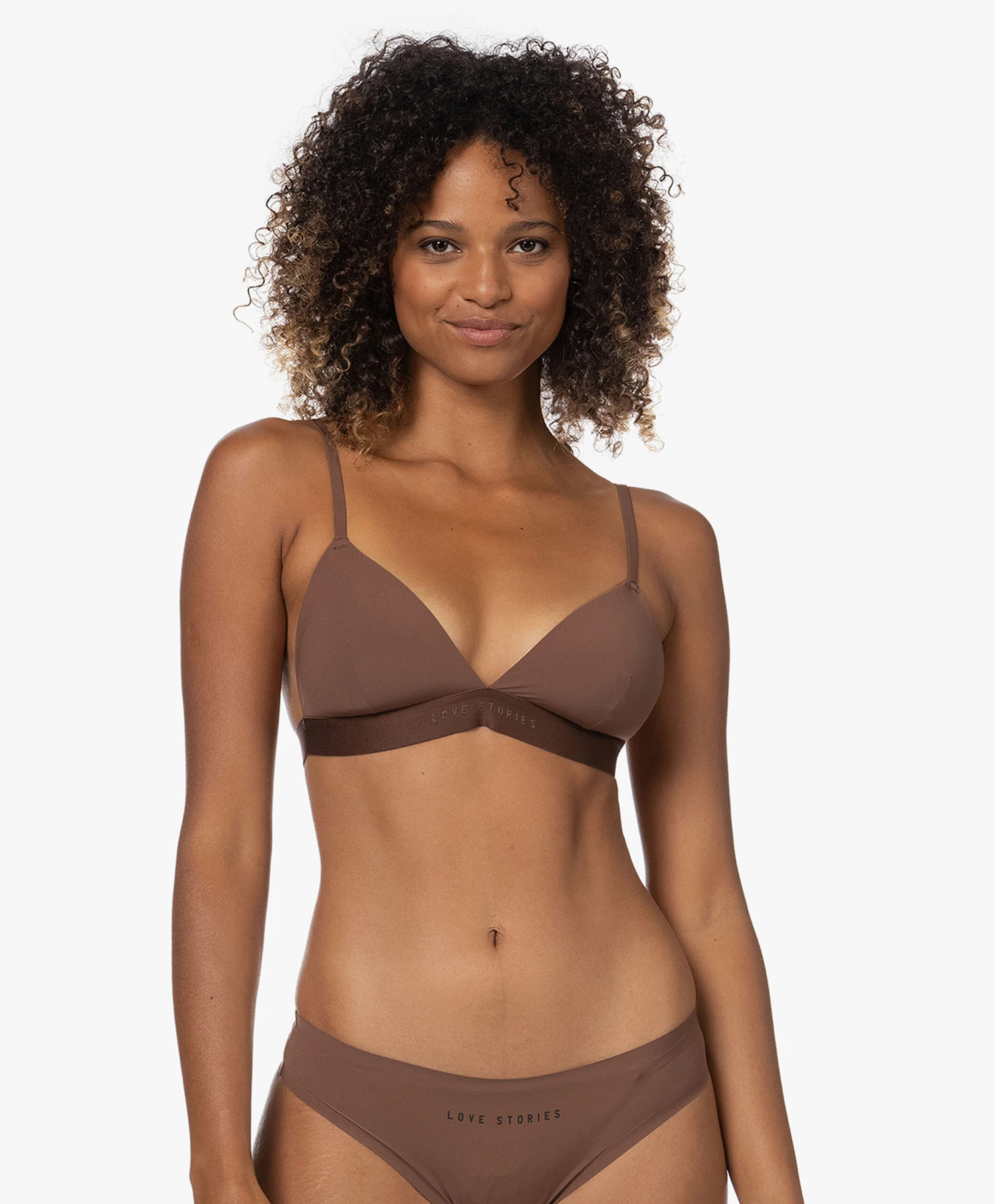 Be prepared want bralette Coco van Love Stories is om van te watertanden. Is het niet de donkerbruine kleurtint met ton-sur-ton elastische onderband waar het merklogo siert, dan zijn het wel de triangelvormige cups die licht gewatteerd zijn om jou op je aller vrouwelijkst te laten voelen – inclusief perfecte fit! Kortom: een design om mee te mixen & matchen, maar waar uiteraard ook een bijpassende string bij verkrijgbaar is voor een verleidelijke set.