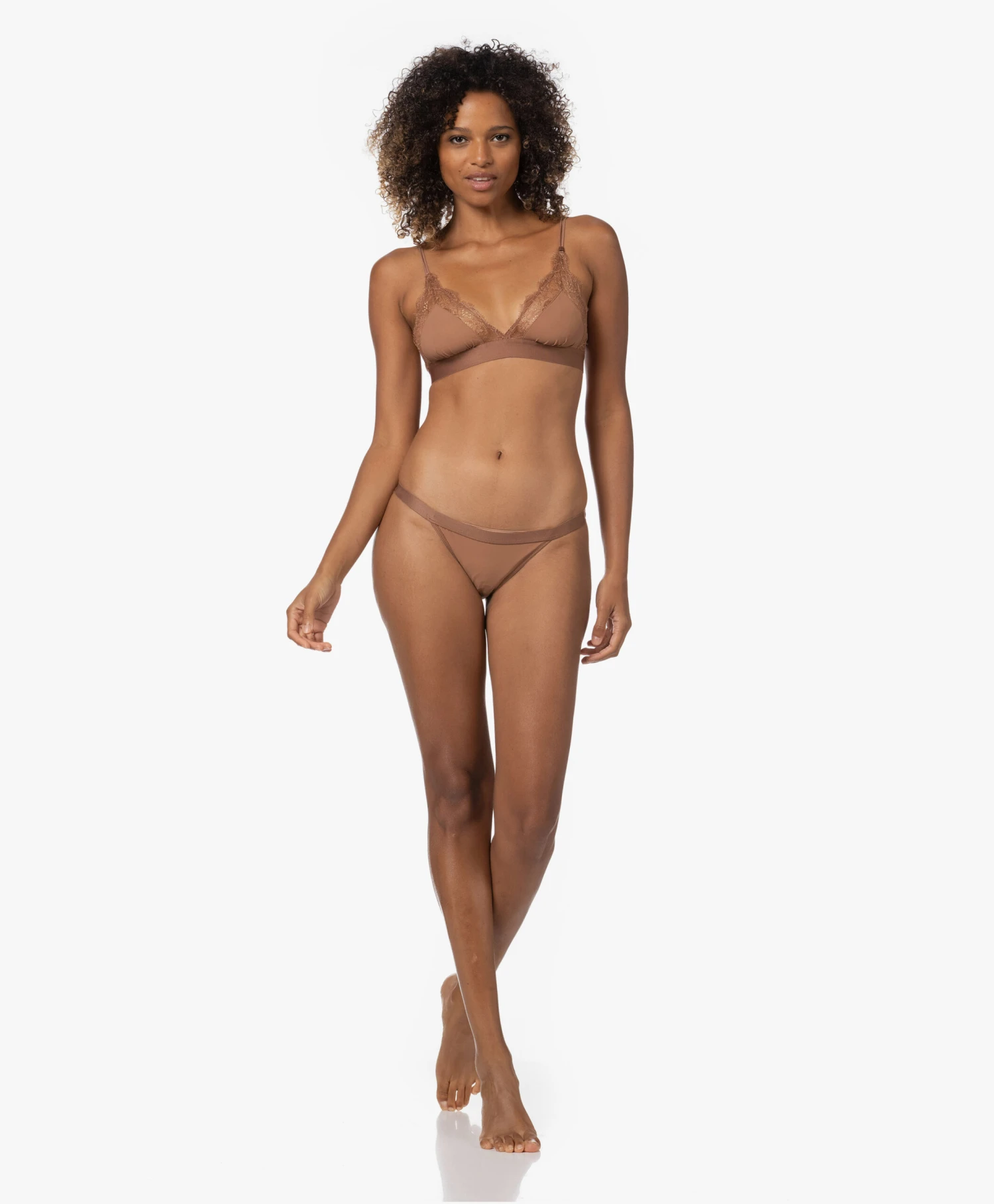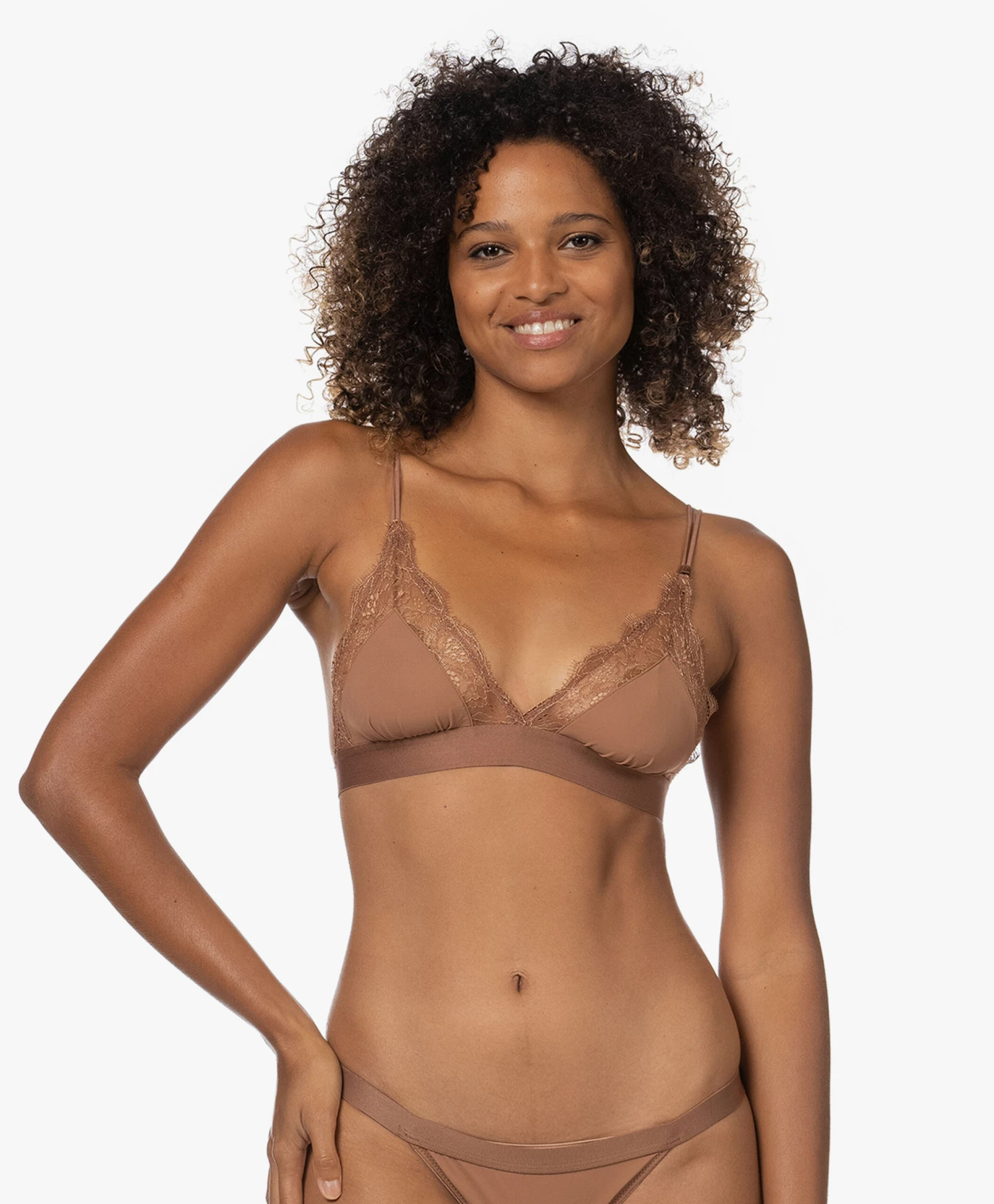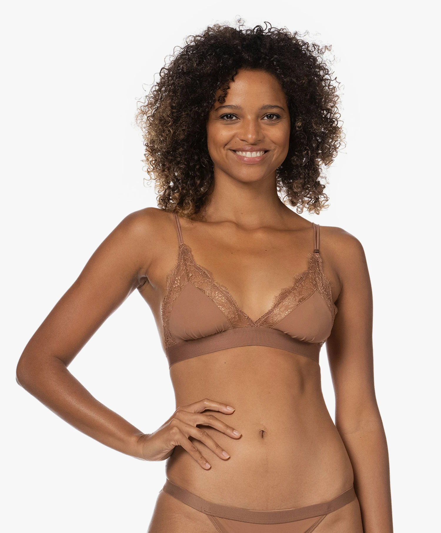 De Love Lace bralette van Love Stories is misschien wel dé meest iconische stijl van het merk, gekenmerkt door de smalle triangelvormige cups met een brede omlijsting van semi-transparant geschulpt kant. Deze ultra-comfortabele, soft-cup mokkabruine bralette heeft elastische, verstelbare grosgrain schouderbandjes en een brede elastische band voor een goede ondersteuning.