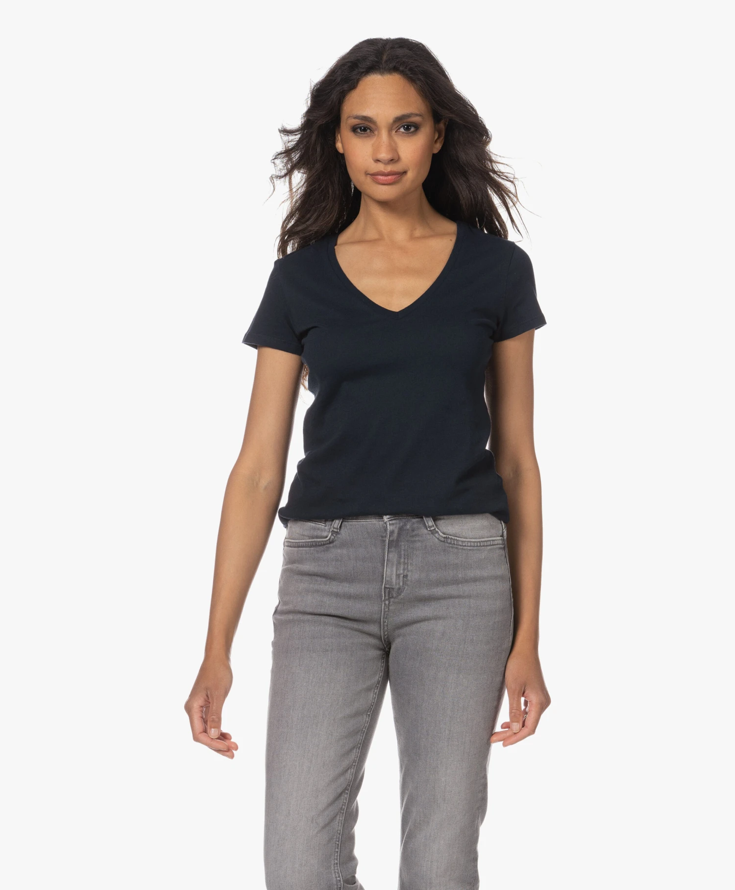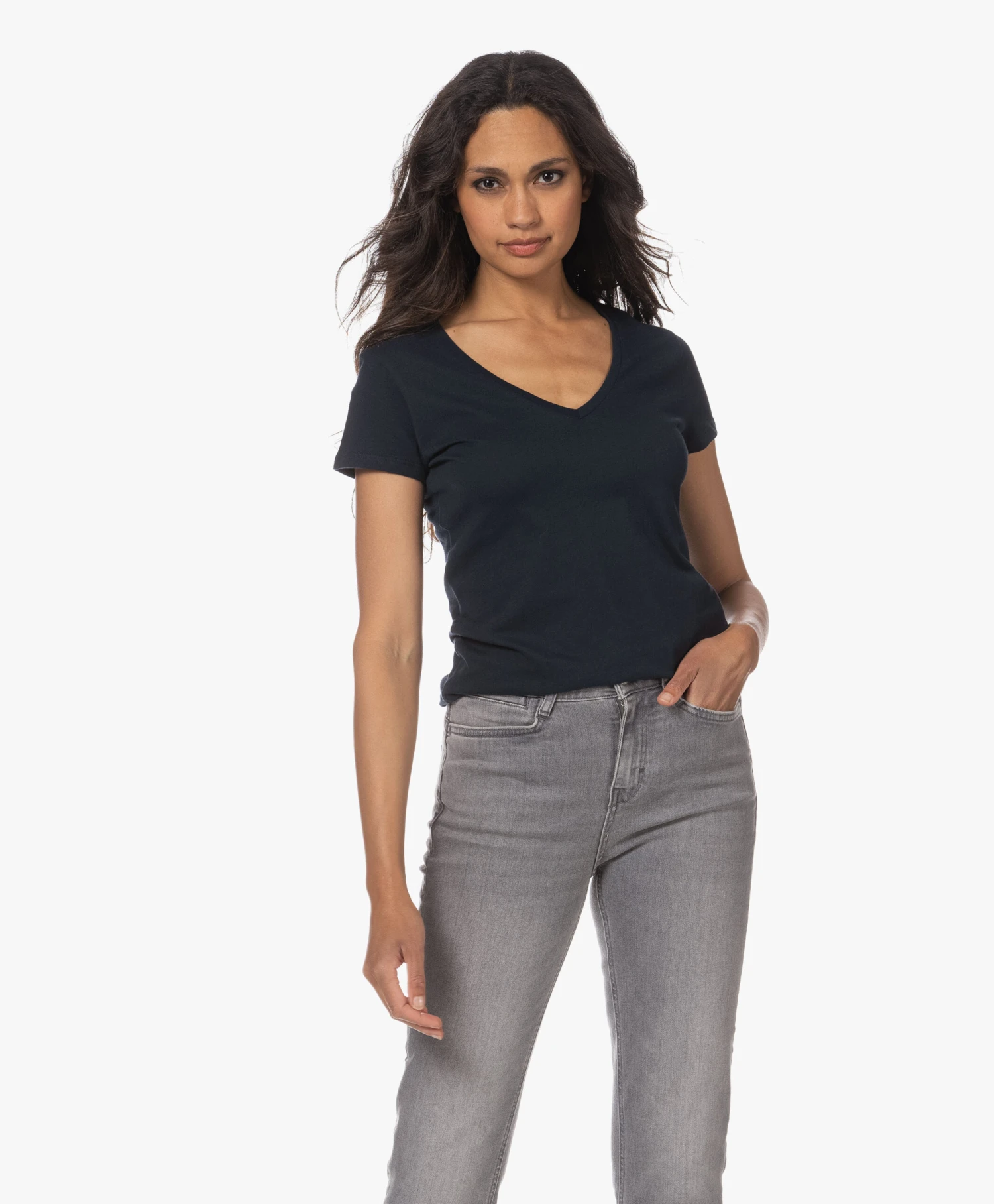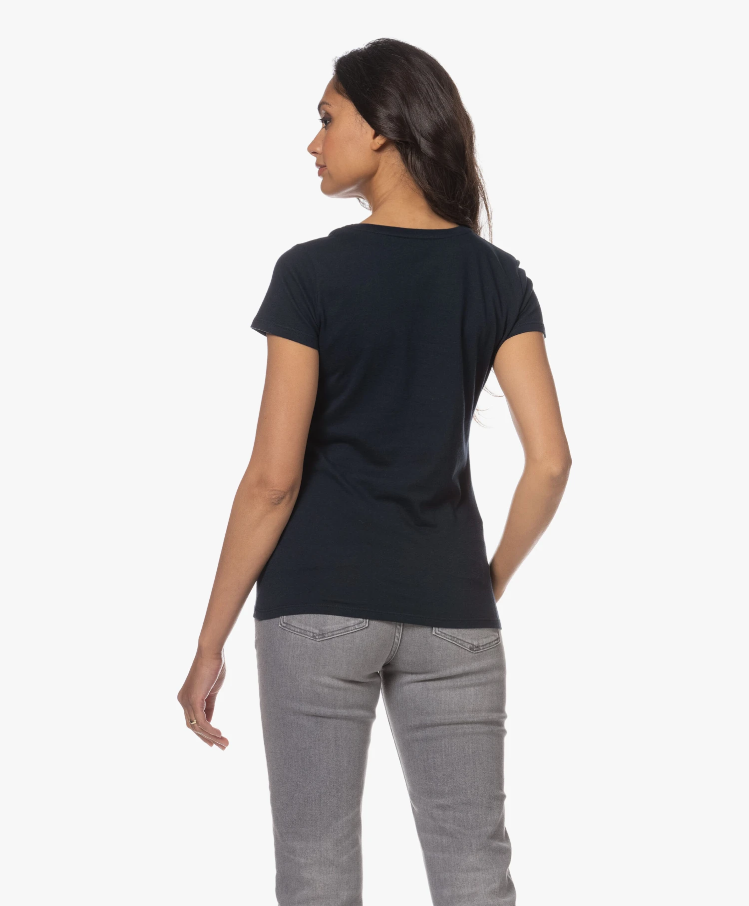Een donkerblauw katoenen T-shirt met een net iets diepere V-hals: daar wordt elke garderobe blij van. De niet-te-lichte en niet-te-zware single-jersey van deze vrouwelijke basic van Majestic Filatures style je net zo makkelijk ’up als ‘down’. Gooi naast de voor de hand liggende casual combi ook eens een blazer in de mix. Dit T-shirt kan alles aan.