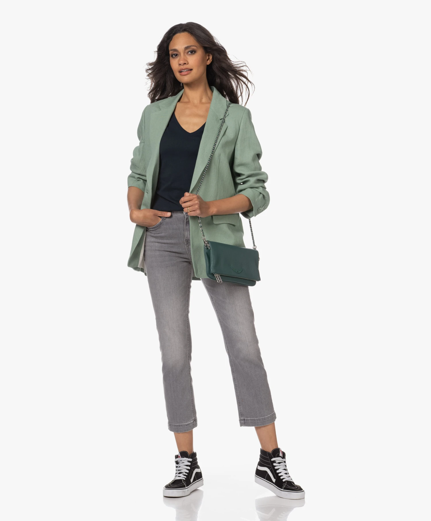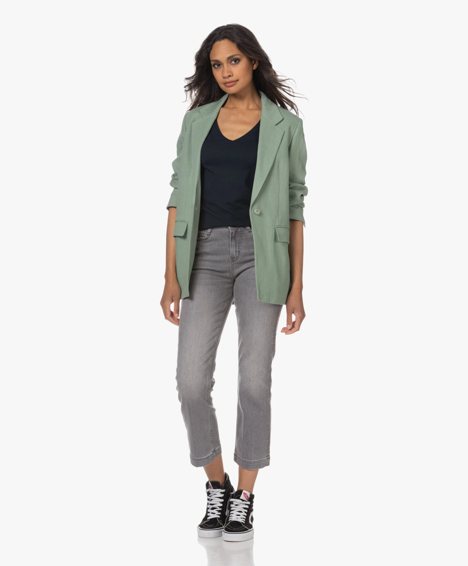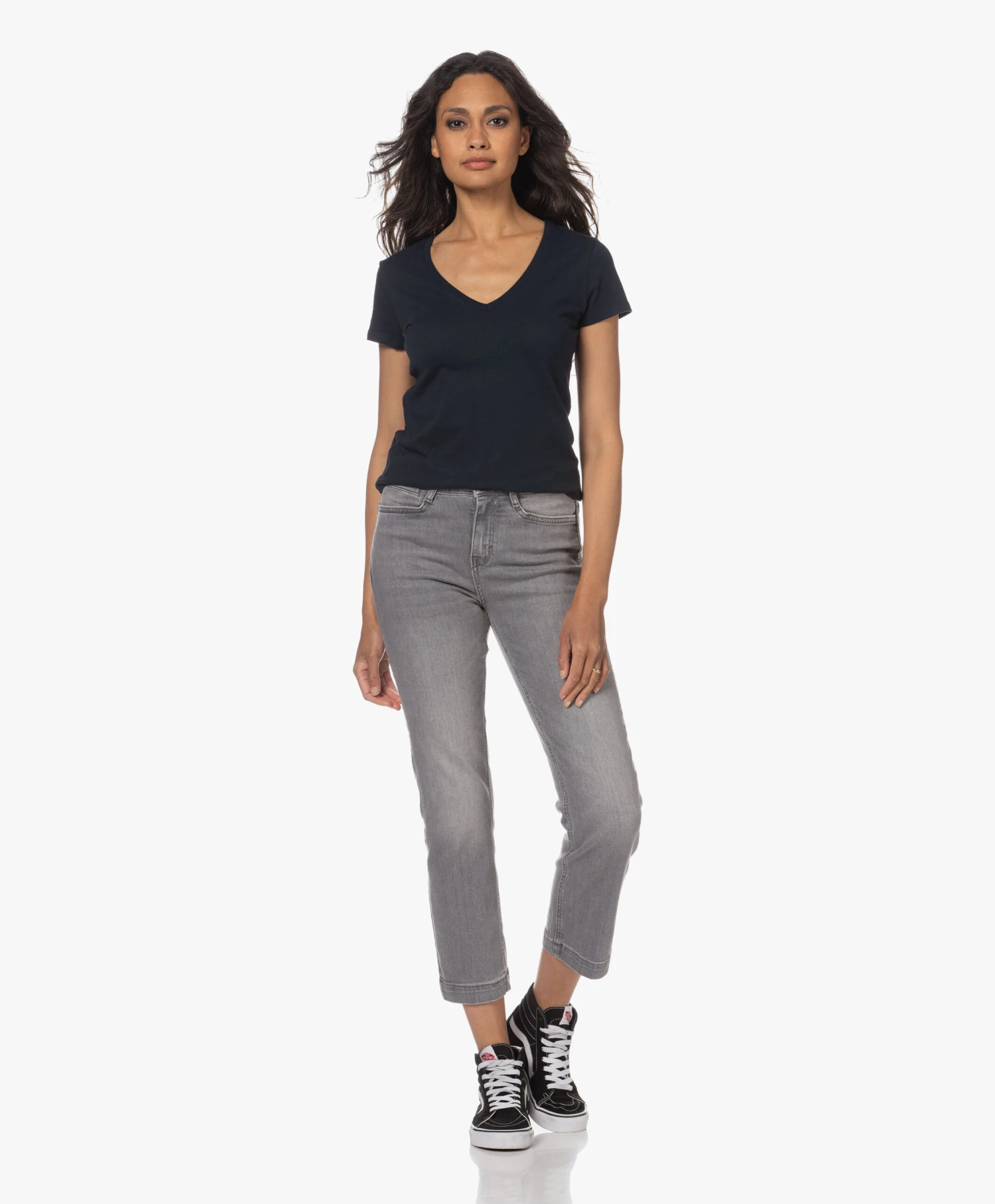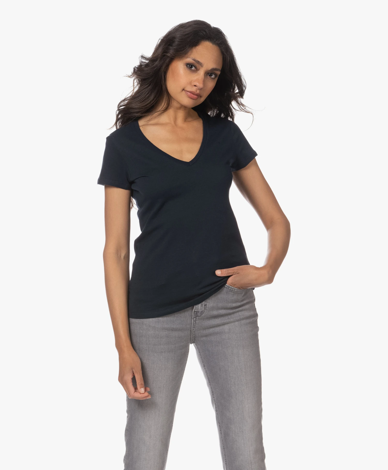 Een donkerblauw katoenen T-shirt met een net iets diepere V-hals: daar wordt elke garderobe blij van. De niet-te-lichte en niet-te-zware single-jersey van deze vrouwelijke basic van Majestic Filatures style je net zo makkelijk ’up als ‘down’. Gooi naast de voor de hand liggende casual combi ook eens een blazer in de mix. Dit T-shirt kan alles aan.