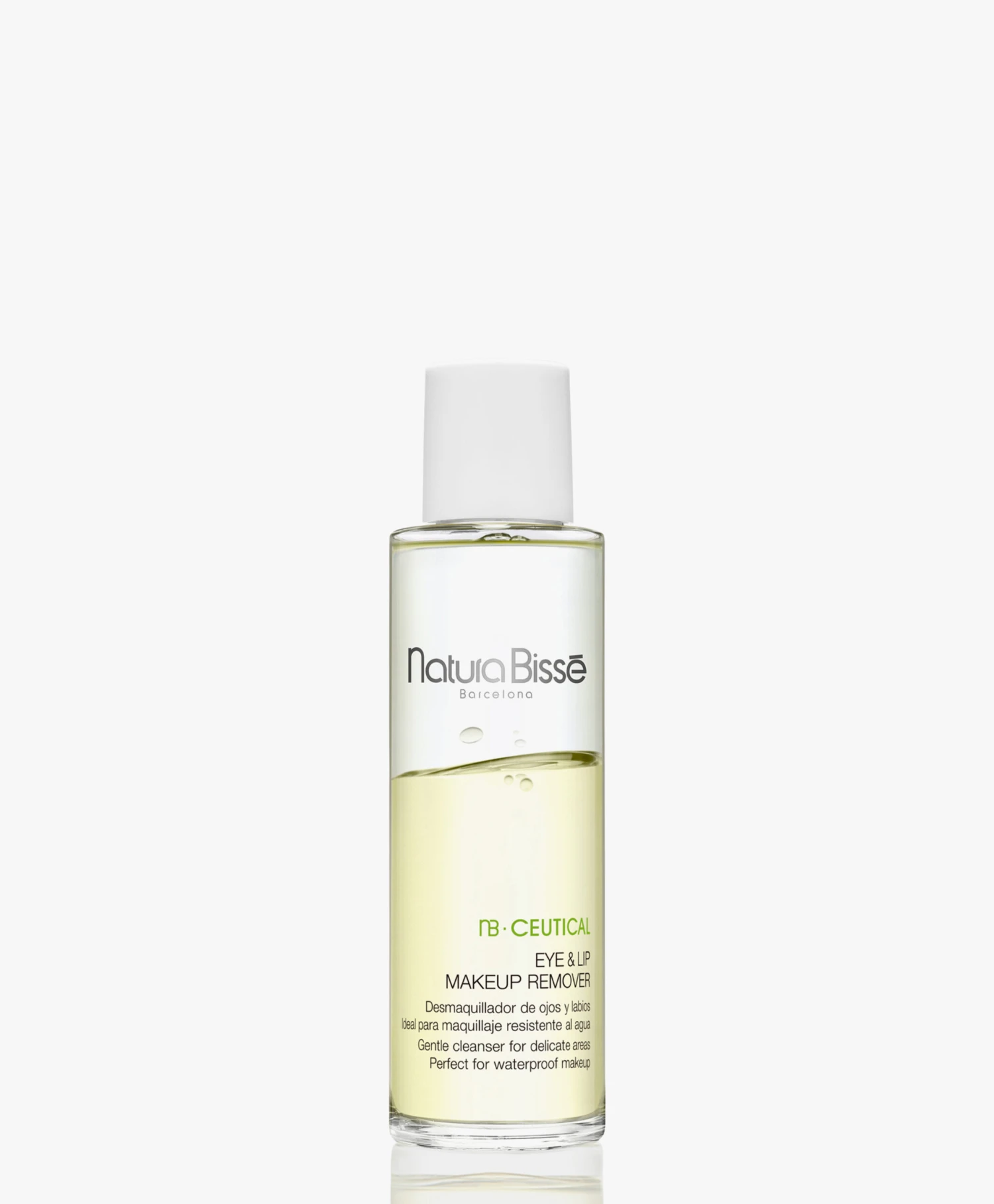 De NB Ceutical collectie van Natura Bissé richt zich op het beschermen, verzachten, kalmeren en verzorgen van de meest gevoelige huid. De hypoallergene producten gaan huidveroudering tegen, versterken de huidbarrière en stimuleren het herstelproces van de huid. Deze make-up remover voor ogen en lippen is een tweefasige reiniger met een oliefase voor het effectief verwijderen van (waterproof) make-up en onzuiverheden en een waterfase met sterk hydraterende eigenschappen. De make-up remover is doordrenkt met groene thee om de delicate huid rond de ogen en de lippen te kalmeren en verzachten.