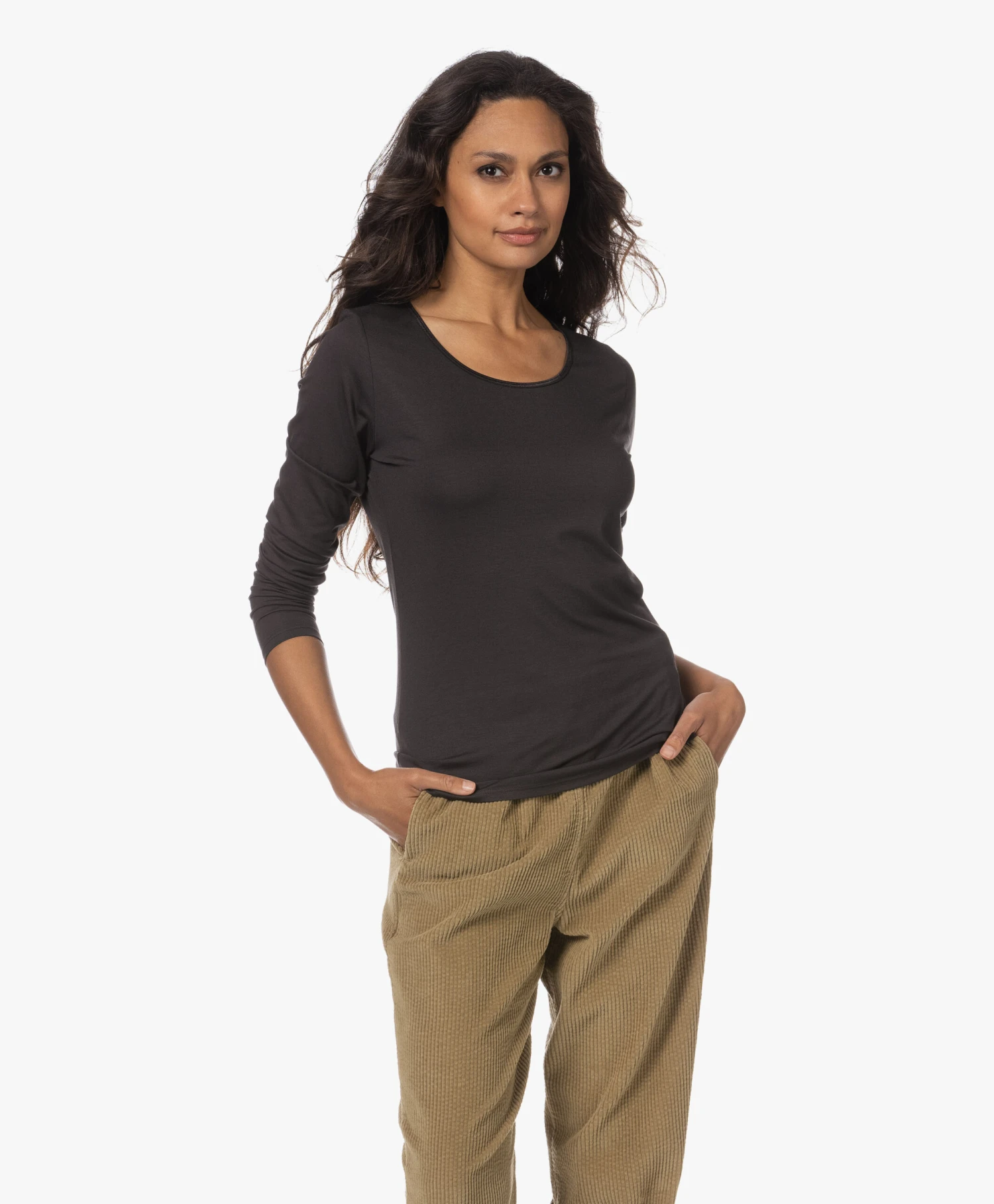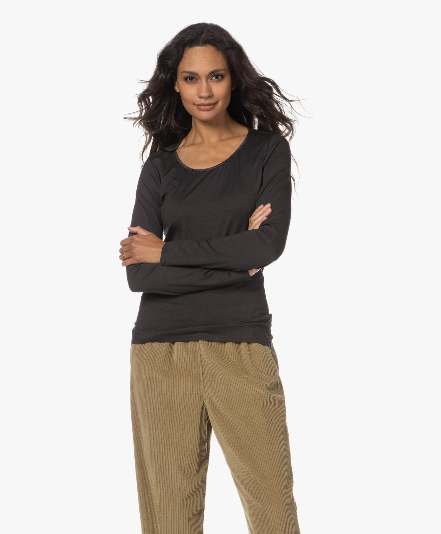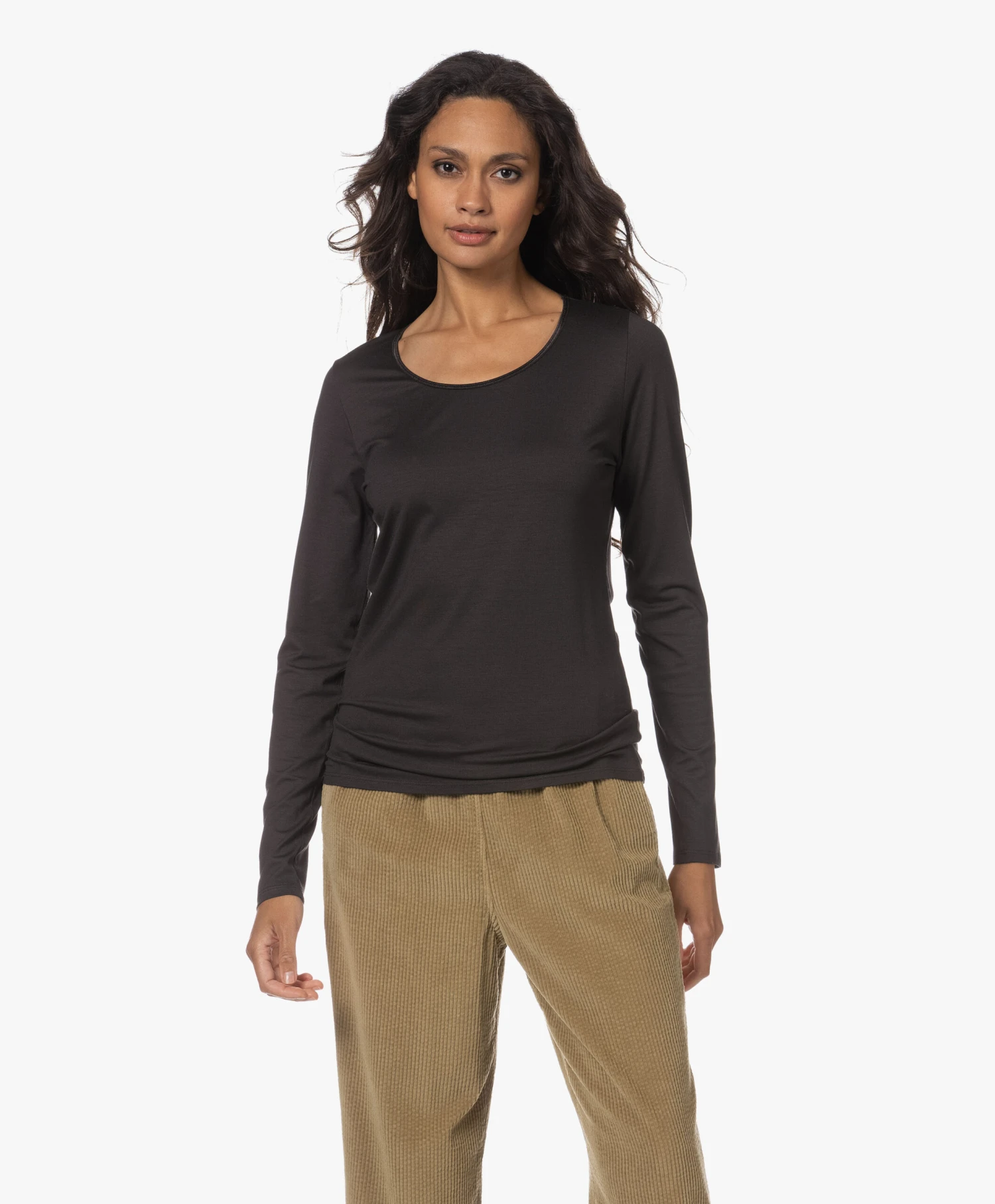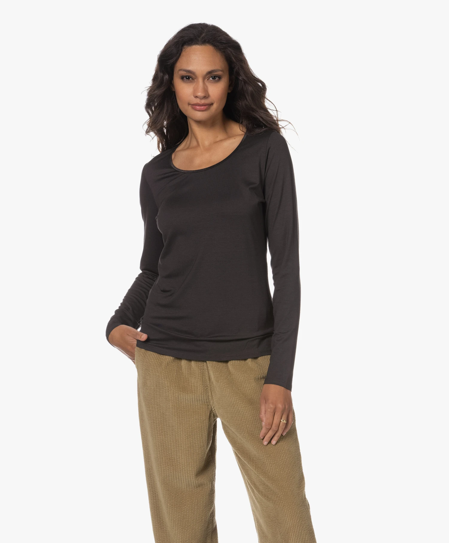 no man’s land is een betrouwbaar adres voor basic essentials die net even wat verfijnder en vrouwelijker zijn. Bij dit licht aangesloten donkerbruine T-shirt is het de smalle halsbies van glanzende stretchsatijn die het verschil maakt. Gemaakt van zachte stretchviscose single-jersey.