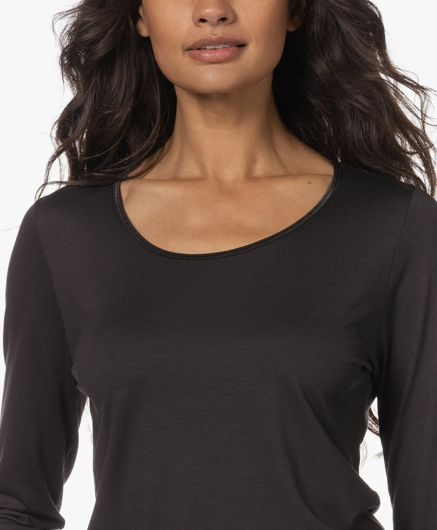 – Uitgediepte ronde hals, halsbies van stretchsatijn
