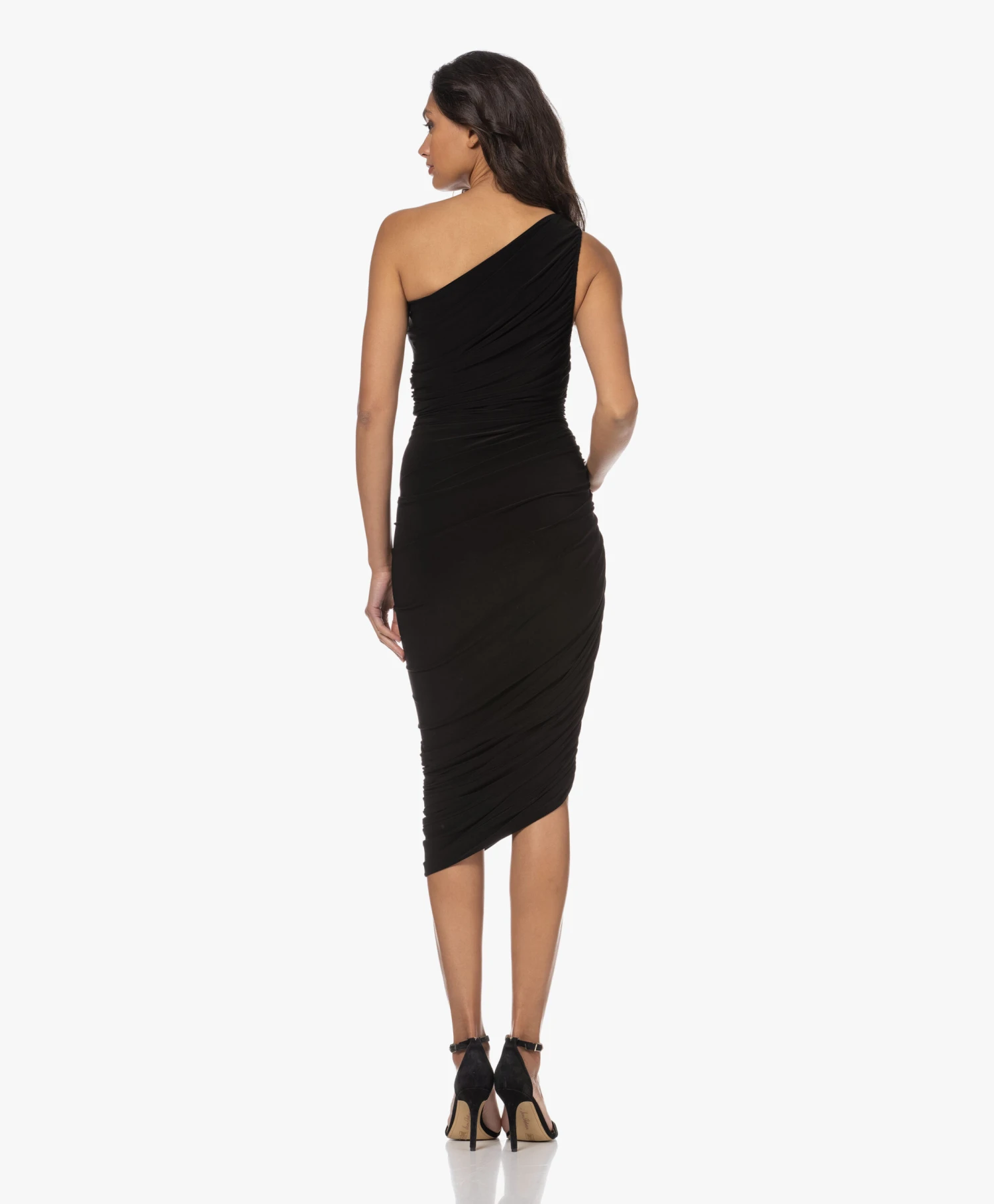 Een ‘fail-proof’ jurk om gelegenheid na gelegenheid, seizoen na seizoen en jaar na jaar weer uit de kast te pakken: de zwarte Diana jurk van Norma Kamali. De kenmerkende rimpelplooien omlijsten je vrouwelijke silhouet terwijl ze tegelijkertijd het een en ander verhullen – daar draagt ook de geïntegreerde bodysuit aan bij. Het asymmetrische karakter van de one-shoulder halslijn wordt weerspiegeld bij de zoom. Bovendien is de zwaarvallende tech jersey extreem zacht, soepel, mat en stretchy.