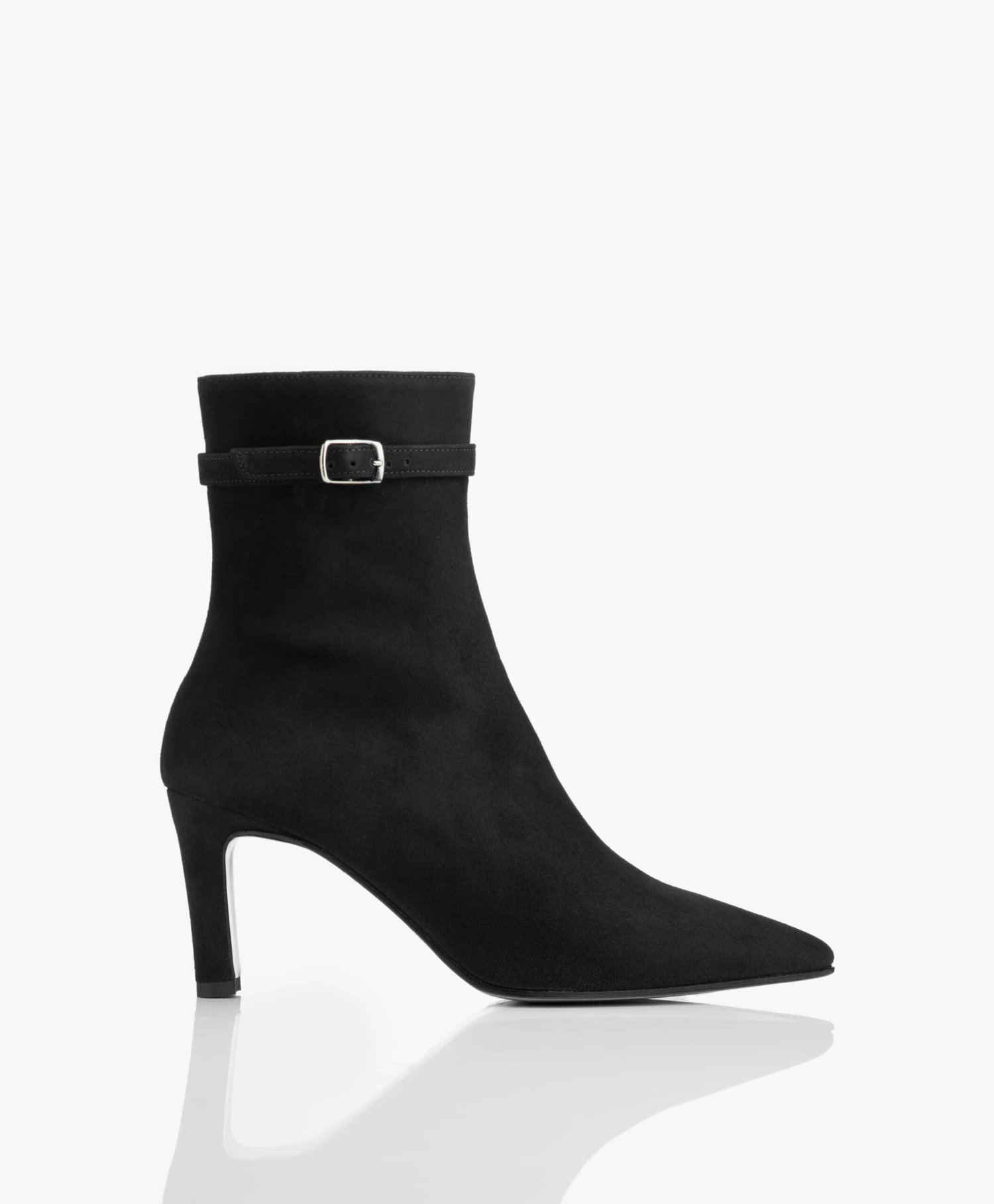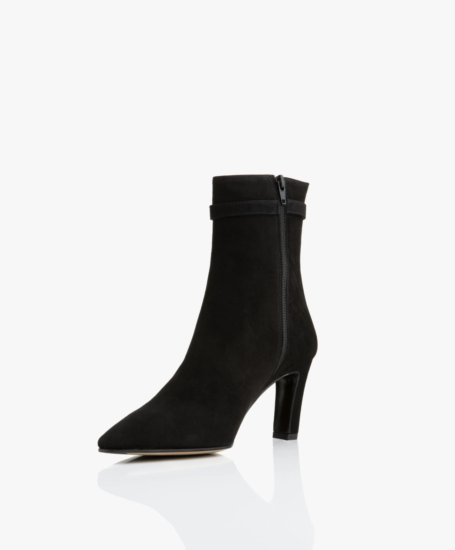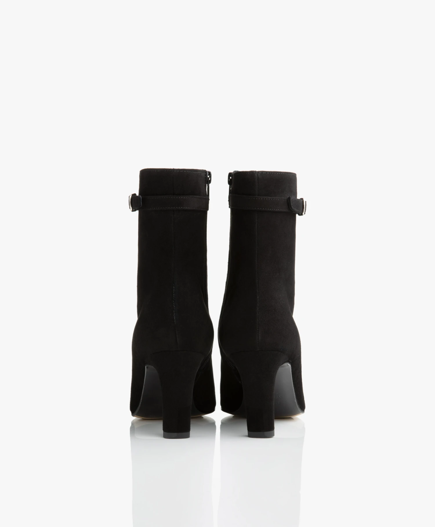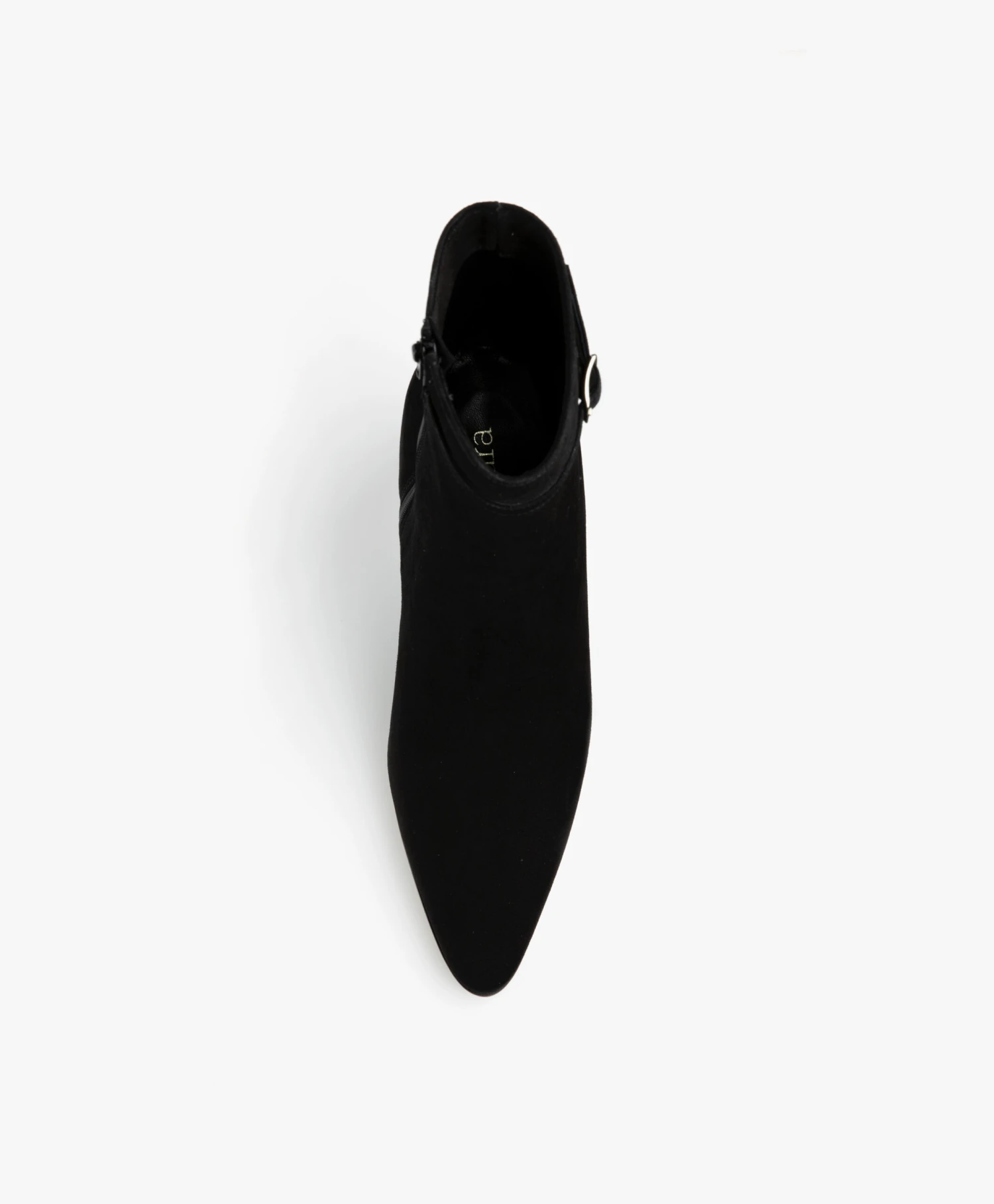 Deze stijlvolle enkellaarzen van Panara zijn uitgevoerd in een zwarte, hoogwaardige suède kwaliteit. Ontworpen met een decoratief gespbandje, een met suède bekleedde middelhoge hak, een elegante schachthoogte en een puntige neus voor een vrouwelijke uitstraling. Door de ritssluiting aan de binnenkant zijn de laarzen gemakkelijk aan te trekken.