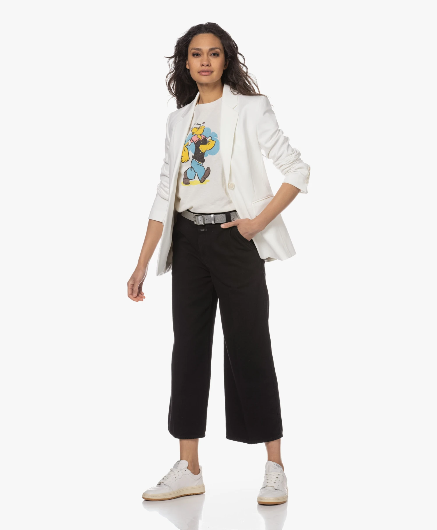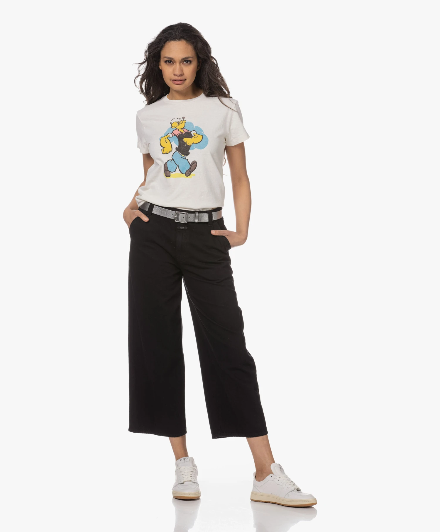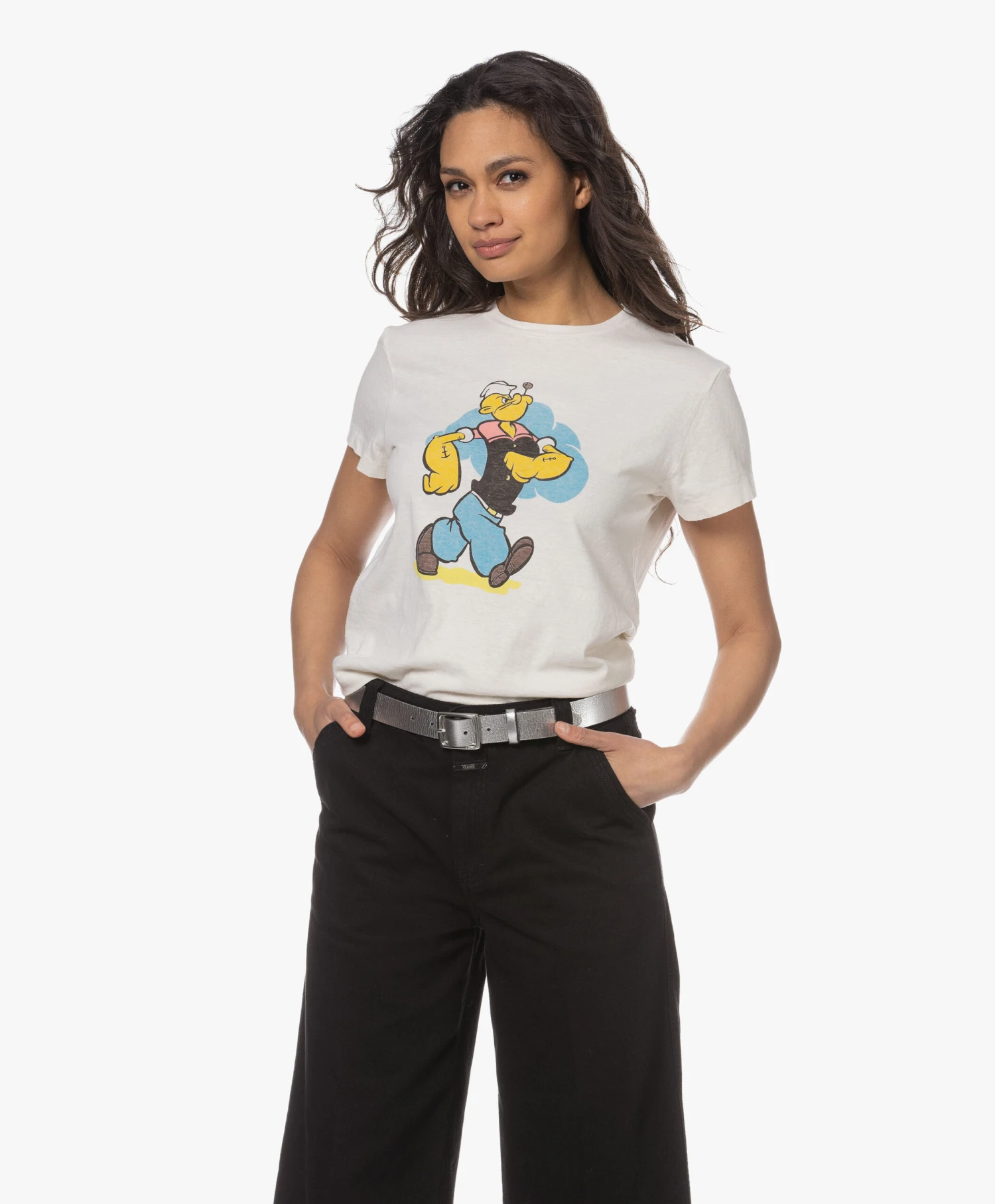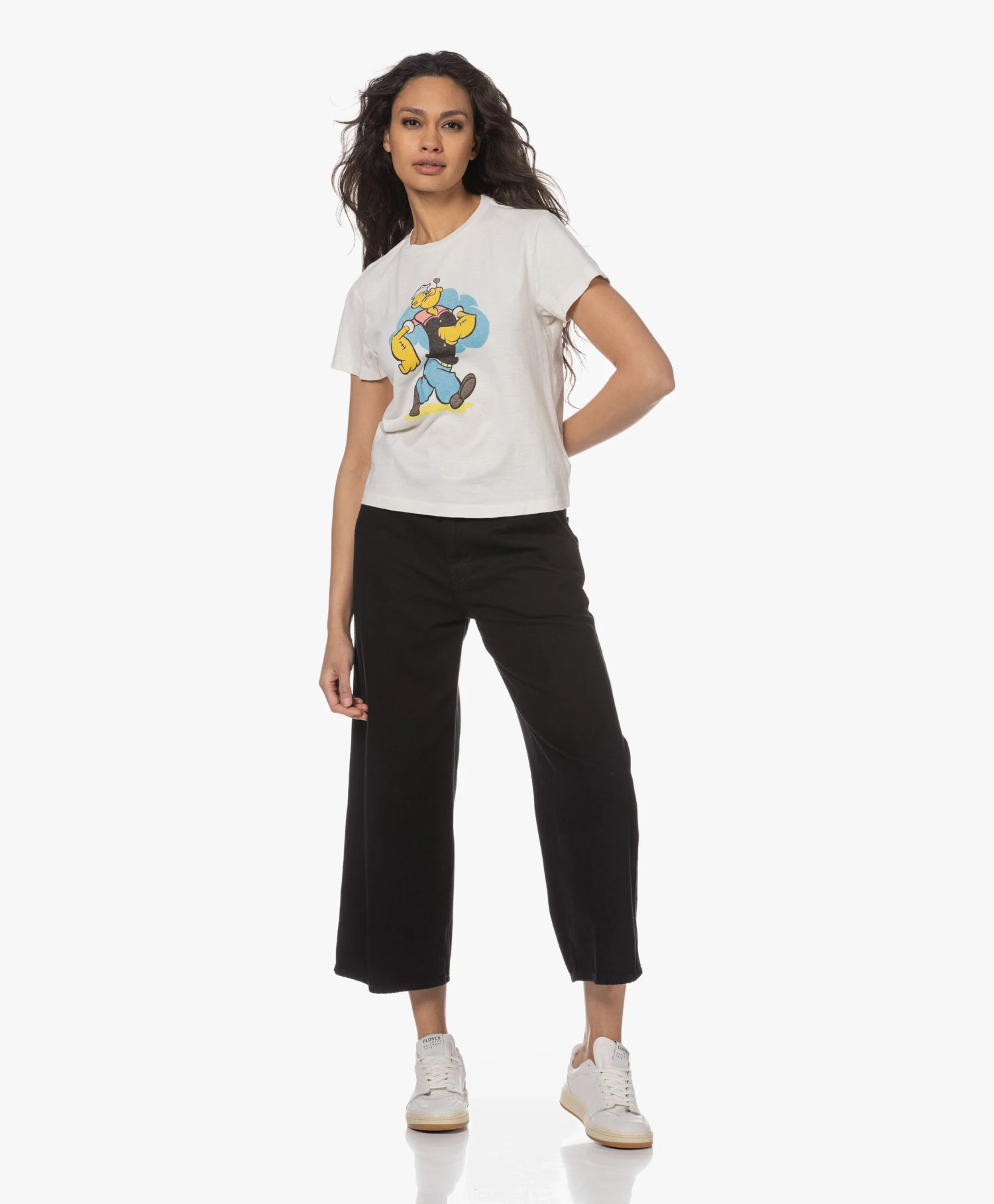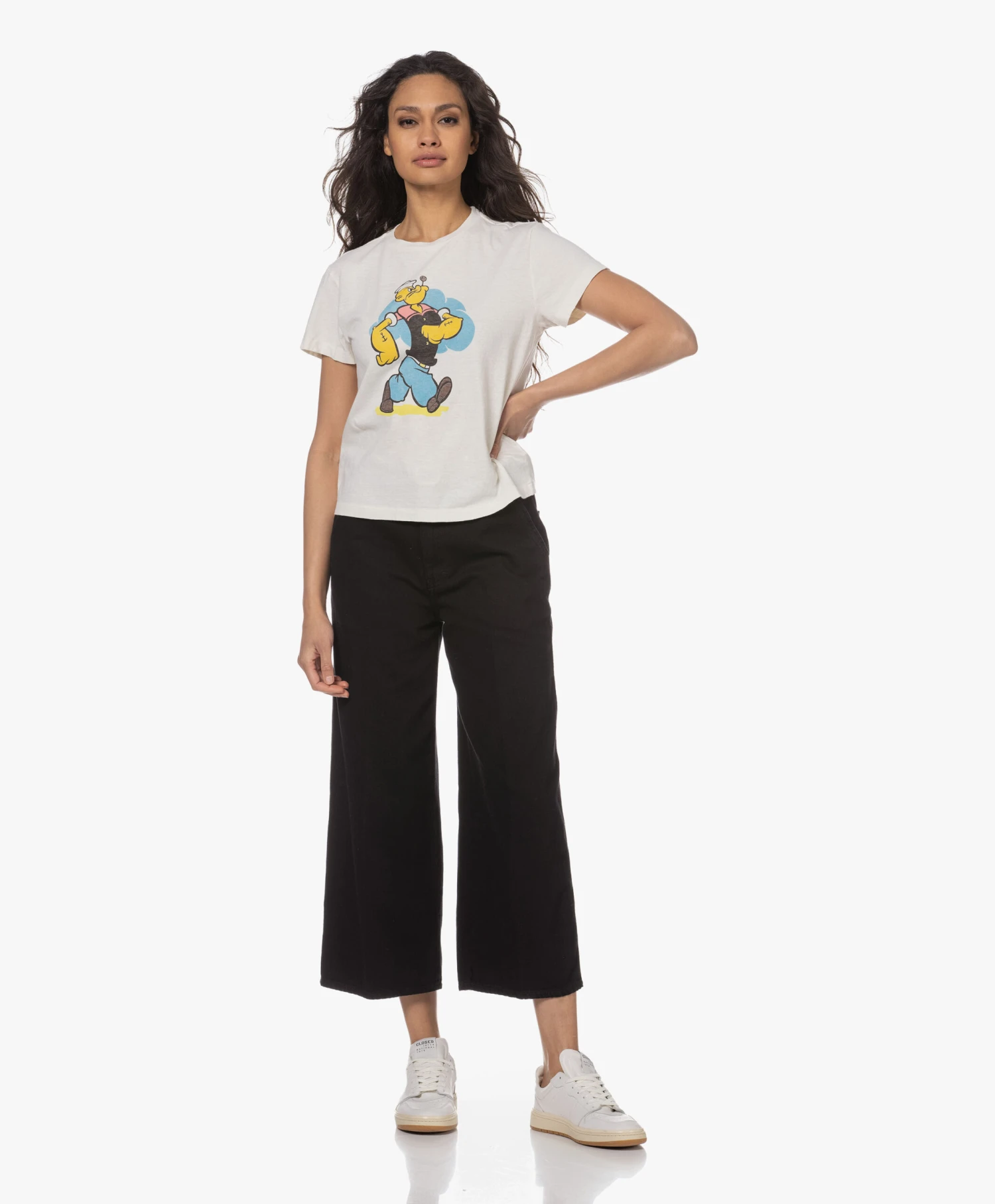 De Classic Tee van RE/DONE heeft misschien een tijdloze pasvorm, maar is allesbehalve basic dankzij de retro-stijl Popey graphic in blauw, geel, zwart en een vleugje rood. De Tee is vervaardigd van gewassen, puur katoenen jersey in een off-white tint.