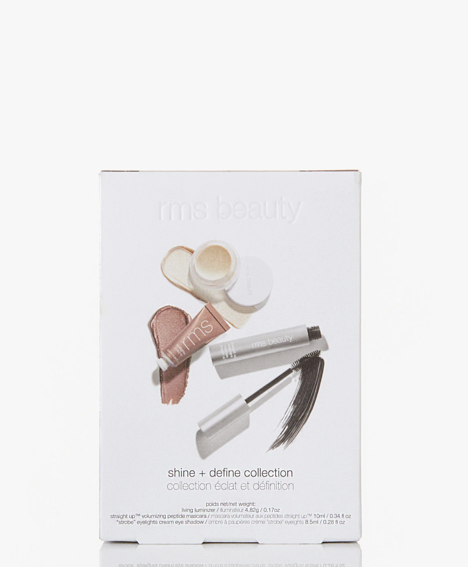 RMS Beauty brengt het ultieme Shine + Define trio voor het creëren van de perfecte look. Deze make-up set met de iconische Straight Up Peptide Mascara, de Eyelights Cream Oogschaduw in Strobe en de Living Luminizer biedt langhoudende, gladmakende, voedende en multi-inzetbare producten die iedere vrouw nodig heft. Ontwikkeld met de beste ingrediënten voor een natuurlijk en dramatisch ‘glow’.