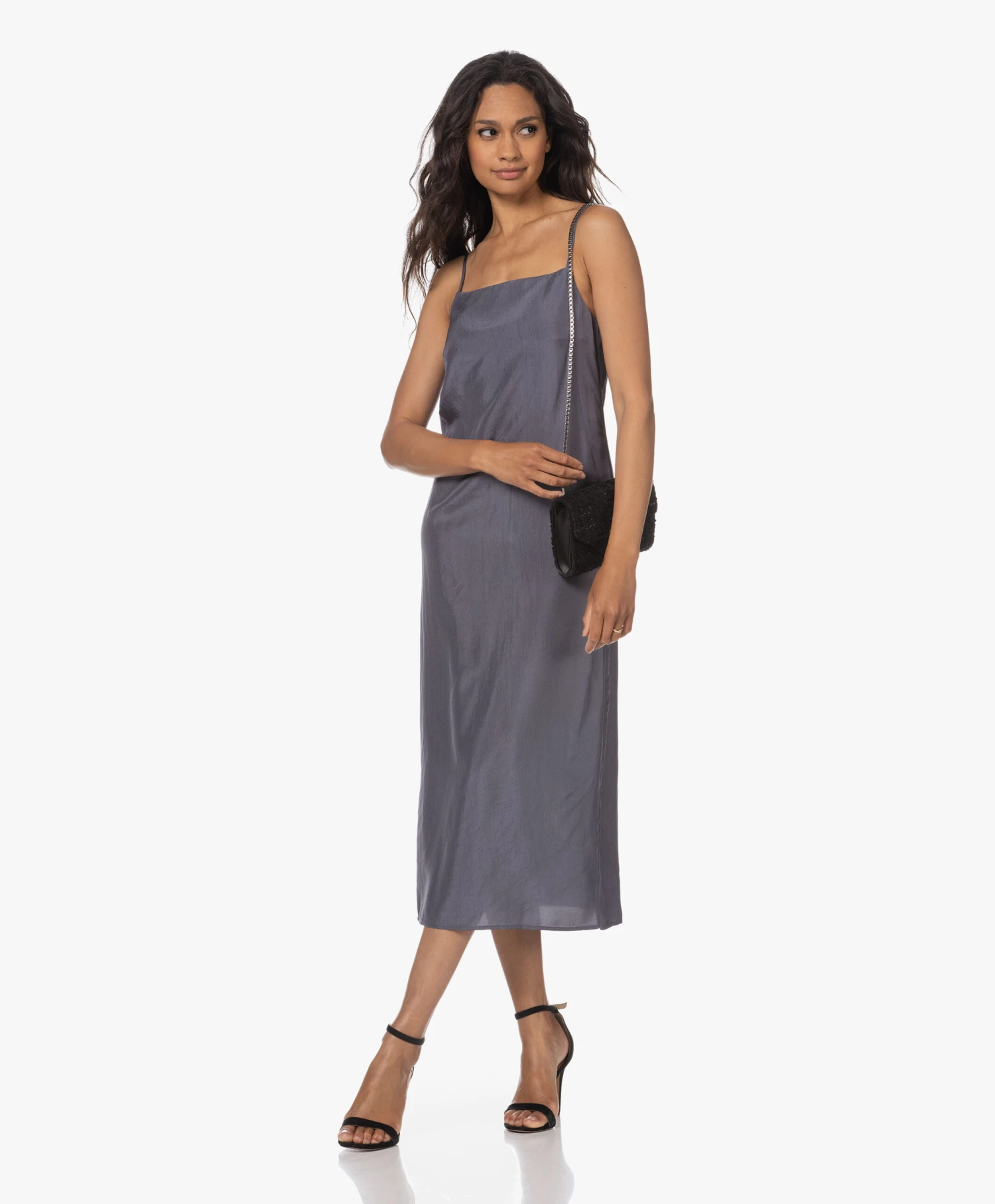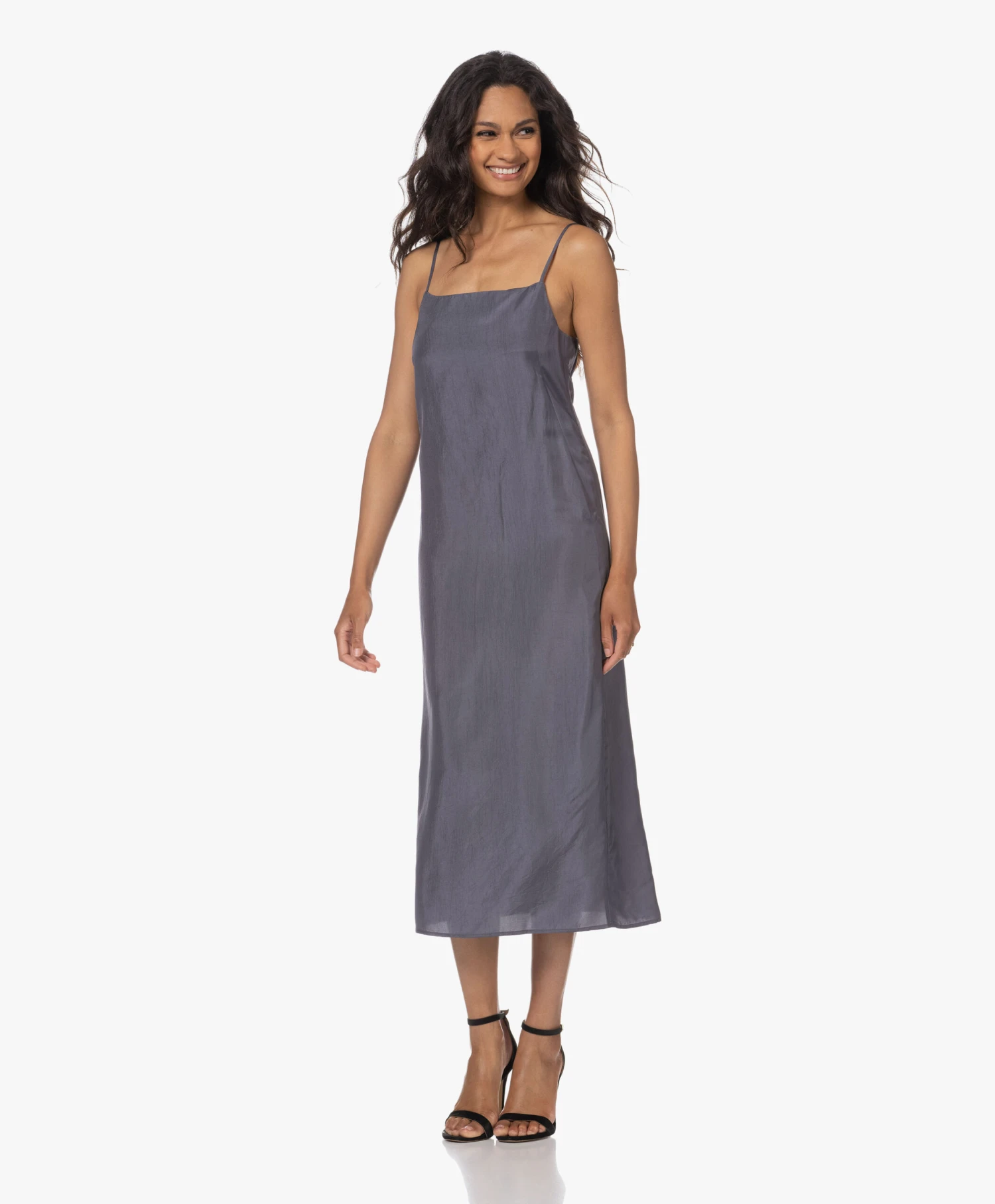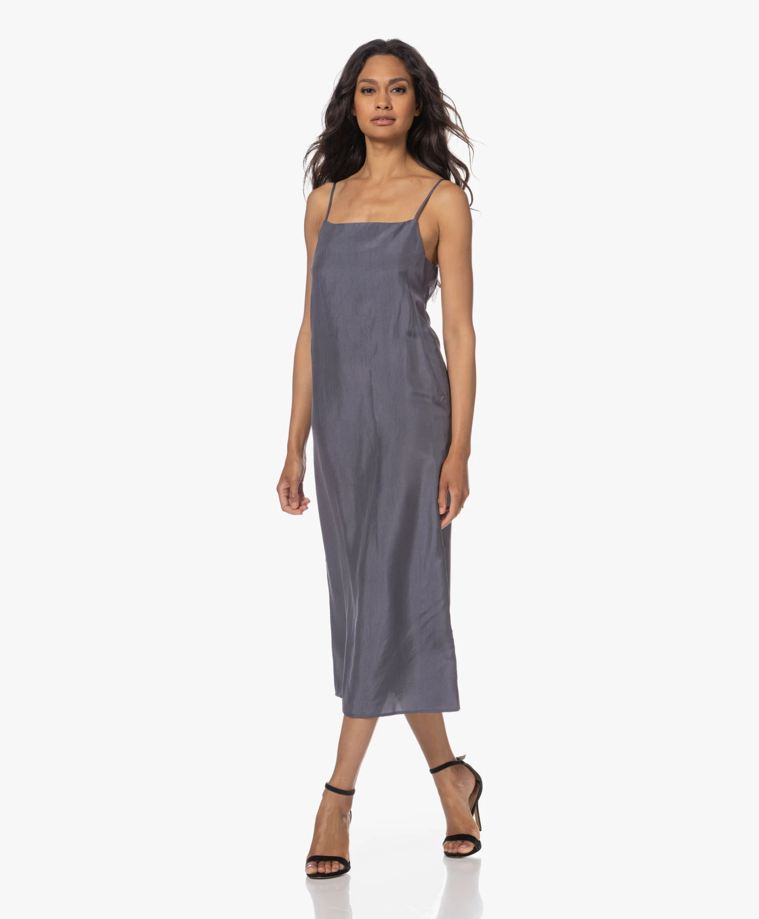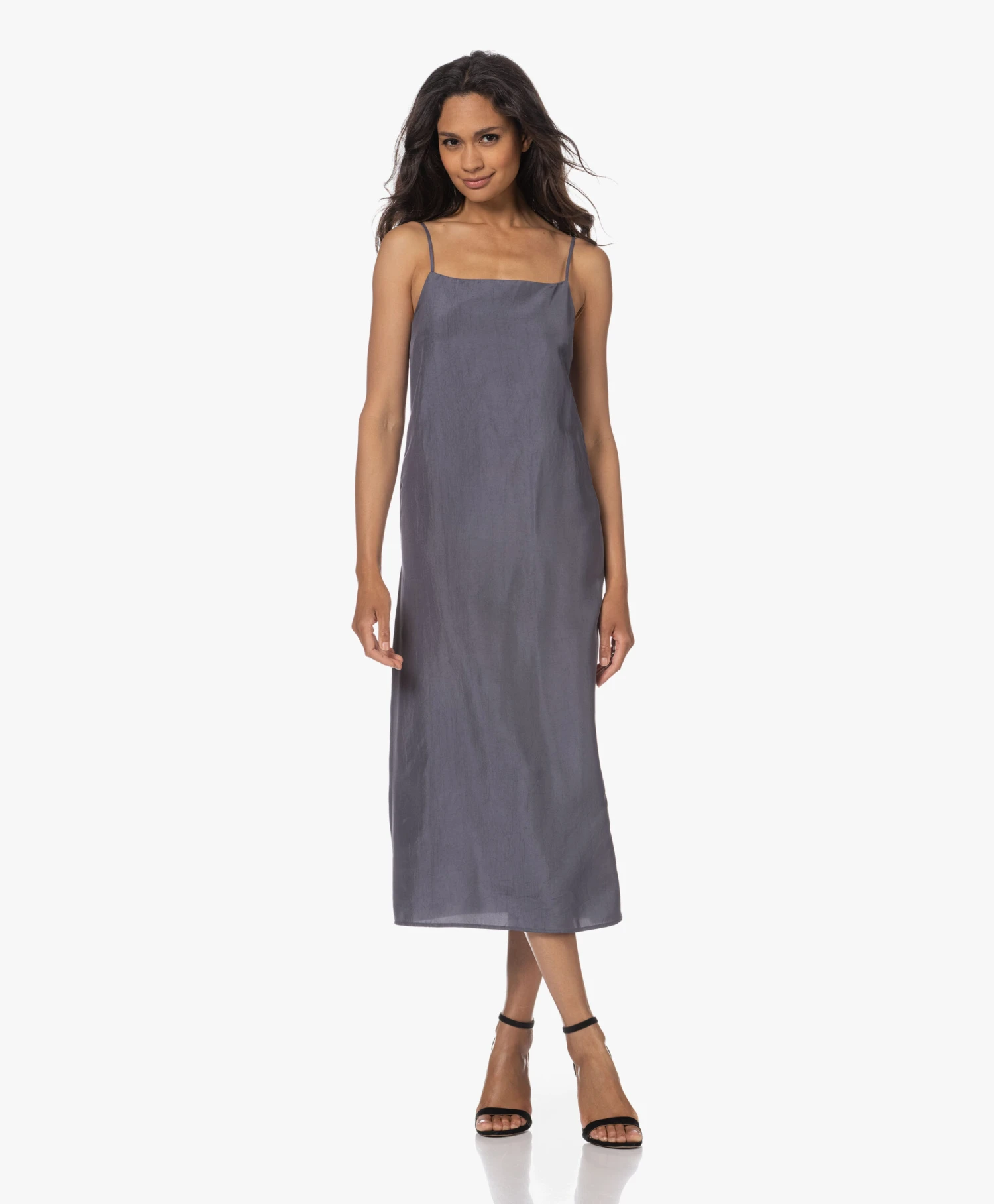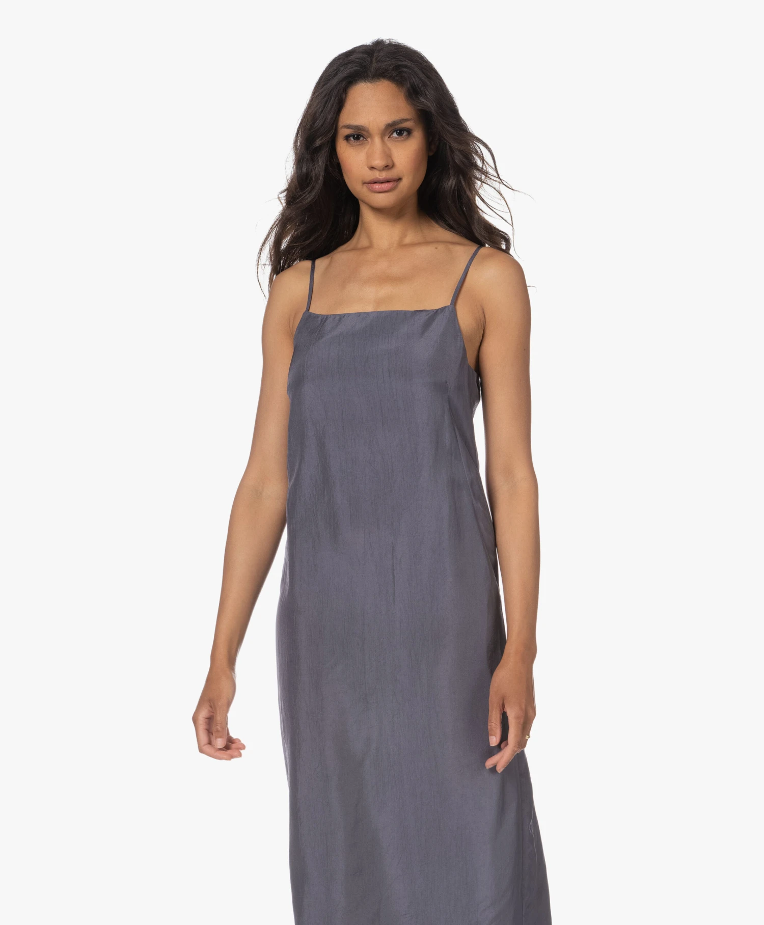 Ragfijne spaghettibandjes, een laag uitgesneden rugdécolleté en schuin-van-draad verwerkte crinkle-stof met een chique glans. Róhe’s staalgrijze Fluid ‘slip dress’ is even feestelijk als stijlvol ingetogen, het ligt er maar net aan welke gelegenheid je op de agenda hebt.