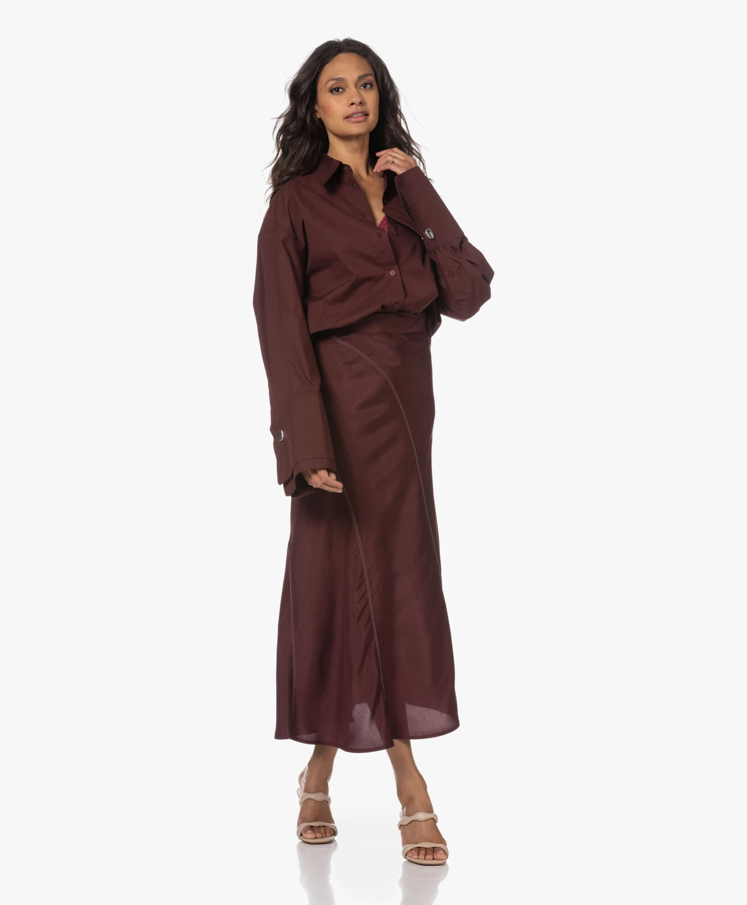 Wat een elegant silhouet: lang en sluik met een onverwachte werveling bij de zoom. Róhe’s bordeauxrode midi-rok van subtiel glanzend acetaat is geconstrueerd uit schuine banen, de naden zijn doorgestikt met off-white garen. Chic met een edge, gemaakt voor eigenzinnige looks.