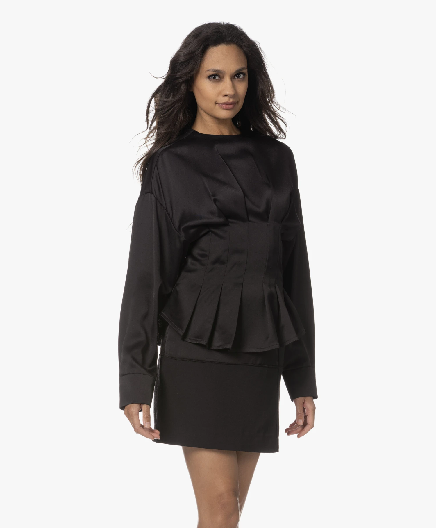 Róhe mixt eclectische stijlelementen tot een chic geheel. Deze glanzende zwarte blousetop valt op met verlaagde schouders, tapse vleermuismouwen en een geplooide taille met flatterend schootje. Gemaakt van zwaarvallende viscosesatijn, verrijkt met een royaal aandeel scheerwol.