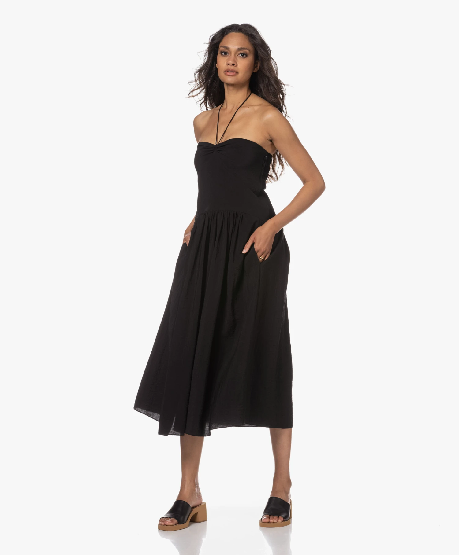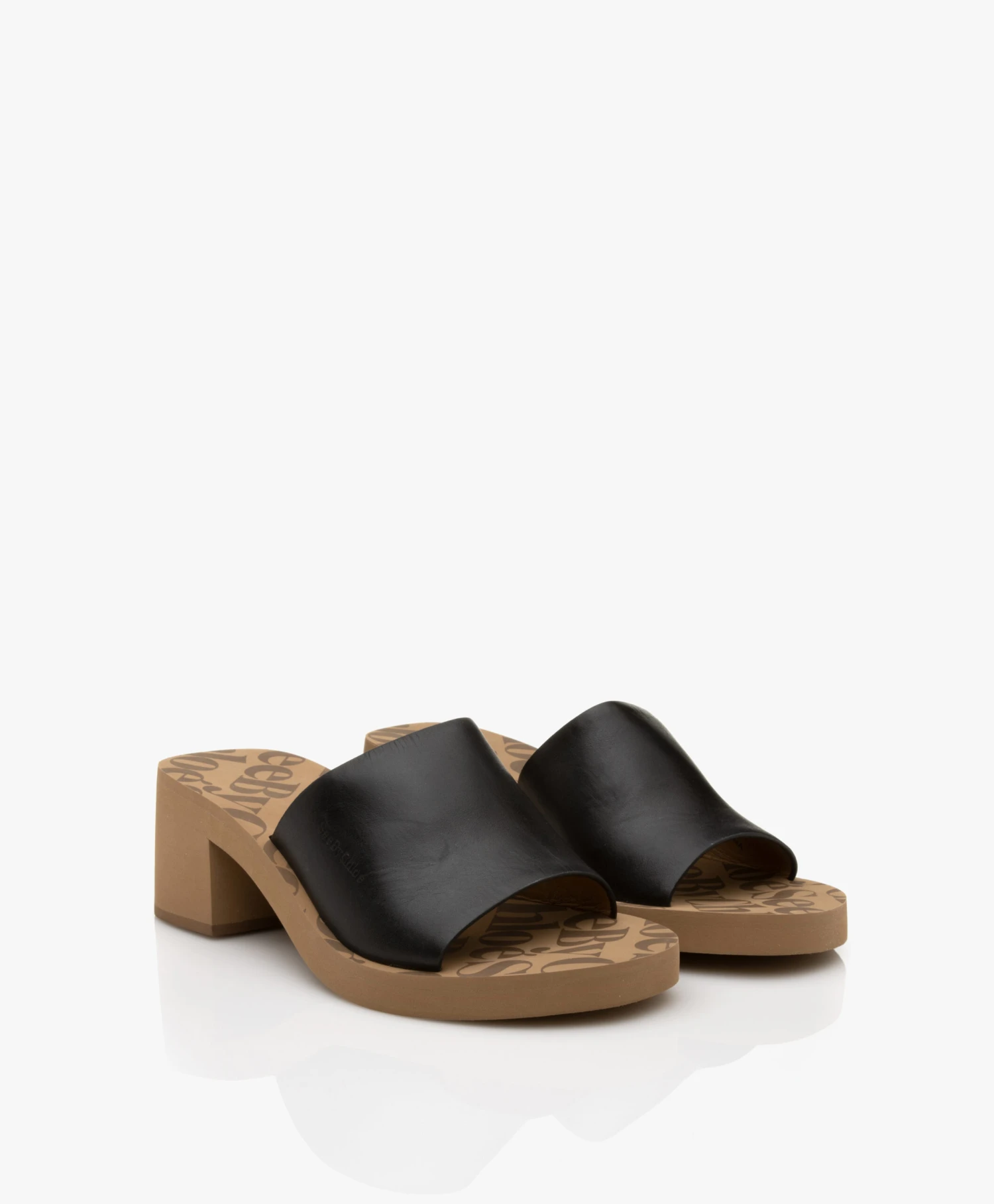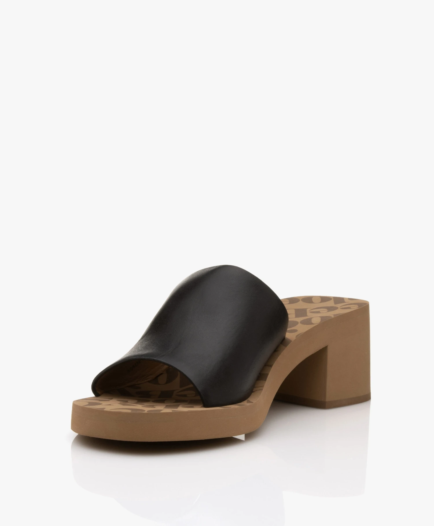 Hoe je een simplistische mule voorziet van karakter? See by Chloé doet dat door de zool van de Essie slippers met hak te versieren met een een all-over logoprint wat in sterk contrast staat met de minimalistische feel van de brede, kalfsleren band over de wreef. De rubberen zool is stevig genoeg om te snijden in de vorm van een blokhak zónder gewicht toe te voegen: want deze mules bieden verrassend lichtgewicht draagcomfort.