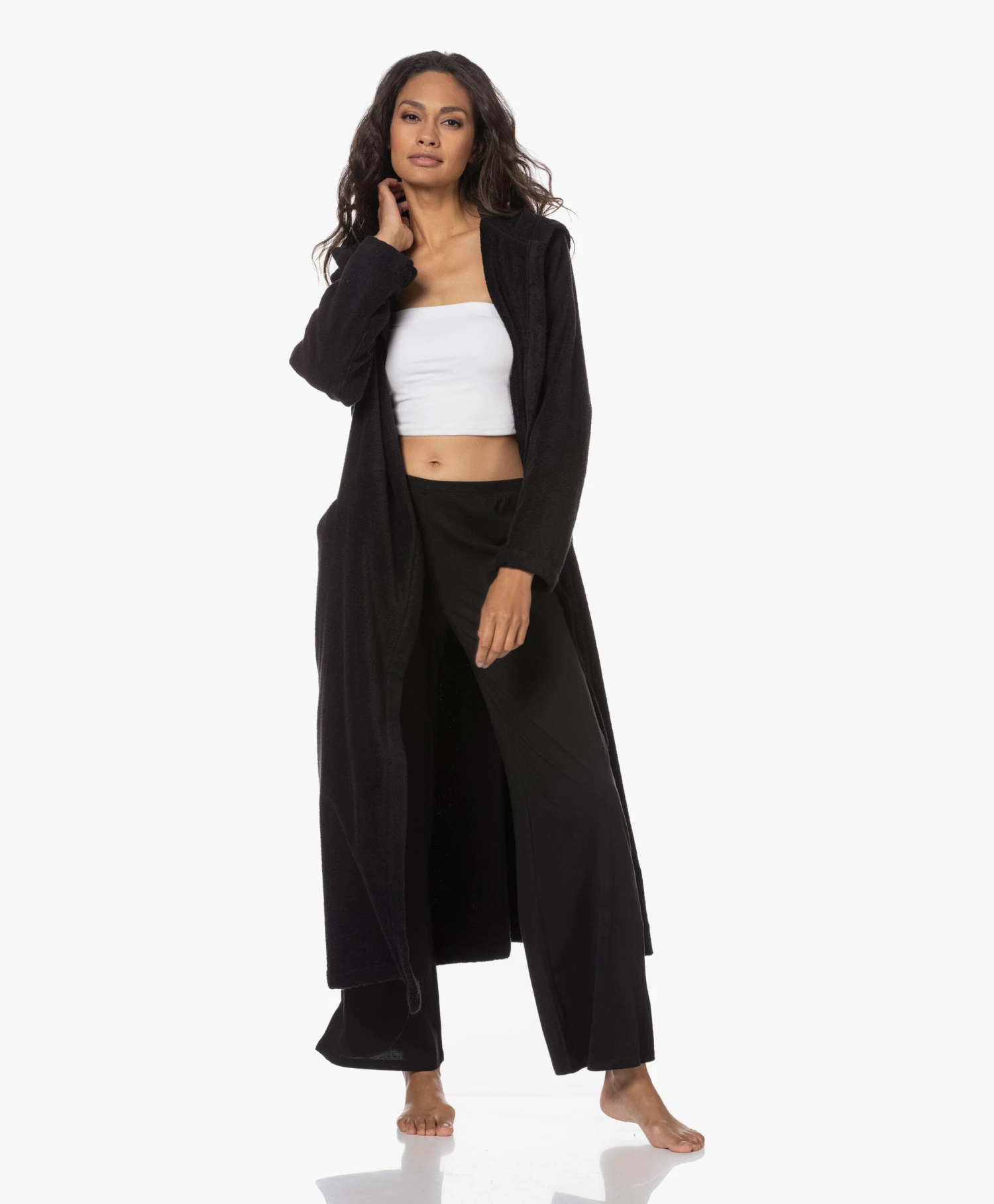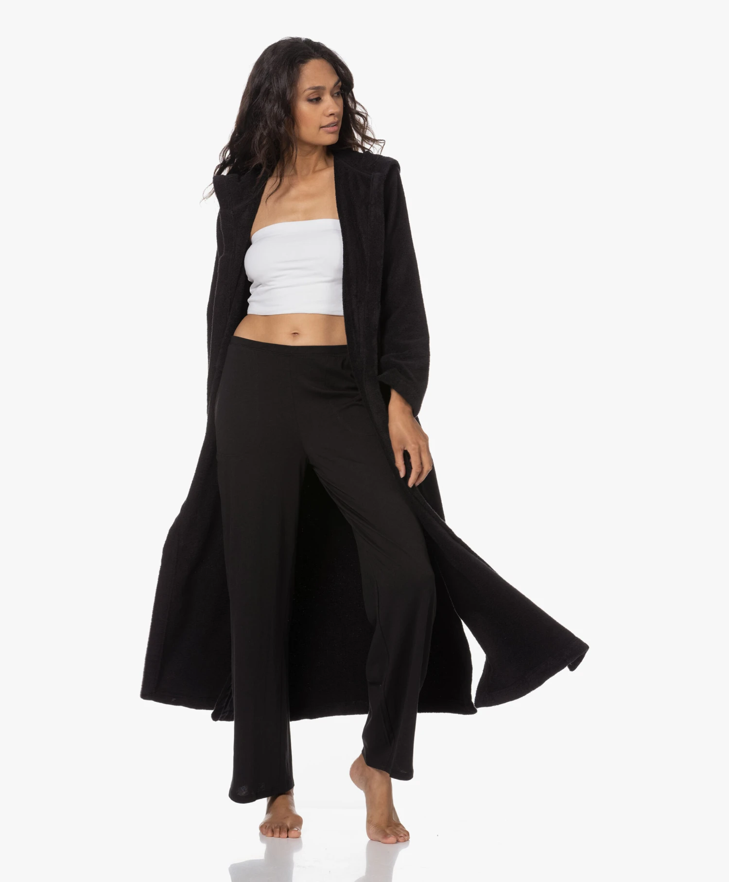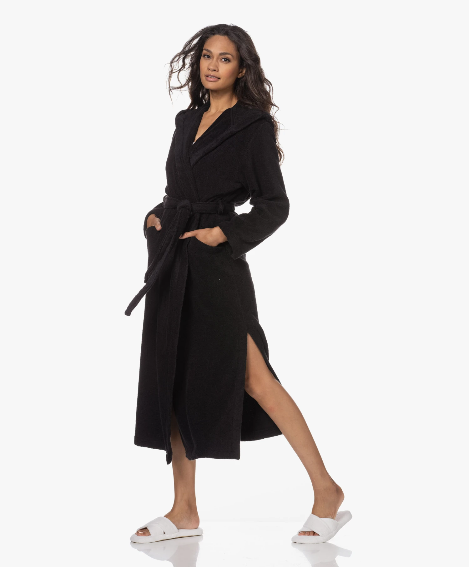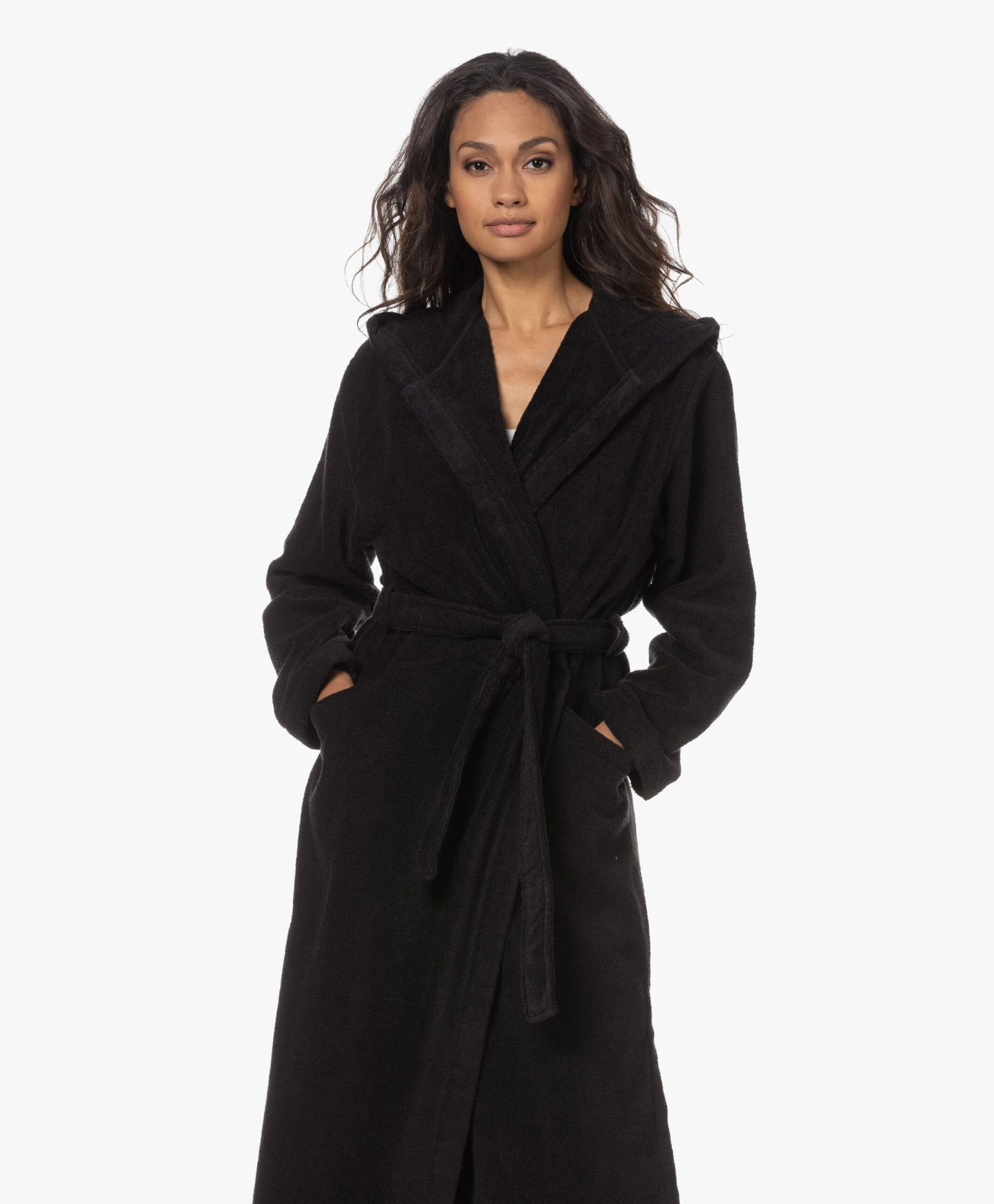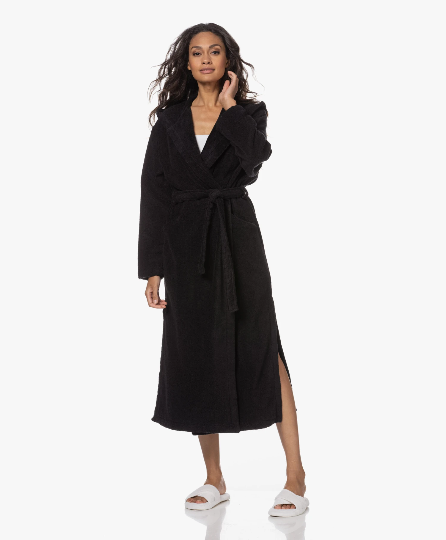 Creëer thuis een luxe spa-gevoel met deze diepzwarte Hamam Spa badjas van Skin die aanvoelt als second skin. De kuitlange badjas is gemaakt van een verfijnde French terry kwaliteit met geborstelde afwerking voor een ultra-zachte feel. De hoge zijsplitten zijn een vrouwelijke touch, terwijl de steekzakken aan de voorkant praktisch zijn. Door deze combinatie van comfort en stijl is dit een item die we maar al te graag aan onze wishlist toevoegen.