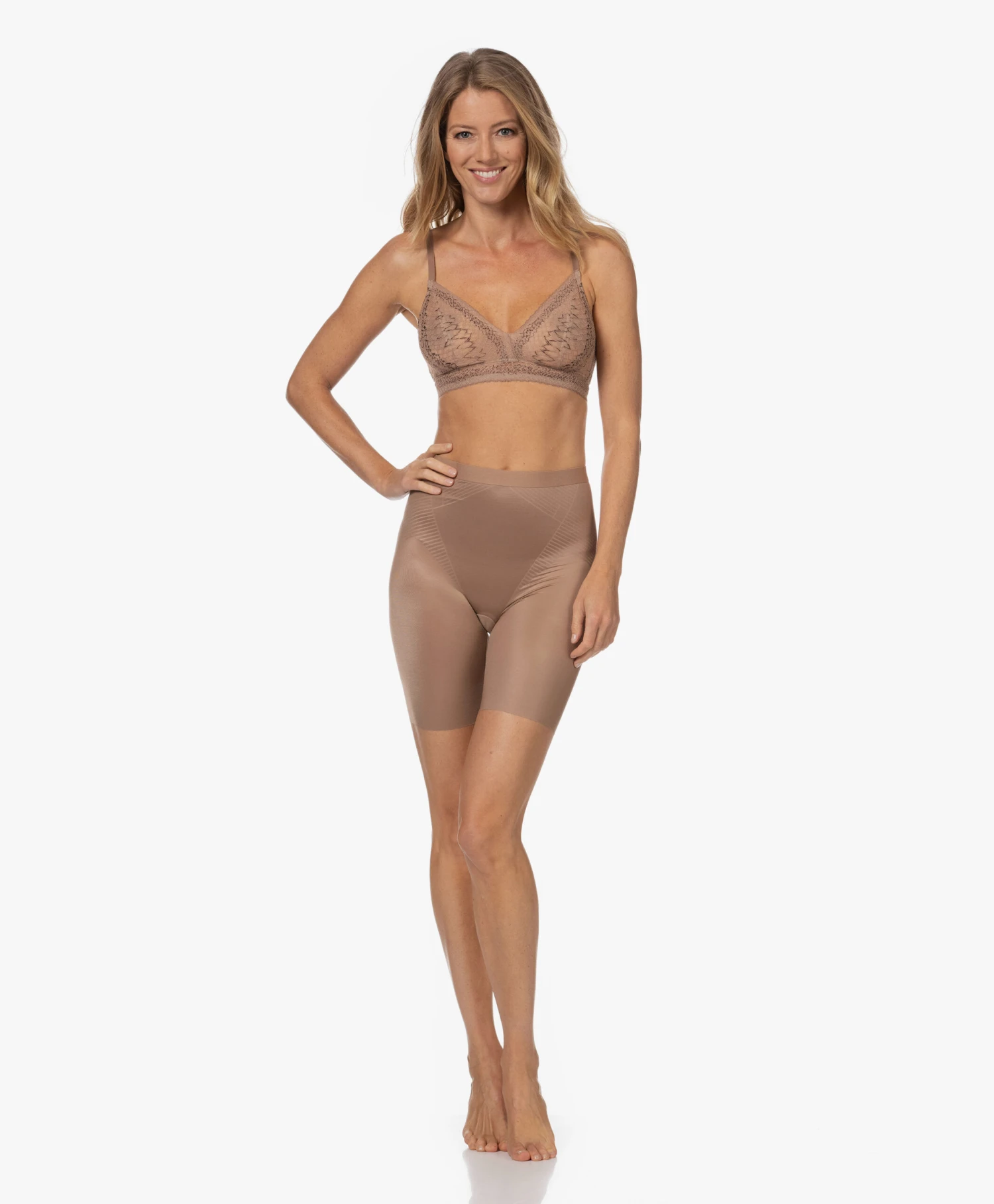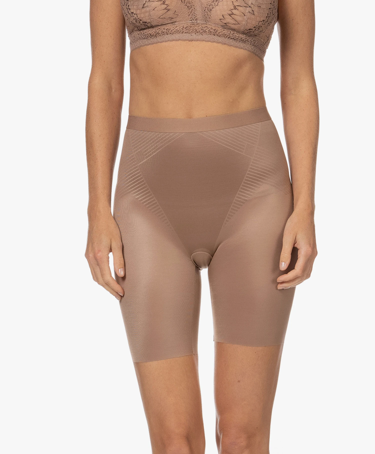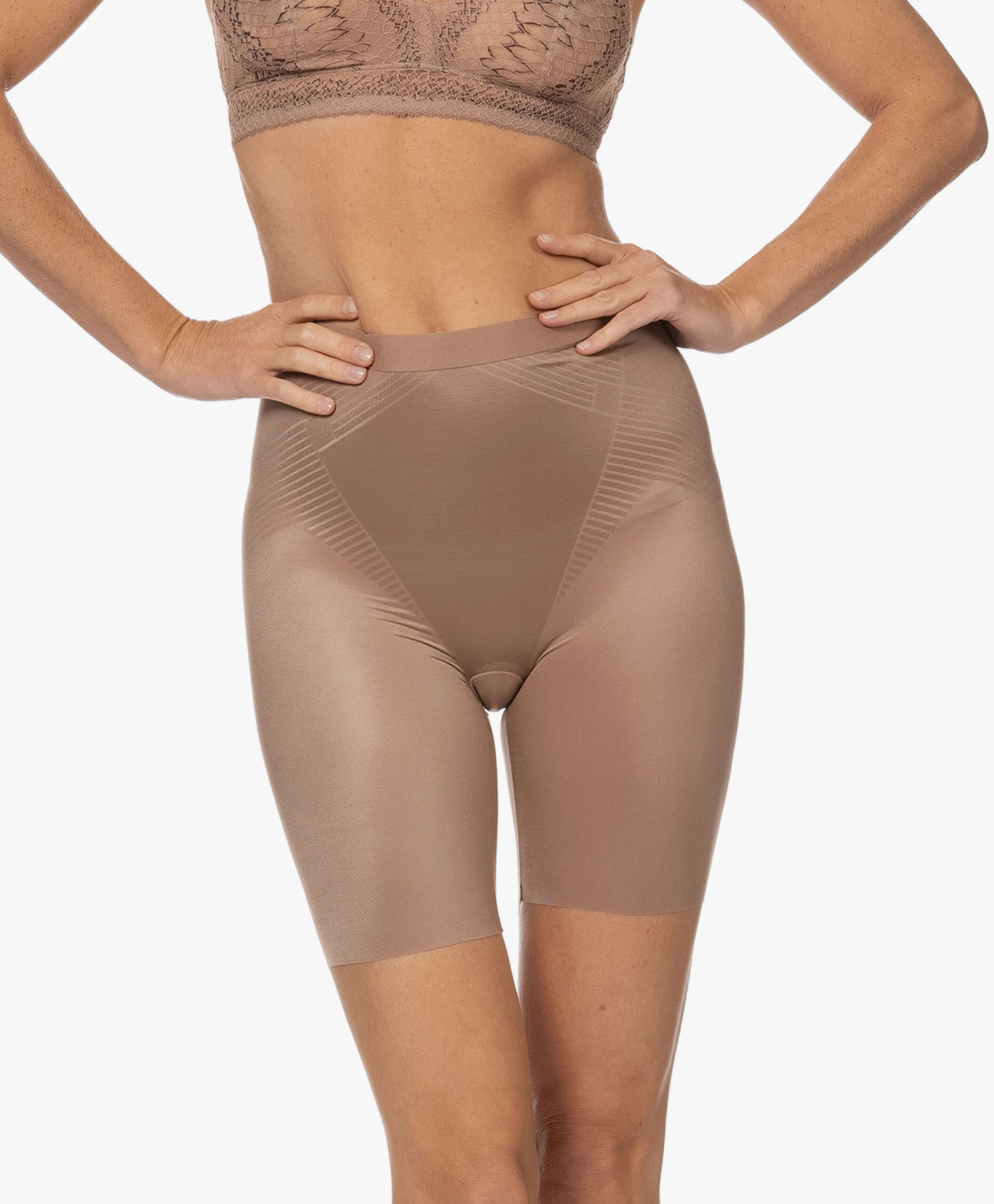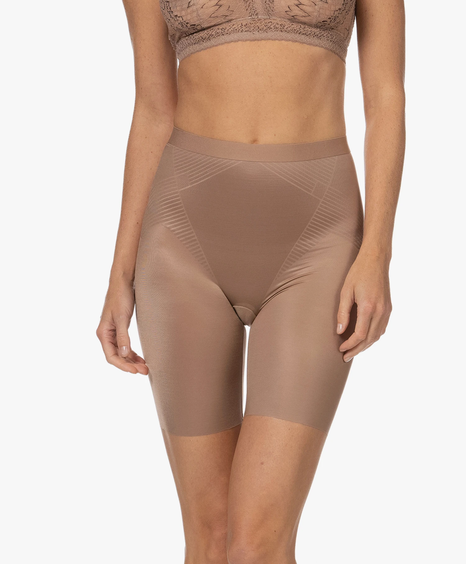 Voortbordurend op de best-selling Thinstincts collectie van SPANX brengt het merk de 2.0 lijn die zich kenmerkt door een innovatieve 3D printtechniek met gerichte shaping terwijl de voordelen van de ultra-lichte Thinstincts stof behouden zijn gebleven. Deze nude bruine, gladde short heeft een natuurlijke taillehoogte (die niet afzakt) en creëert een gestroomlijnd silhouet.