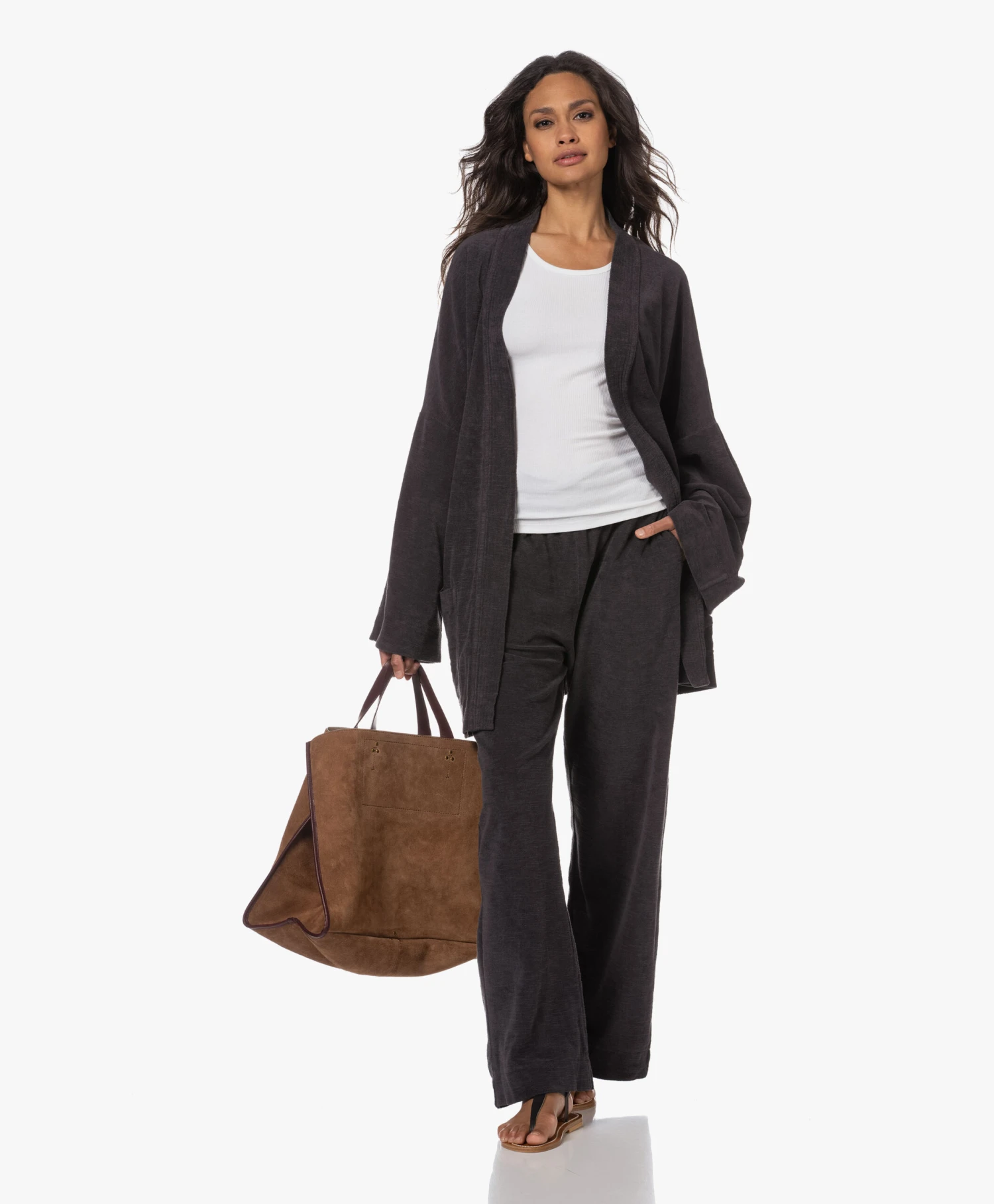 Verbazingwekkend, de hoeveelheid draagmomenten waarbij Speezys Amsterdam’s off-black kimono perfect van pas komt. Op reis, op het strand, tijdens relaxte dagen in en om het huis… De puur katoenen badstof heeft een verfijnde, licht onregelmatige structuur en een gladde binnenzijde die zacht aanvoelt op de huid. Er is ook een bijpassende trackpant met rechte wijde pijpen, mocht je wel oren hebben naar een stijlvolle Terry Suit.