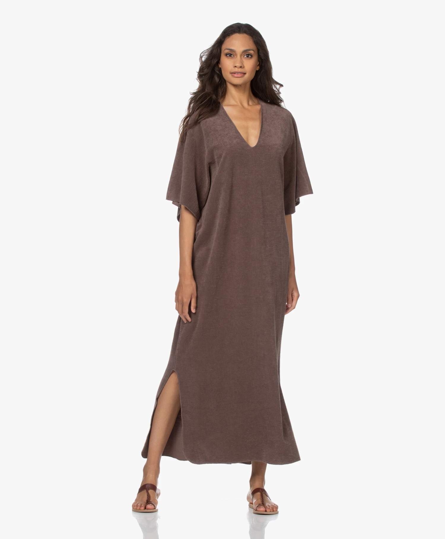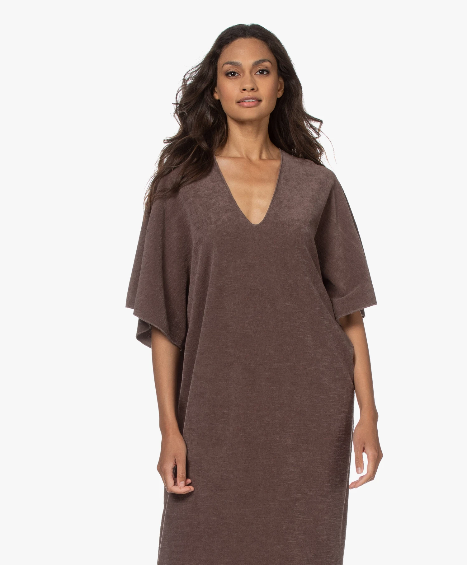 Het minimalistische ontwerp van deze donker taupe Speezys Amsterdam kaftan – van designer duo Patty Zomer en Britt Das – wordt benadrukt door de eenvoudige, doch eigentijdse belijning. De diepe V-hals, de aangeknipte mouwen en de overlock afwerking creëren een nonchalante insteek die geaccentueerd wordt door de ‘garment-dye’ en ‘stonewash’ technieken voor een unieke, love-worn kleur. Deze unisex kaftan is van gemaakt van puur katoen in een badstoffen terry jersey kwaliteit. Draag naar het strand, de sauna of ga voor comfort thuis.