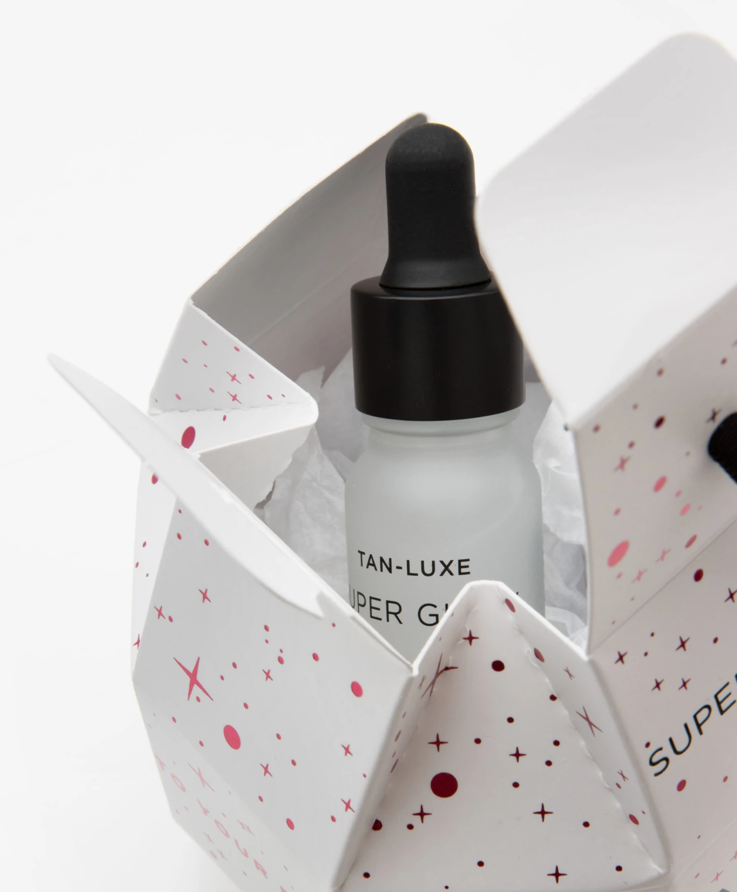 Het perfecte cadeautje voor in de boom – deze SUPER GLOW mini (10ml) van TAN-LUXE komt in een luxe, witte cadeauverpakking in de vorm van een kerstbal, gedecoreerd met roze sterren. Het hydraterende serum voor het gezicht met anti-aging voordelen biedt een geleidelijke bruining, terwijl het direct een stralende glow aan je huid geeft. De rijke formule met hyaluronzuur en superfood ingrediënten met antioxidanten heeft een collageen verhogende werking, beschermt tegen vervuiling en geeft de huid meer volume. PS: werkt ook perfect als primer onder je make-up!