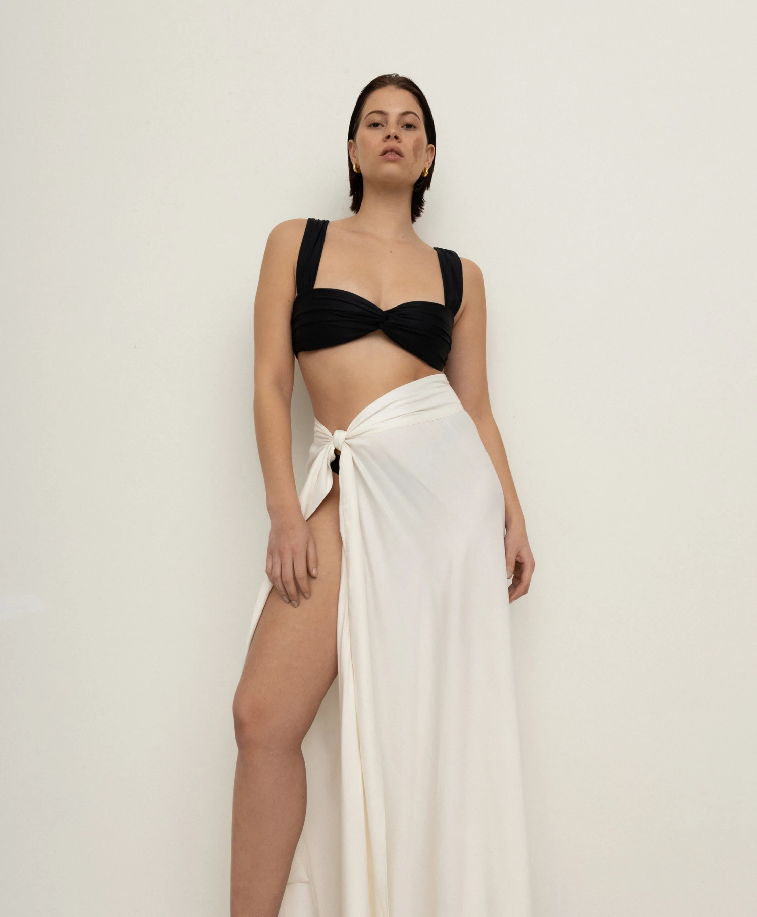 Zoals alles binnen de collectie van VIVEH, is ook de zwarte Azotic bikinitop ontworpen om je curves te omarmen – in dit geval vrij letterlijk. Het ontwerp met voorgevormde cups voorzien van een getwist detail, rimpelplooien langs de zijkant en zelf-te-strikken sluiting is allesbehalve standaard. De extra-brede schouderbandjes zijn niet alleen een bepalend onderdeel voor de stijlvolle look, ze zorgen ook voor voldoende ondersteuning.