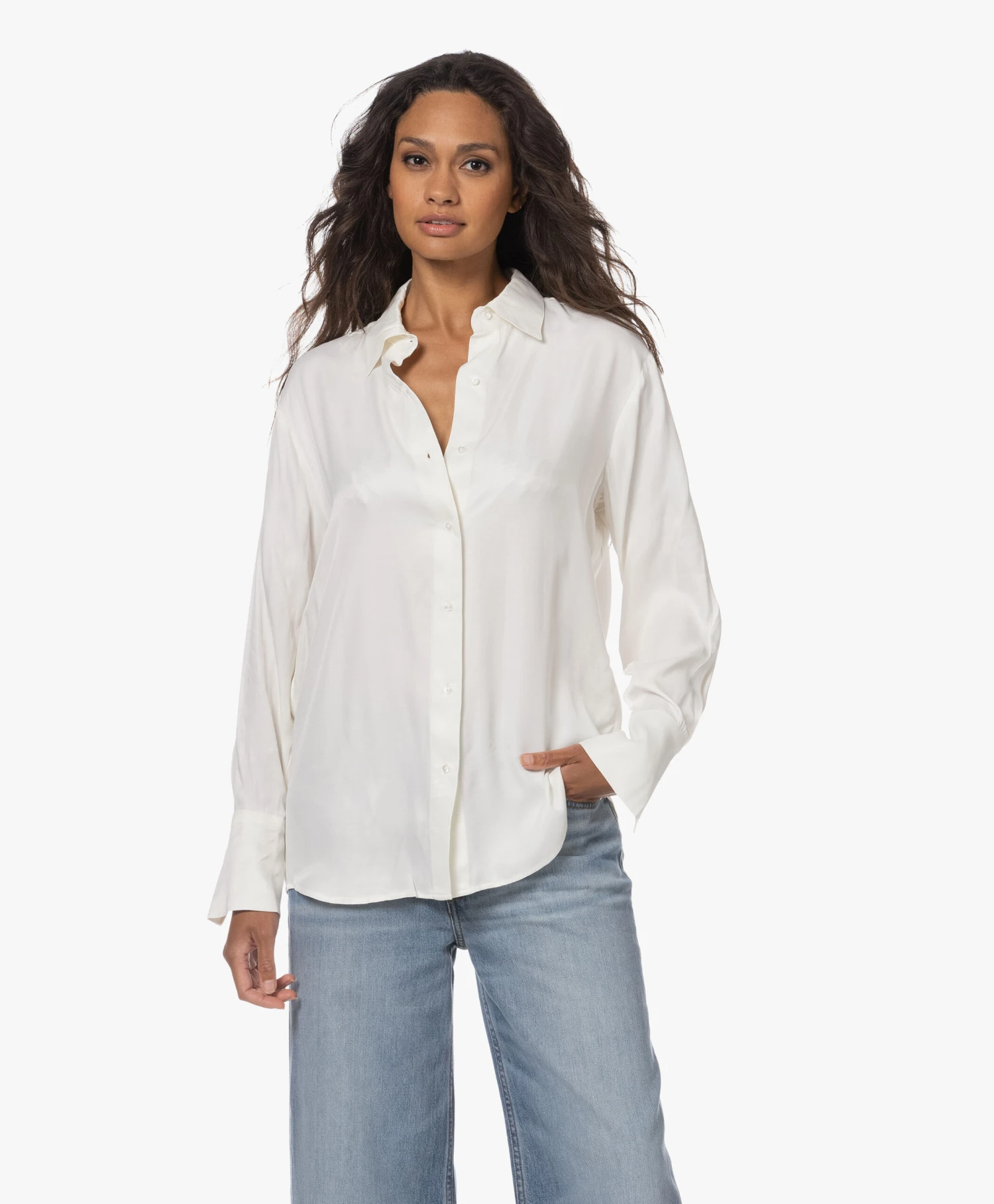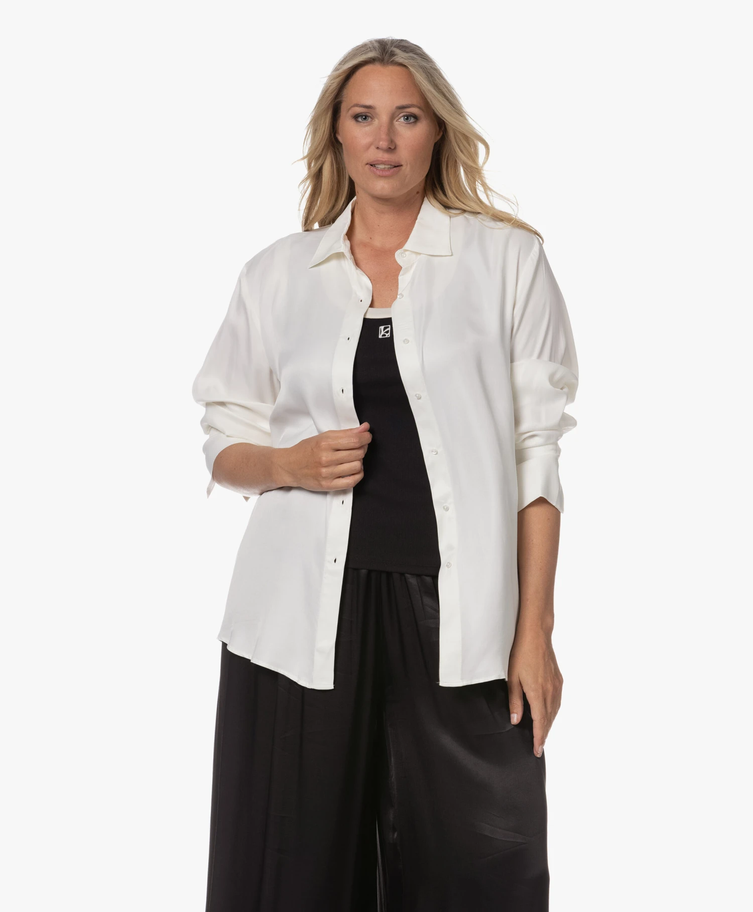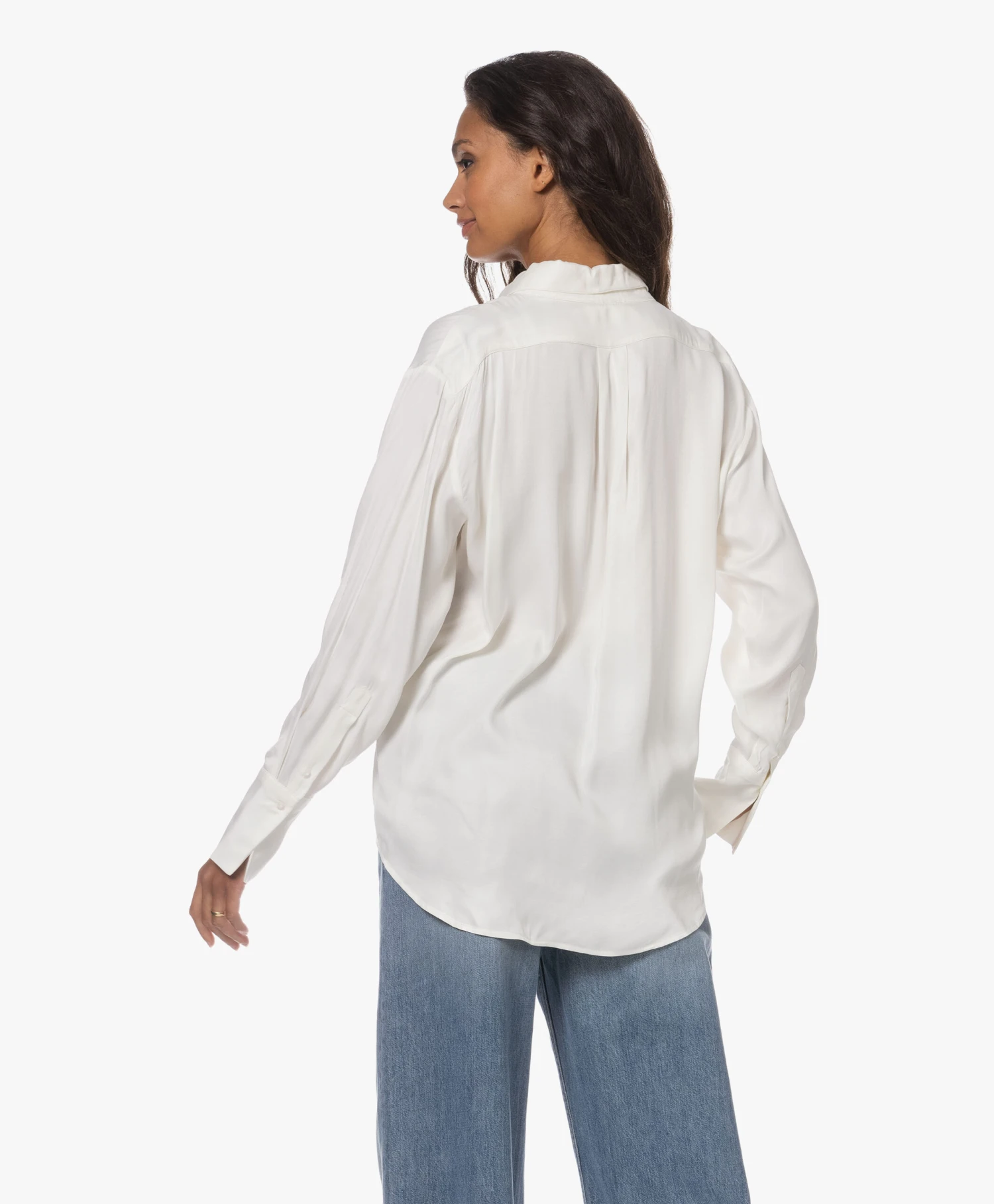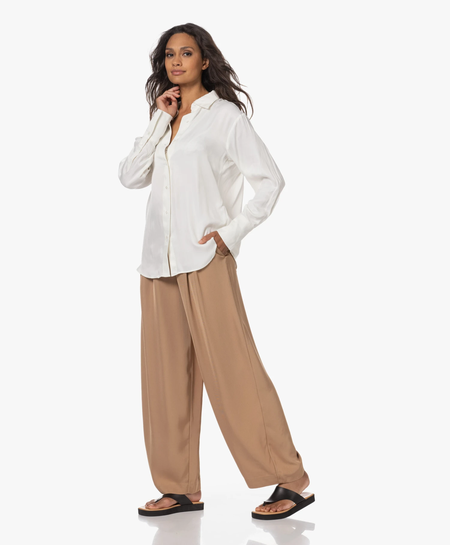 Dat het vieren van vrouwelijkheid bij VIVEH hoog in het vaandel staat is duidelijk te zien aan de rijke stoffen. Satijnen blouse Beryl is uitgevoerd in een rijke off-white kleur. Dat de semi-oversized pasvorm je vrouwelijkheid juist extra benadrukt is te danken aan de glanzende, soepelvallende satijn met viscose ecovero.