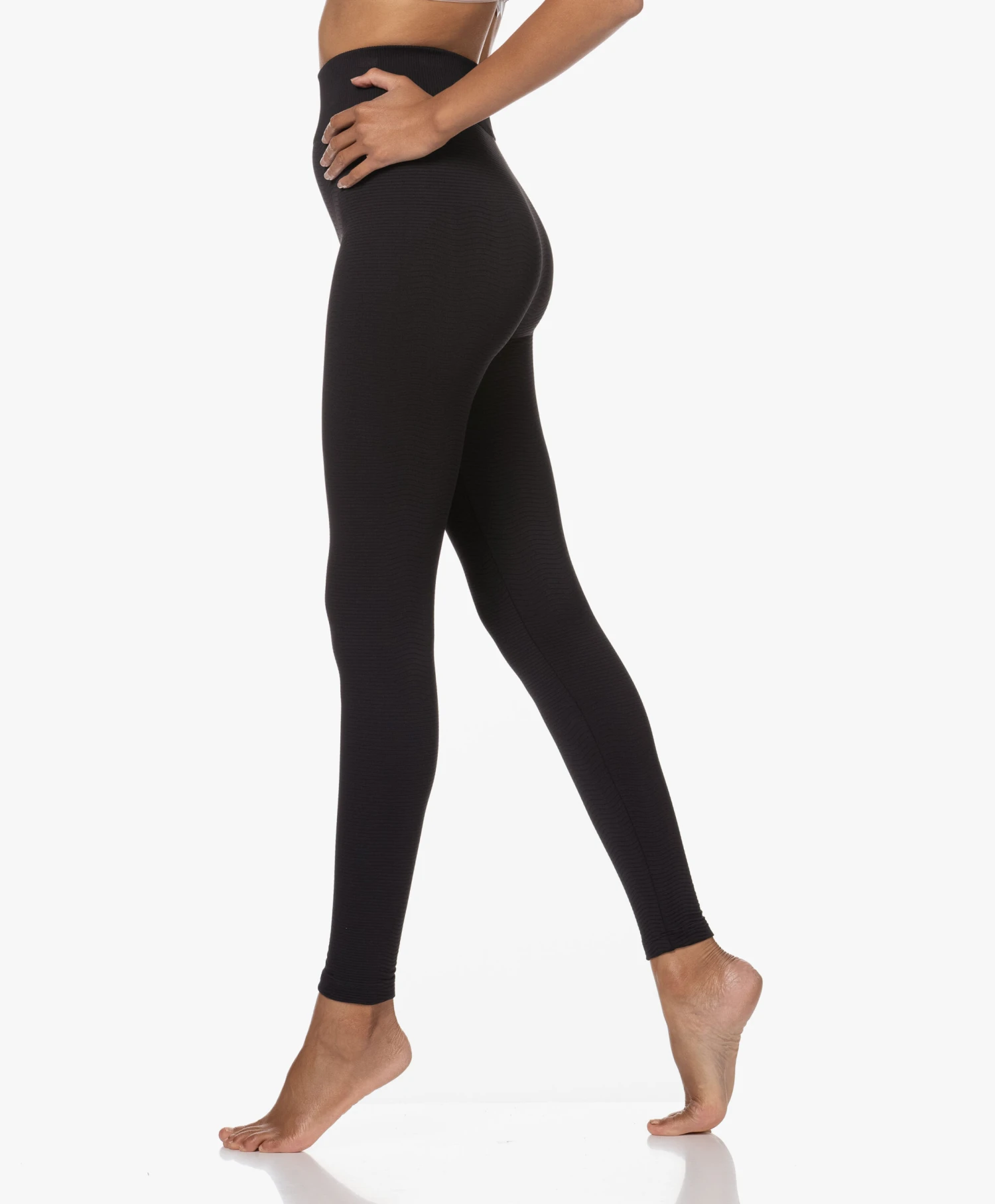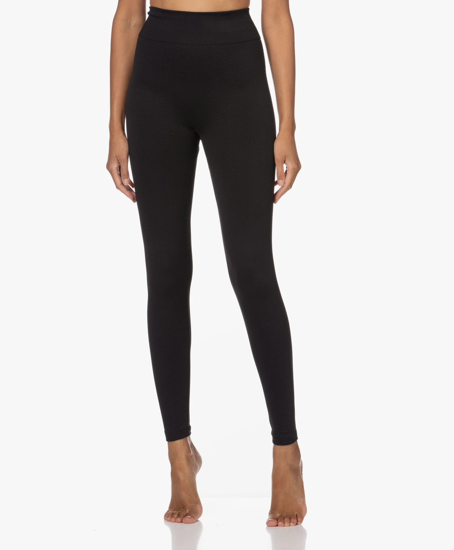 Leggings van Wolford, dé expert op het gebied van subtiel corrigerende bodywear, zitten als gegoten. Zwarte legging The Wellness is gemaakt van een stevige, flexibele stretch jersey met een op vorm gebreide golvende ribbelstructuur die op de juiste plekken lift en ondersteunt. De tailleband valt hoog en sluit goed aan.
