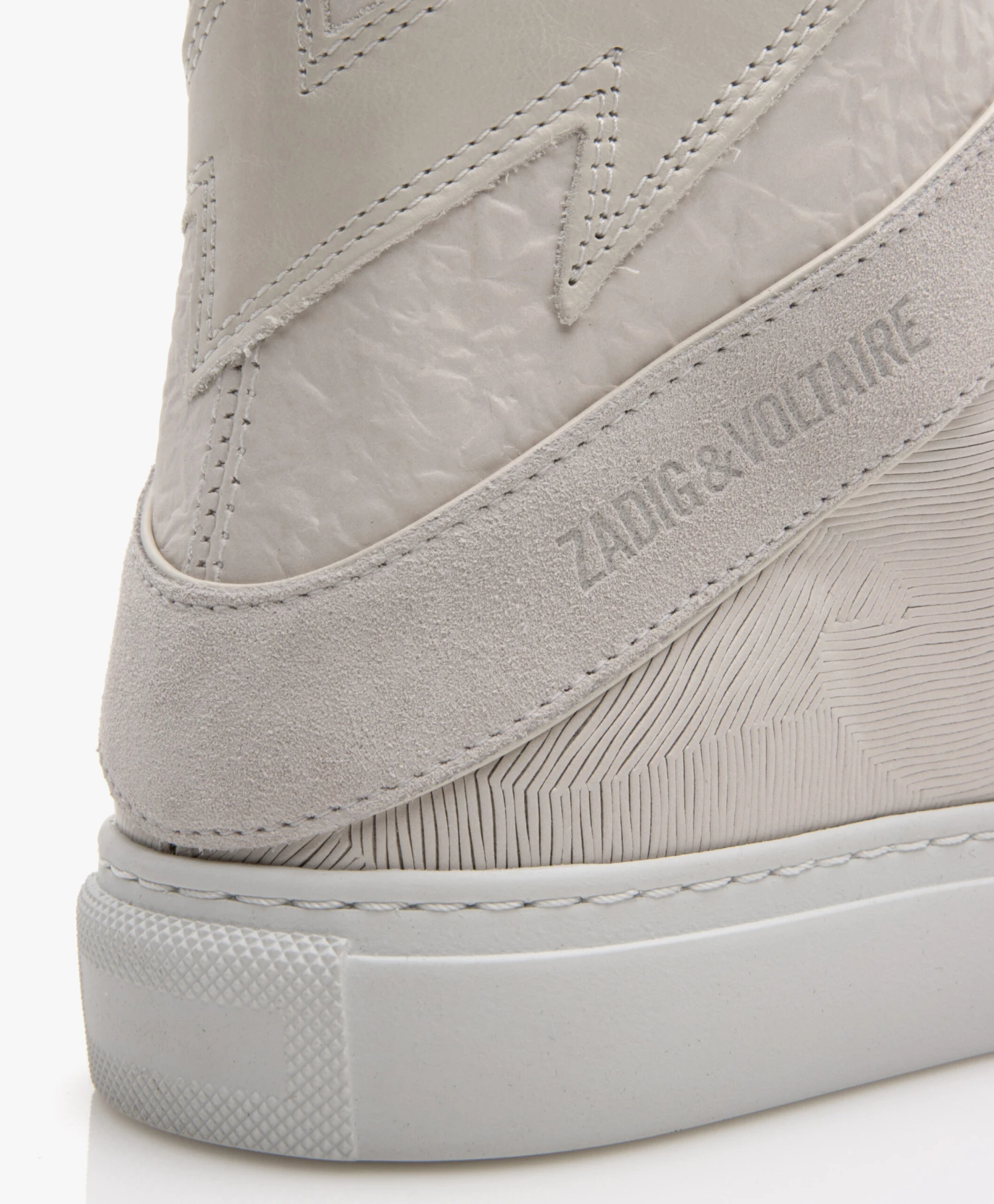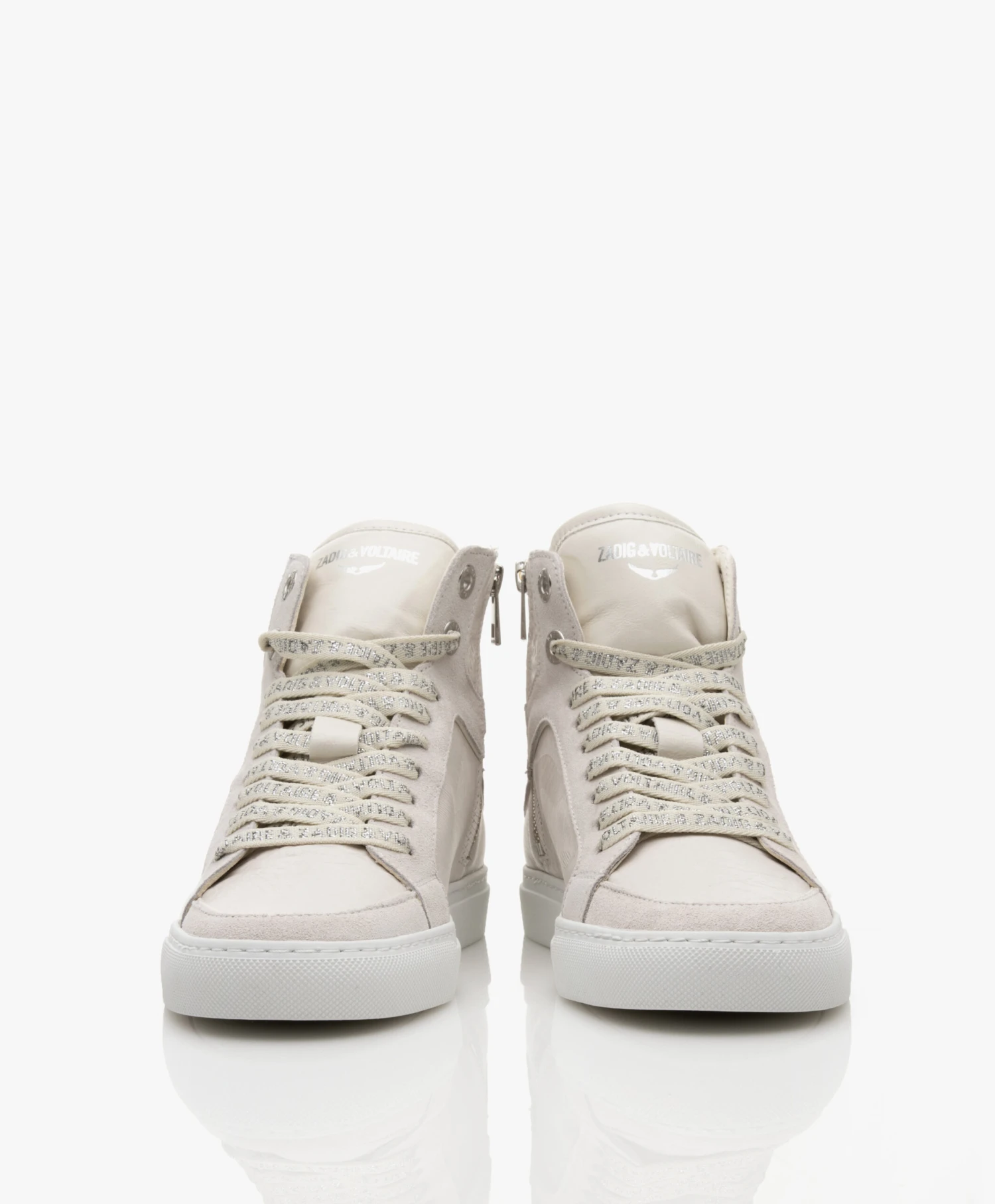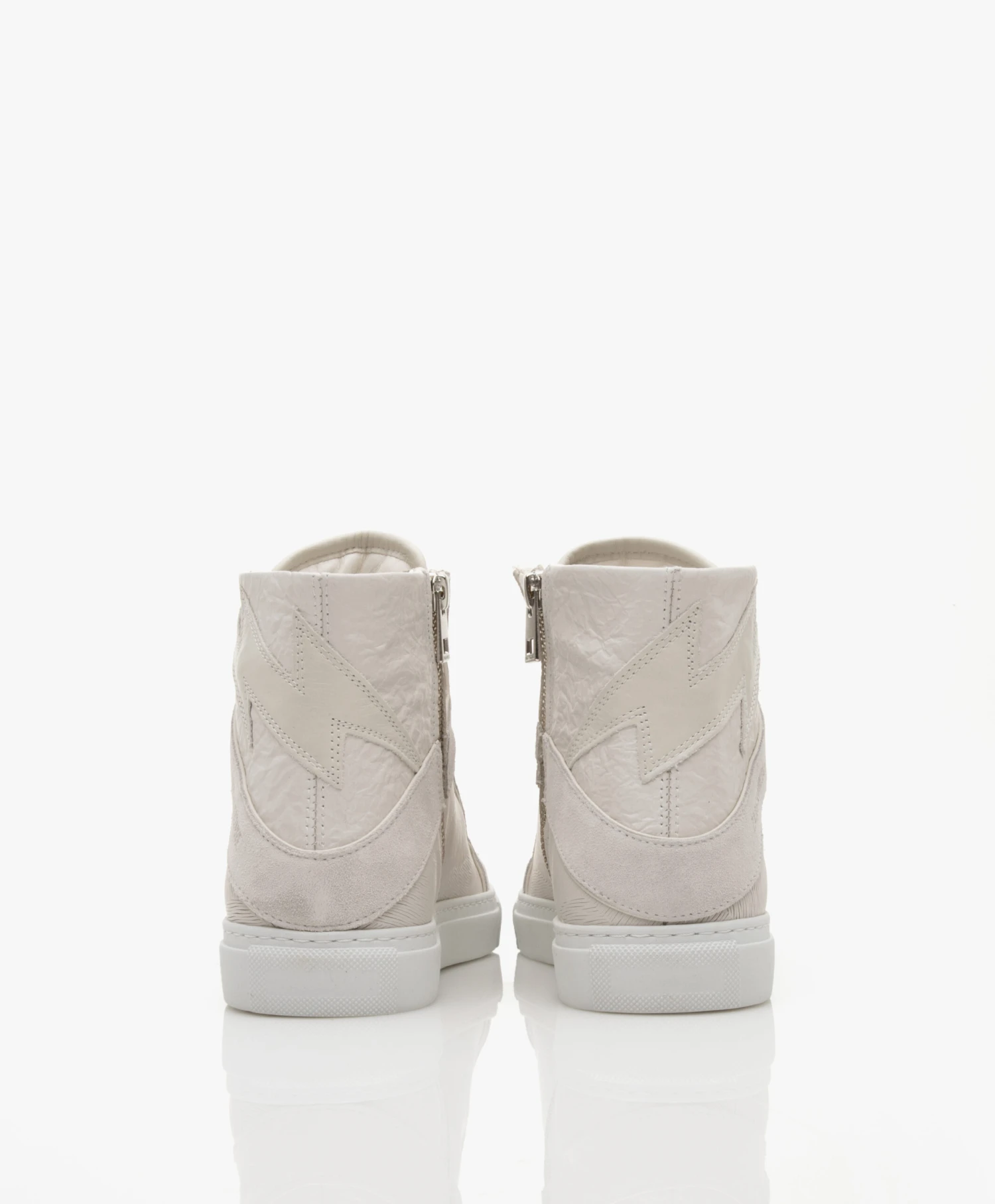 Deze high-top sneakers van Zadig & Voltaire tonen verschillende leerstructuren in dezelfde lichtbeige kleurtint voor een stijlvol geheel. Leer met een gekreukte finish, in een organisch gestreept patroon én zacht suède kenmerken deze rock-chique sneakers waarbij het iconische bliksemdetail aan de achterkant natuurlijk niet kon ontbreken. De veters met zilverkleurige merknaam vertegenwoordigen op stijlvolle wijze de merkidentiteit.