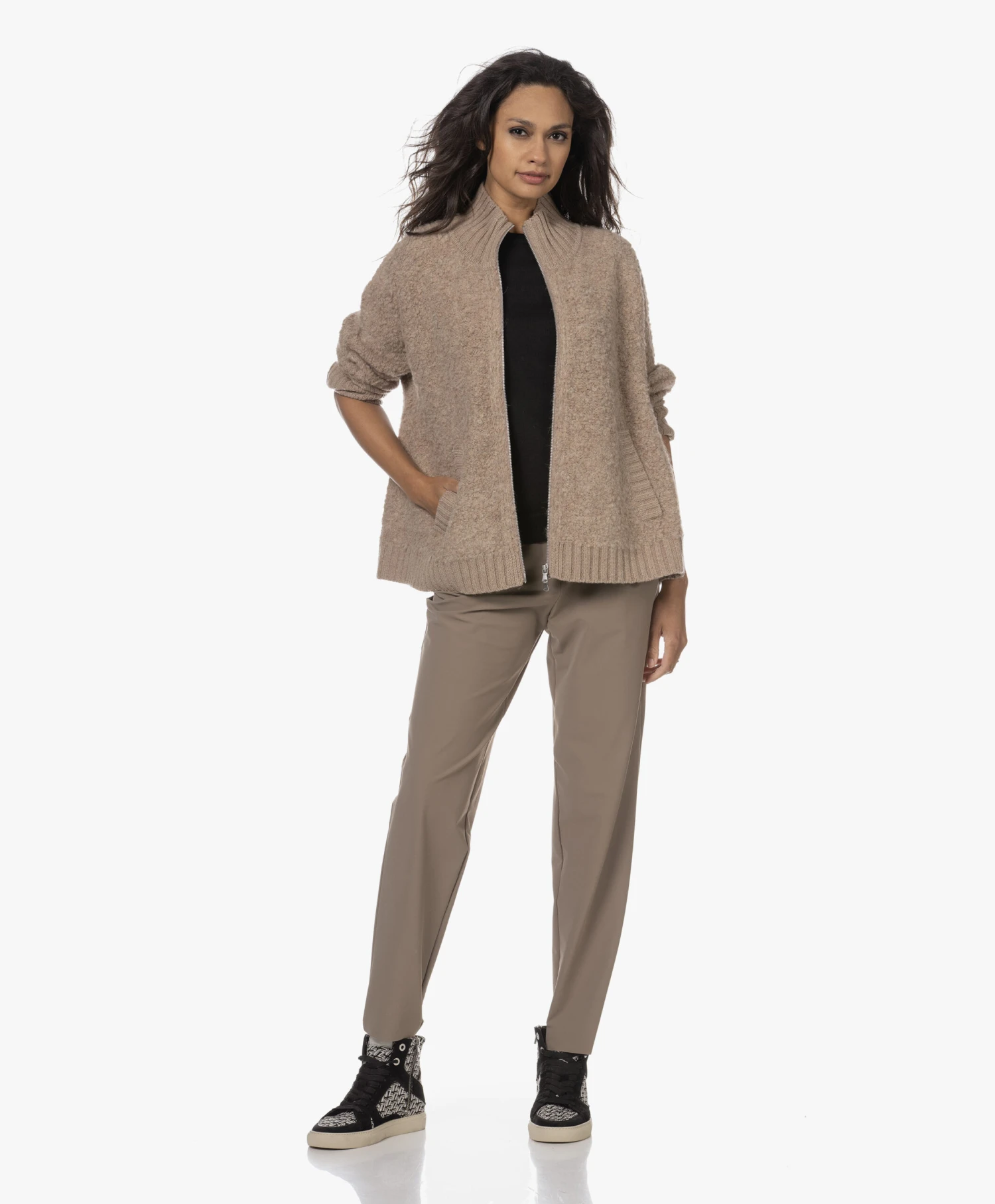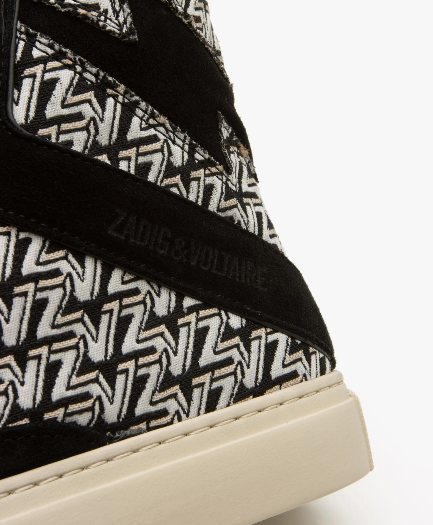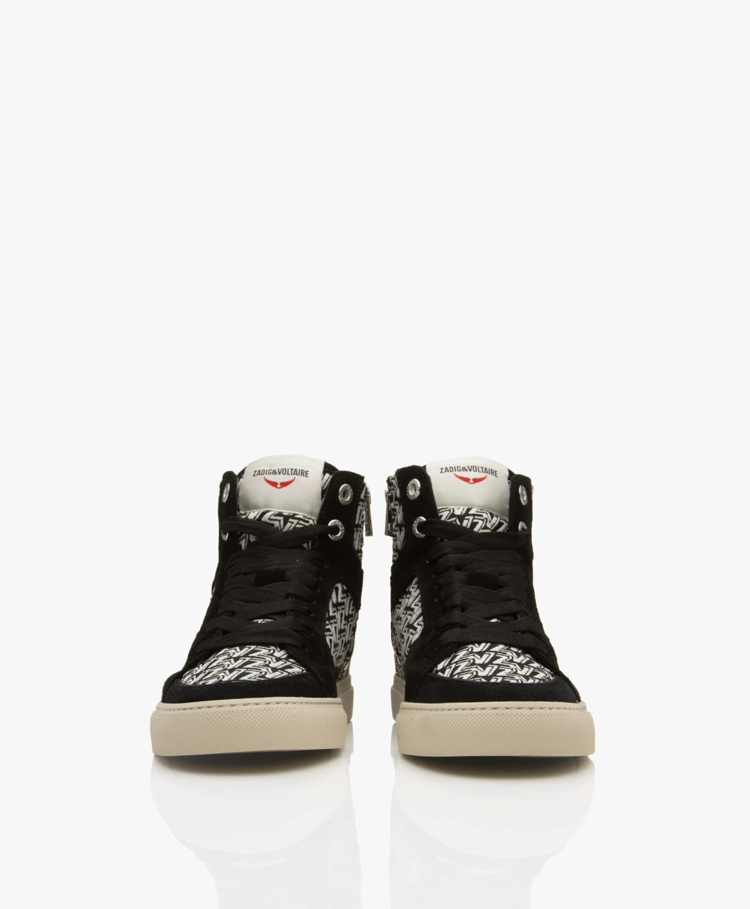 Deze high-top sneakers van Zadig & Voltaire tonen een all-over ZV-print in zwart, off-white en lichtgrijs en vertegenwoordigen daarmee op stijlvolle wijze de merkidentiteit. De zwarte suède details zijn een cool contrast. De sneakers zijn ontworpen met een iconisch bliksemdetail middenachter, een zilverkleurige rits en een wit label op de tong. Draag dit comfy-coole paar met alles – van een breezy jurk tot een T-shirt-en-denim combinatie.